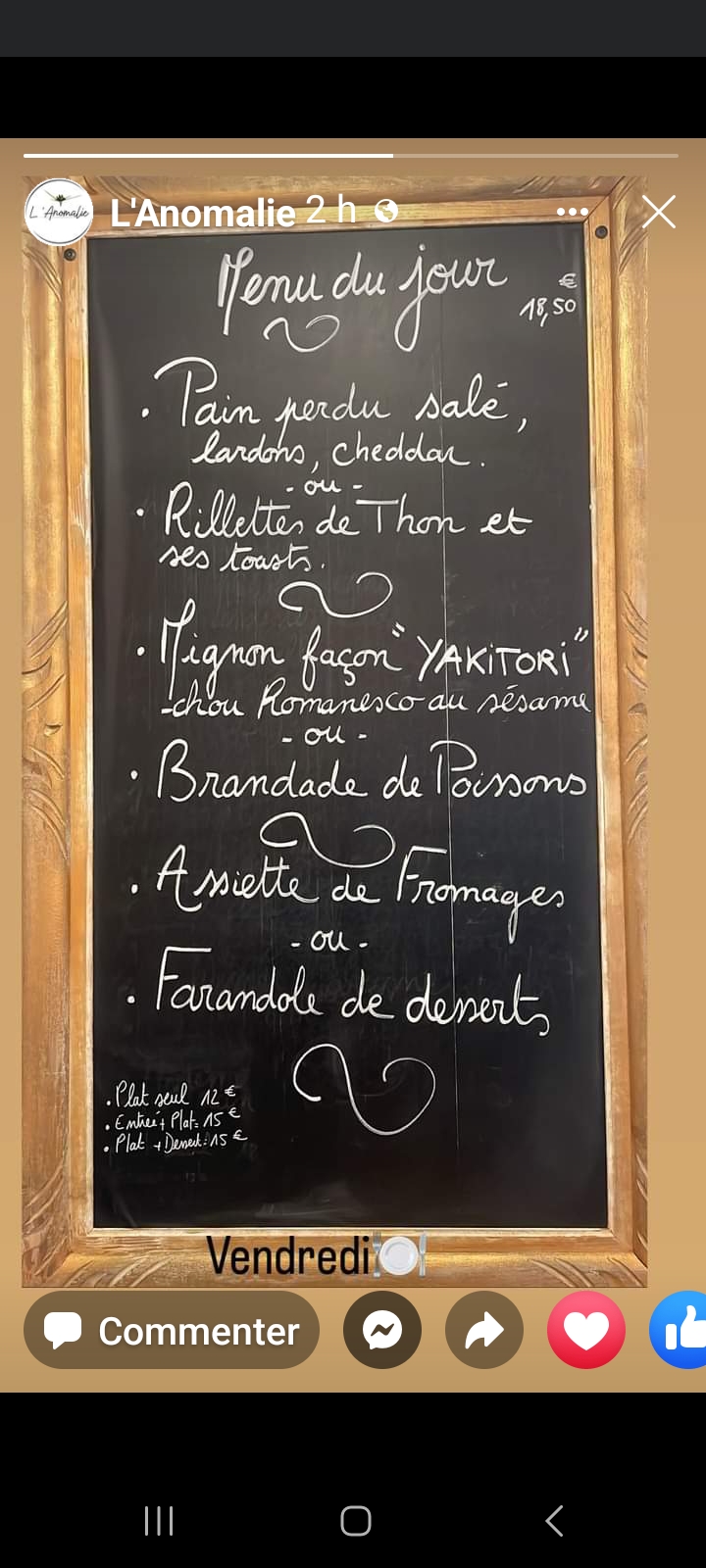 J’ai oublié de prendre l’entrée en photo 🤦🏽♀️ Très bonne découverte à L'Anomalie 🥰 Patronne et serveuse on ne peut plus agréables et la cuistot cuisine comme on ne fait plus. Tout est frais et fait maison. Jusqu’aux sauces servies avec les plats Je suis très exigeante sur les restau. Mais là je n’ai rien à dire de négatif On y retournera avec plaisir 🥰🥰