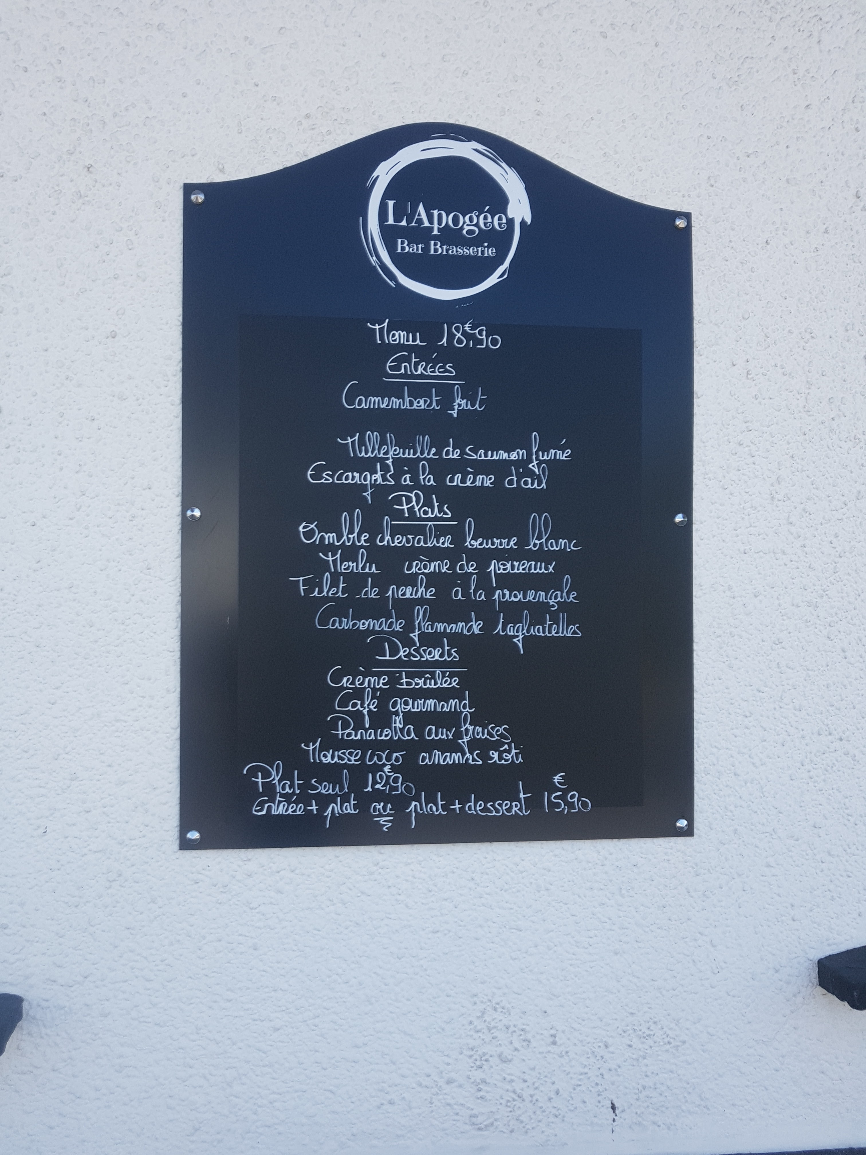 Posté le 22/06/2019 à 16:10" Ce restaurant n'est ouvert sous la direction actuelle que depuis quelques mois. La patronne nous a dit que tout le monde demande pourquoi l'Apogée ? et la réponse était qu'elle avait toujours voulu que son restaurant atteigne le point le plus élevé possible, d'où son nom. La décoration est simple et sans prétention. Musique - mais pas trop forte heureusement. Au déjeuner, le menu proposait 4 choix pour chaque plat (toujours un bon signe de ne pas avoir un menu immense) et était d'un très bon rapport qualité-prix. Fait intéressant, les 4 plats principaux étaient 3 plats de poisson et de dinde, ce que nous avons tous apprécié mais que nous avons trouvé courageux dans un pays qui aime sa viande. Nous avons tous trouvé nos choix très savoureux. La crème brûlée avait un dessus croustillant et le café gourmand et l'assiette de fromages étaient tous deux généreux. Hautement recommandé. Merci, bon courage et à la prochaine ! "