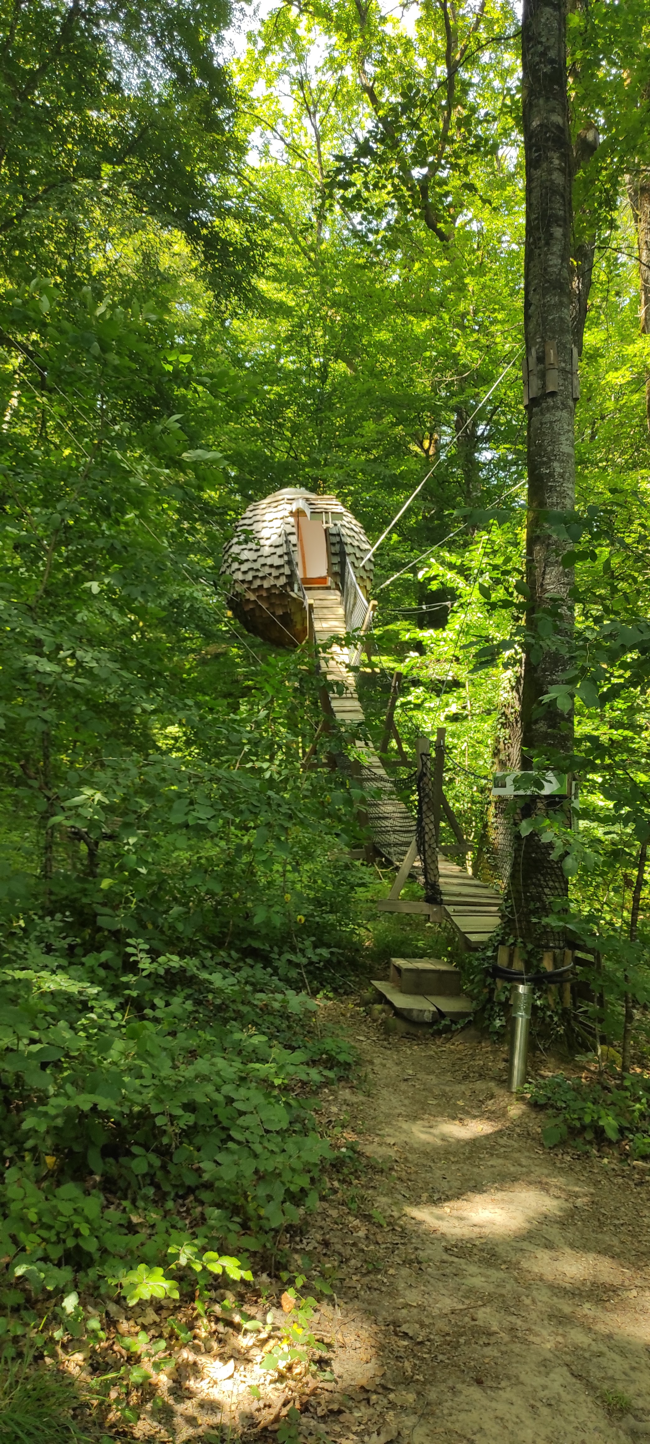 Déjeuner en famille (fête des pères). Cadre très agréable avec belle vue sur une vallée, nous étions en terrasse sur une terrasse couverte, ce qui a permis d'être à l'air en ces jours caniculaires. Carte restreinte (2-3 entrées et plats) car uniquement des produits frais. Choix entre 1 poisson ou 1 viande. Belle présentation des assiettes. Possibilité de visiter le parc avec des cabanes (logements insolites) après le repas.