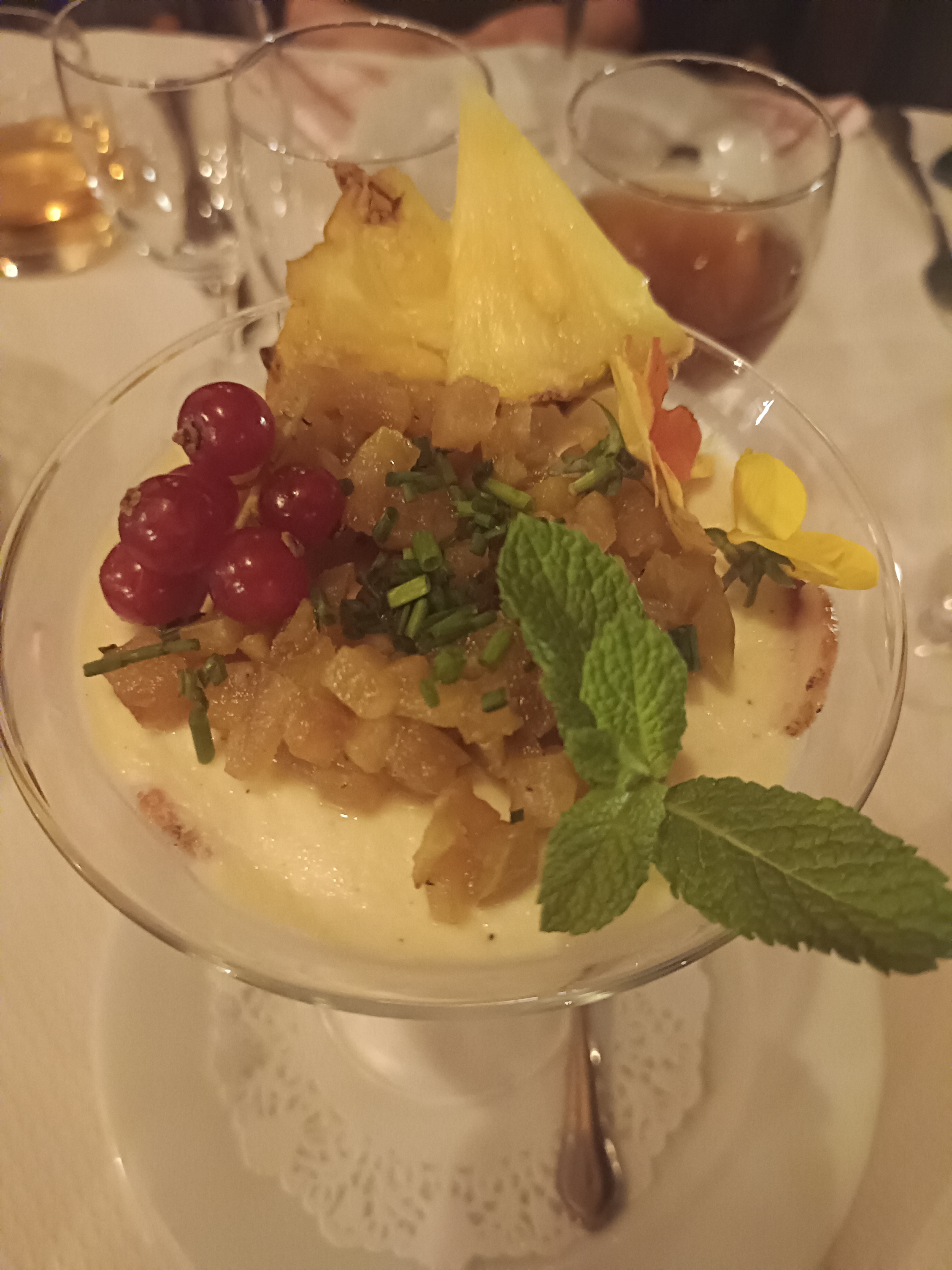 Excellent restaurant petite verrine d'accueil en attendant l'entrée j'ai trouvé ça génial ainsi que les invités.Assiette copieuse jolie présentation tout ce mange même les fleurs. Et pour finir le cuisinier vient nous saluer et demander notre avis.