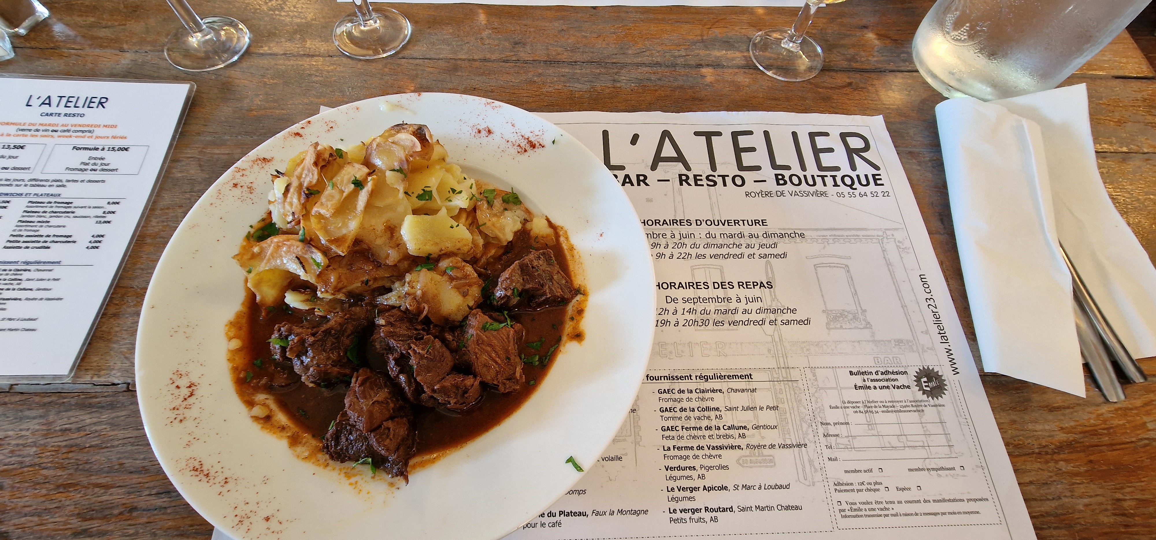 Si tu vas visiter Vassivière il te faut impérativement t'arrêter a l'atelier c'est le voyageur Creusois sur youtube qui te le dis, tu seras pas déçu, ambiance, cuisine et bain de bière 🍺 garantie.. Bel établissement mérite une étoile.