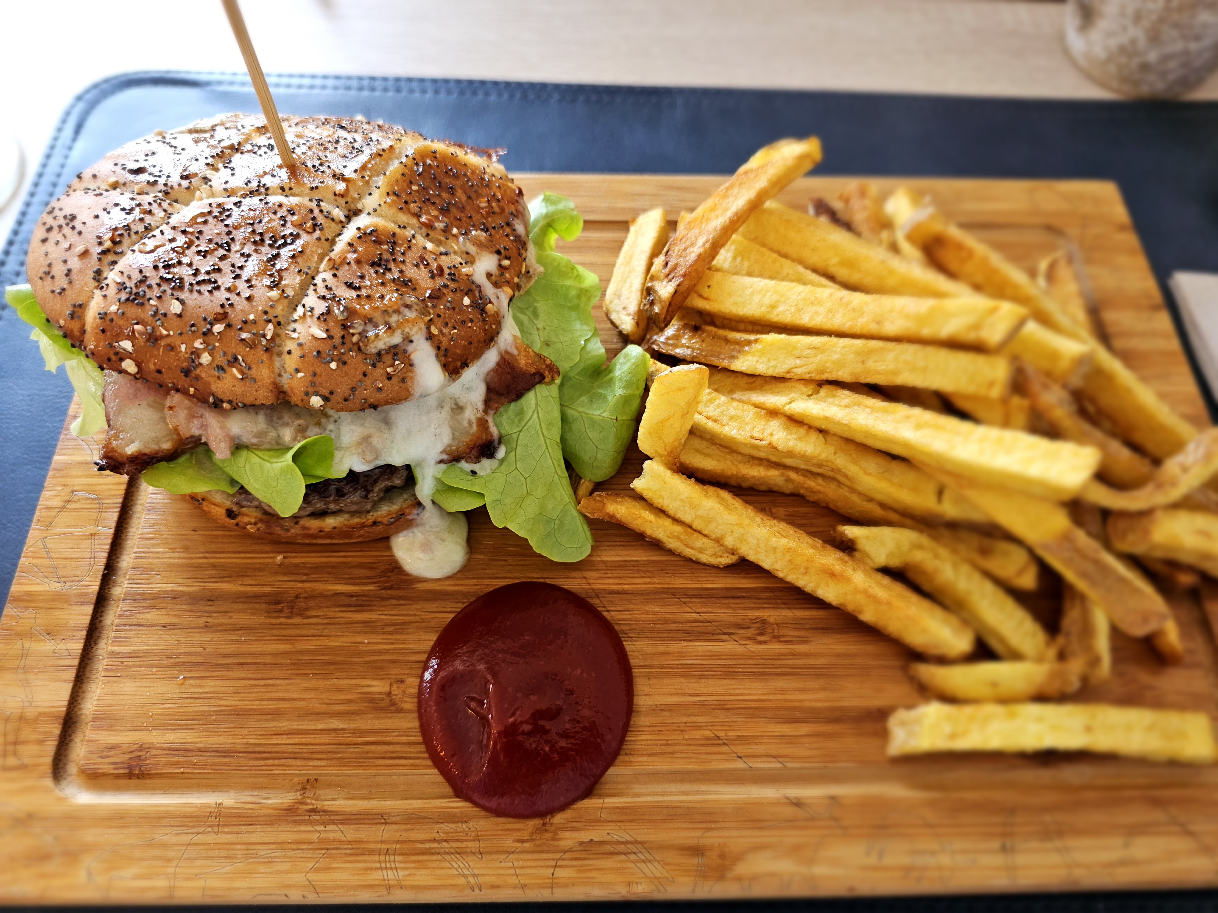 Nous étions en chambre d'hôte dans le village et nous voulions donc trouver un restaurant pas trop loin. Le restaurant est de l'autre coté de la route c'est vraiment pas convivial. le burger avait pas de saveur le fromage à l'intérieur était pas fondu et les frites nous pouvions les compter sur les doigts d'une main. Le camembert rôti était pas du tout chauf nous avions demandé de le refaire chauffer. Vraiment très déçu de ce restaurant. nous aurions du nous rendre directement à Pont Audemer.
