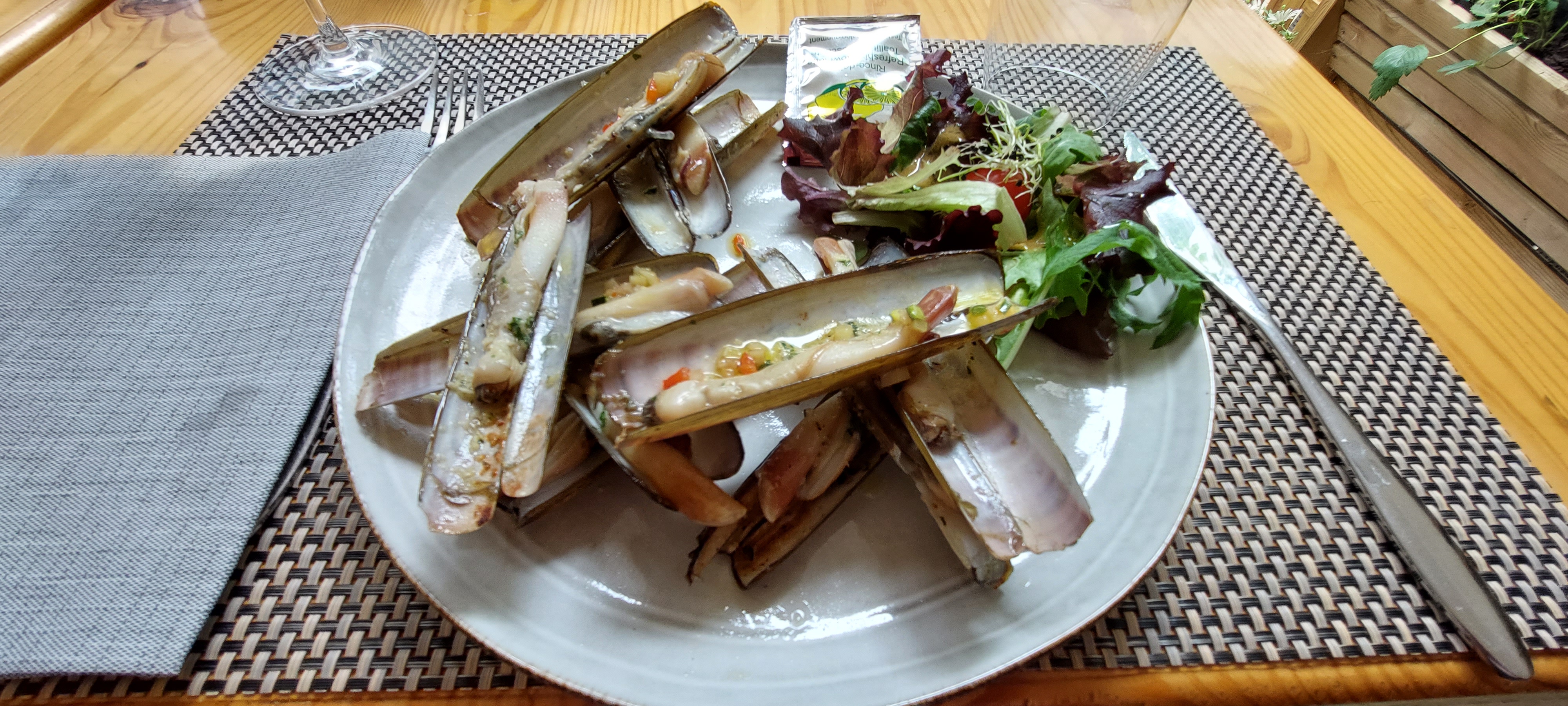 Excellent déjeuner. Au bord de l’étang du Ponant Entrée+plat à 34€ avec couteaux en persillade et parillada de poisson Délicieux ET très copieux