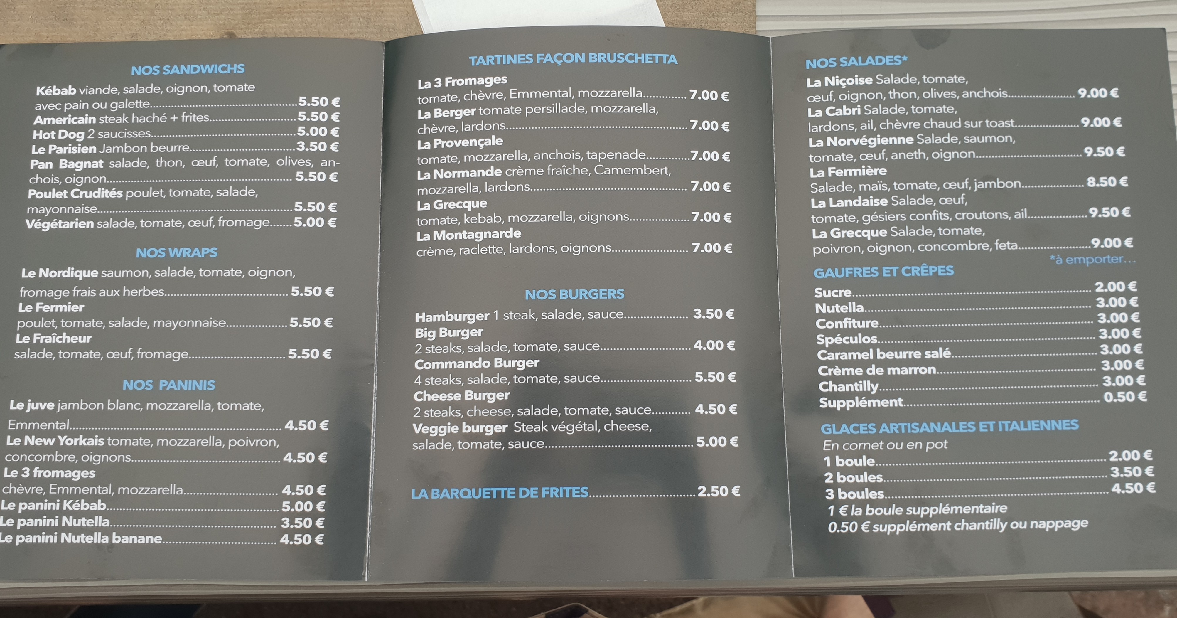À FUIR ! UN RESTAURANT QUI NE PREND PAS LA CB !!! C’est afficher en petit sur la carte Hygiène pas au rendez-vous ! La seule chose positive, c’est que les moules étaient bonne… dommage que se soit le seul + Quand vous prenez un Burger, les sauces à côté sont en suppléments et sont à 3€ L’attente est très longue +1h. (nous sommes au mois de juillet me direz-vous, mais les tables n’étaient pas toutes occupées). Emplacements serrés avec les autres clients En relisant les commentaires, je peux confirmer que nous devons effectivement passer par les cuisines pour accéder aux sanitaires (un peu borderline) Je recommande vivement pour les plus courageux, de retirer de l’espèce avant d’y aller (les distributeurs se trouvent à près d’1km à pied)