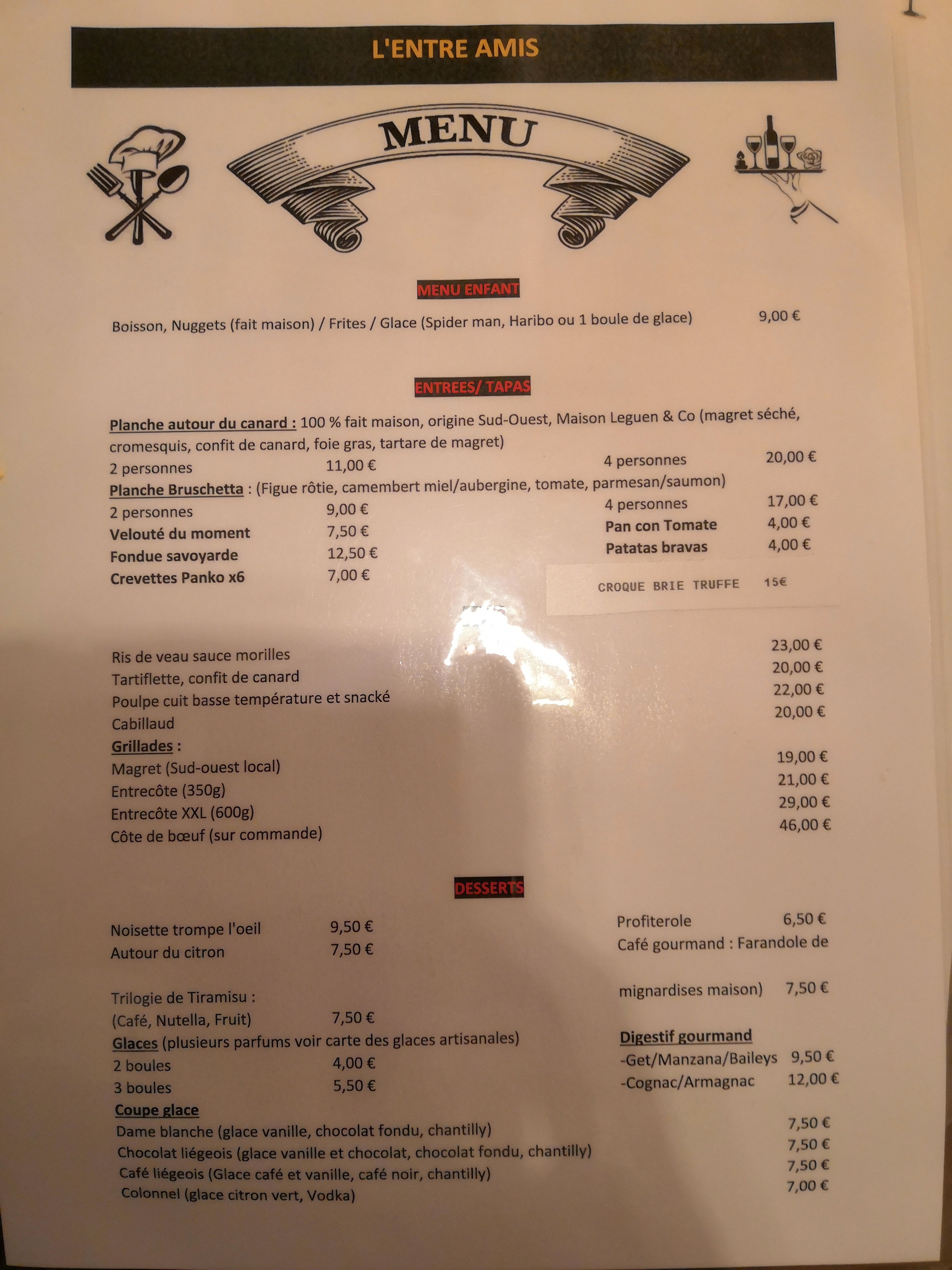 Quel plaisir ! Nous avons (déjà) testé 2 fois L' Entre-Amis, une adresse incontournable à Saint-Lys : restaurant convivial, chaleureux avec une très belle décoration ! Bravo à vous, les tapas sont exquis et variés. En couple, en famille ou entre amis ce restaurant mérite d'être connu et reconnu :)