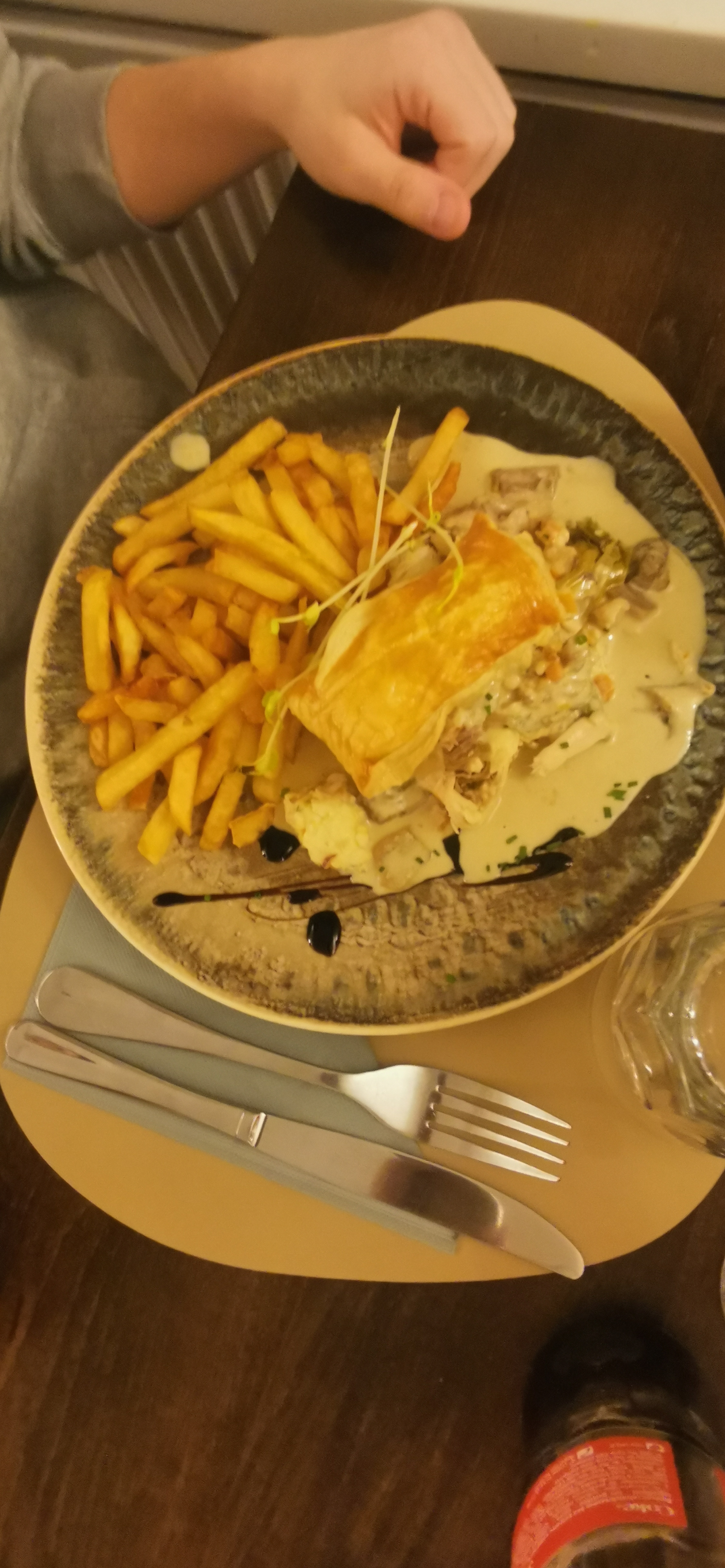 Les entrées sont ridicules pour un prix qui, lui, est normal. Le feuilleté aux escargots est tout petit, juste quelques escargots, 3 champignons ( pas beaucoup ) et de la crème avec une croûte posées dessus. Bof. Le saumon gravelax, pas mieux. Les rognons de veau sont bons mais certain ont eu plus de champignons que de rognons...voir peu de rognons. Garniture : juste des frites. Minimaliste. Desserts corrects Tout semble fait un peu à l'économie, surtout les entrées. Service OK et délais OK. Sinon, la carte est sympa, le cadre aussi. Bon, ce restaurant n'est pas a fuir. Notre avis général est bon. Des entrées plus généreuses, une garniture supplémentaire pour le plat aurait suffit pour que je donne 5 étoiles et pas 3.