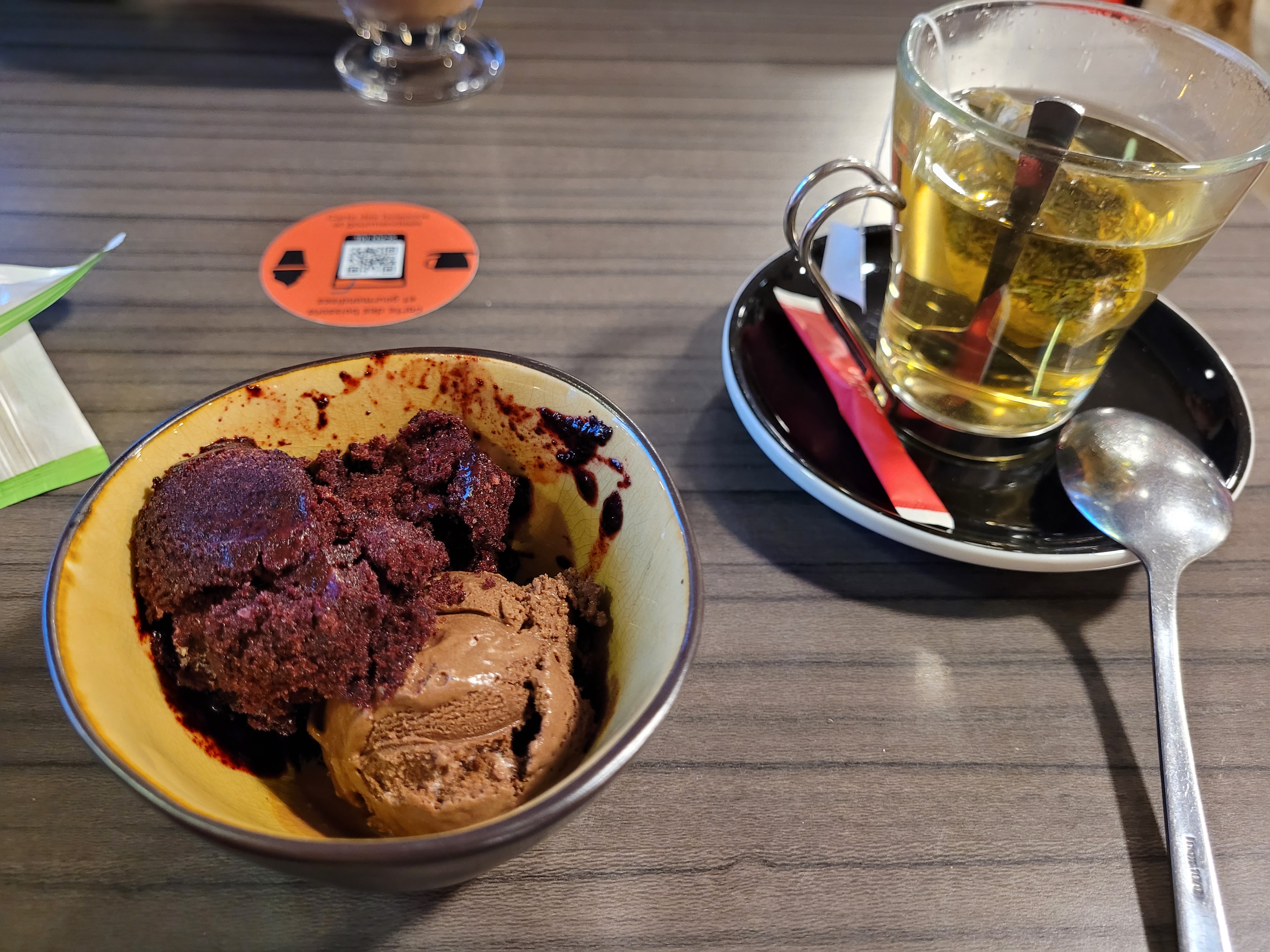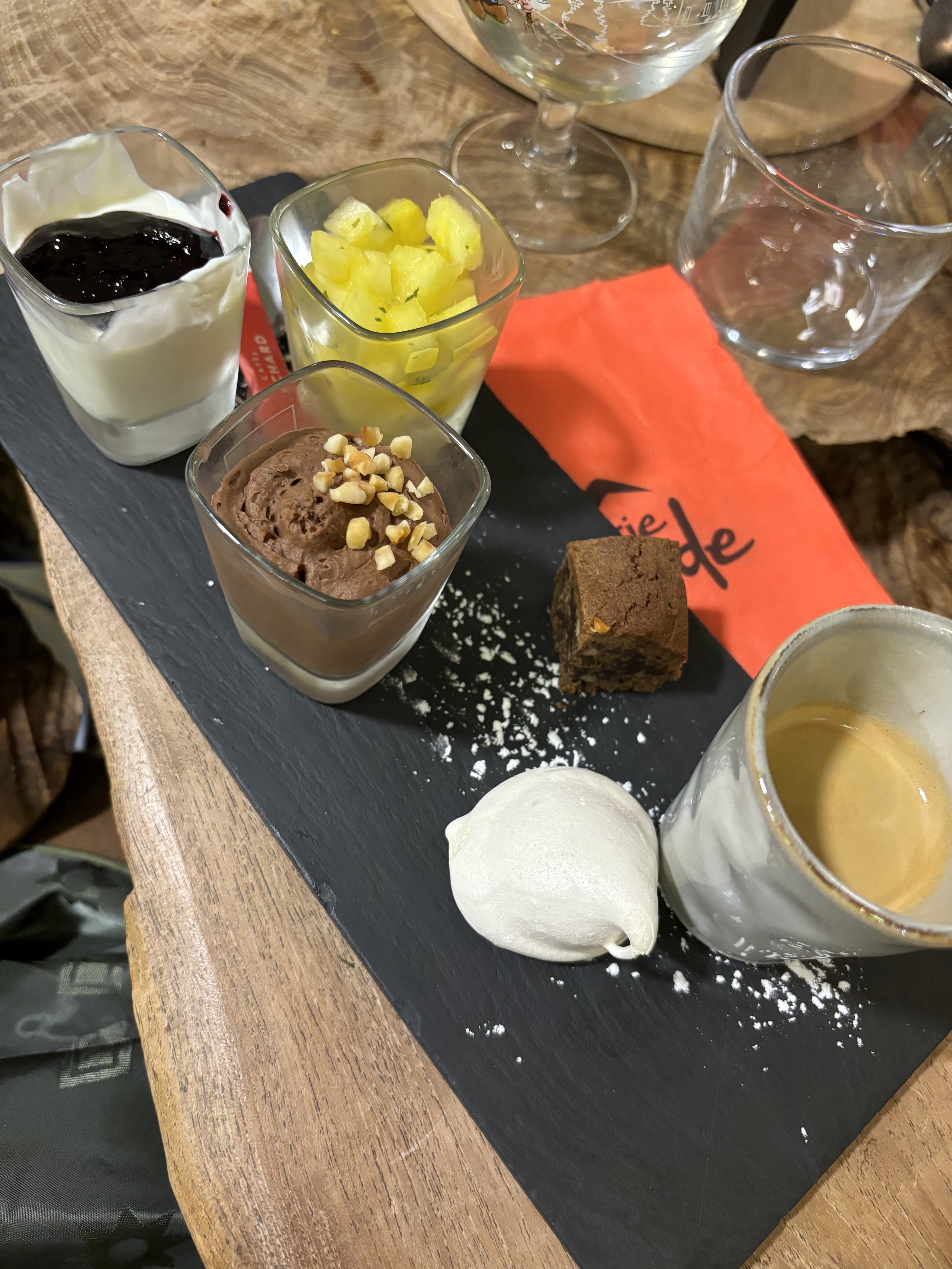 Repas excellents cf photos ( j'ai fait au mieux lol) pièce du boucher et fromage de brebis fondu.En dessert café liégeois avec un goût de revenez y😉