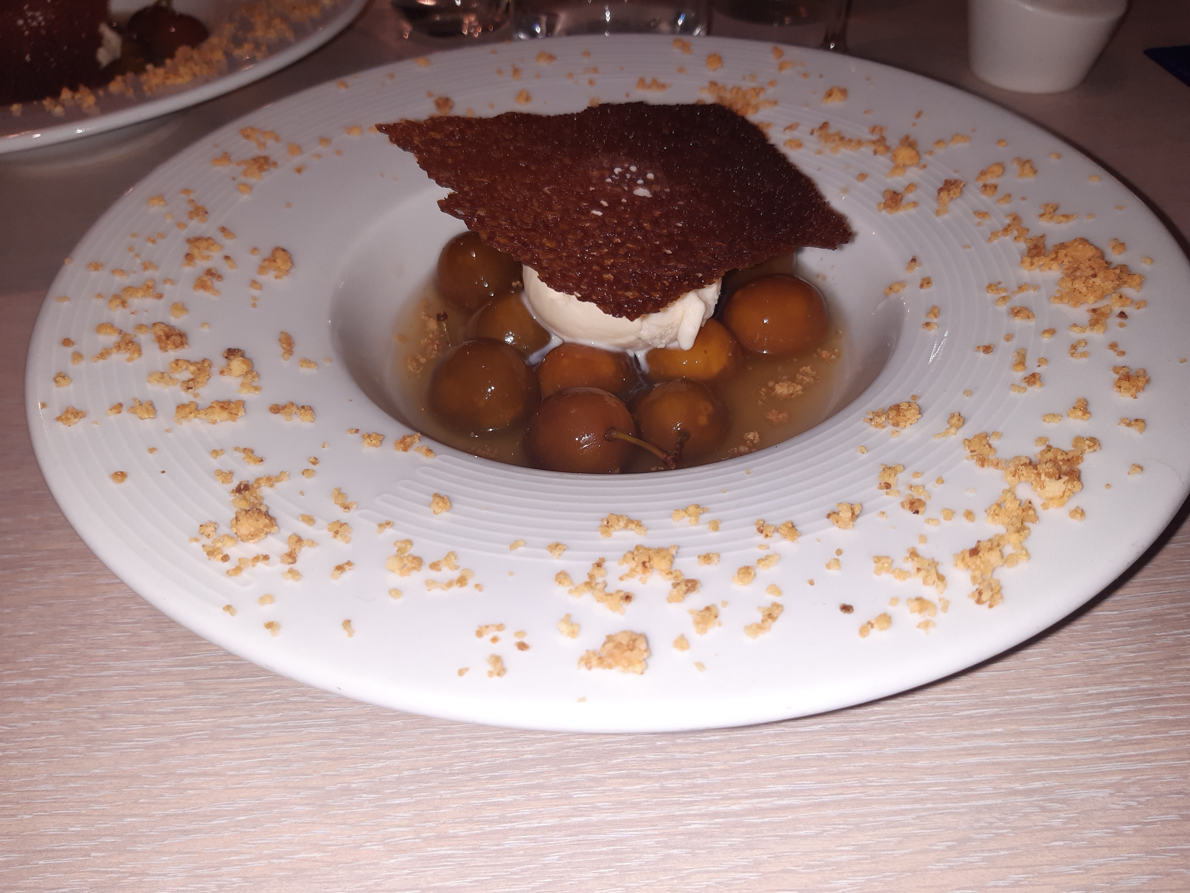 Encore une agréable étape de 13h à l'ombre extérieure bienfaisante pour savourer une sole délicieuse. Harmonie gustative...cerises charnues moelleuses vin cuit sorbet mangue je crois... Merci Henri...à une autre fois.