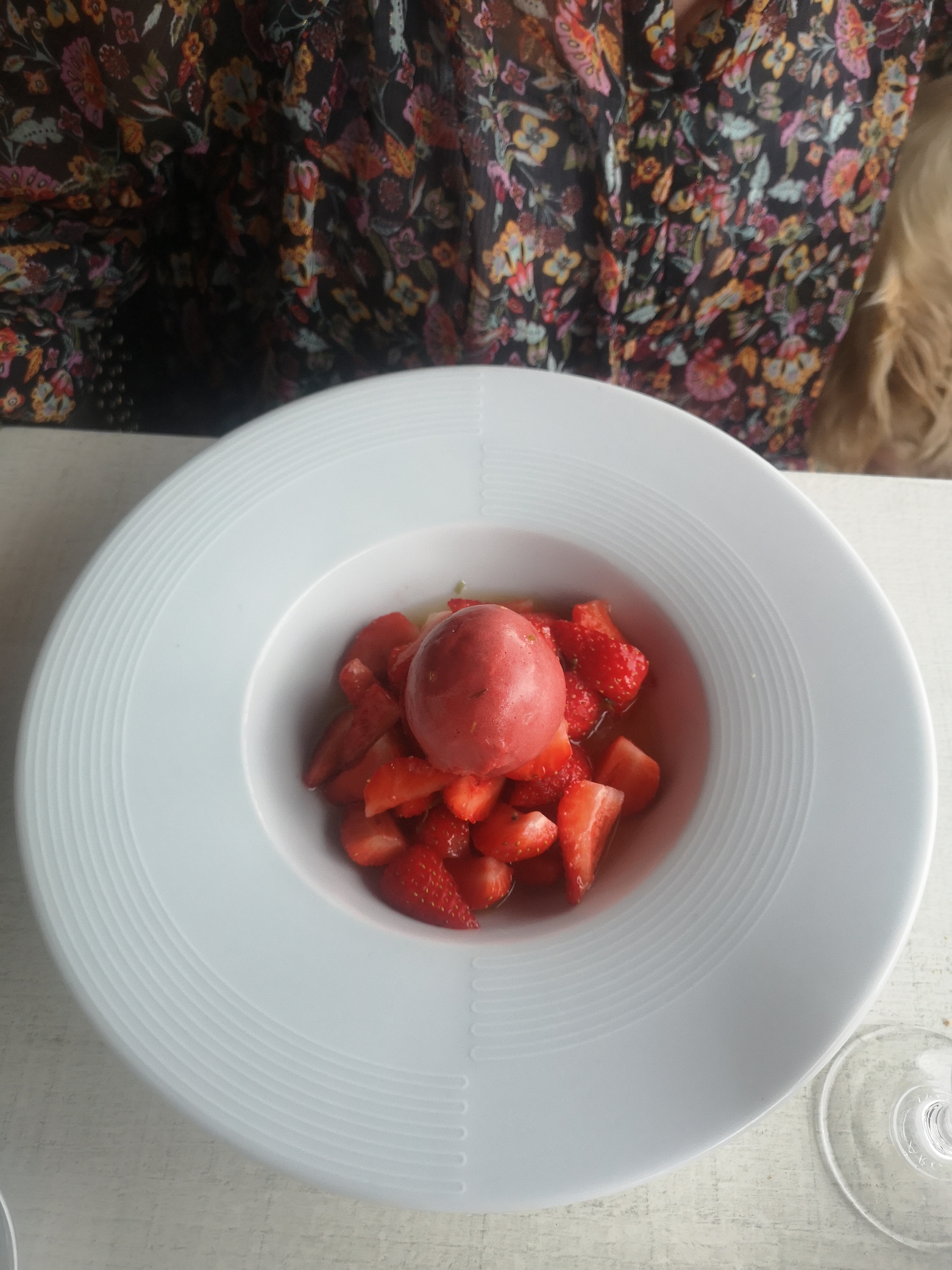 Posté le 18/08/2022 à 21:24"Plats fins avec portions raisonnable. Aile de raie préparée avec soin et originalité. Les abricots au four crumble étaient un délice! Très beau cadre. Le patron est chaleureux et la serveuse sympathique. 35€ le menu. Beau repas cadeau pour clôturer les vacances! ENG: refined restaurant with fish cooked with the greatest attention. Desserts are flavorful. Fine decor with a homey feeling. The boss and waitress are very sweet."