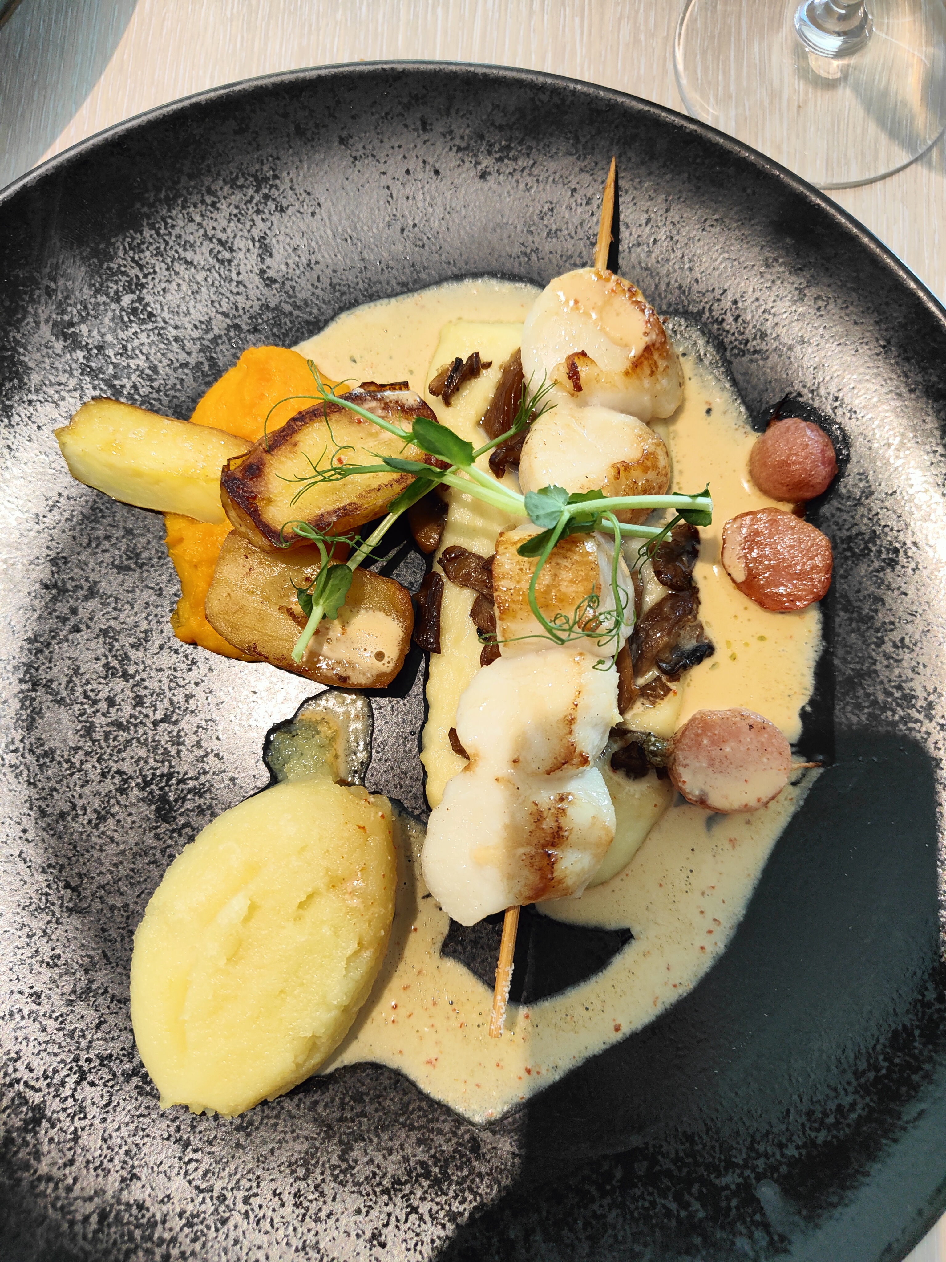 Excellent menu du midi, coquilles Saint Jacques traditionnelles savoureuses, dessert travaillé avec croquant et moelleux, top.