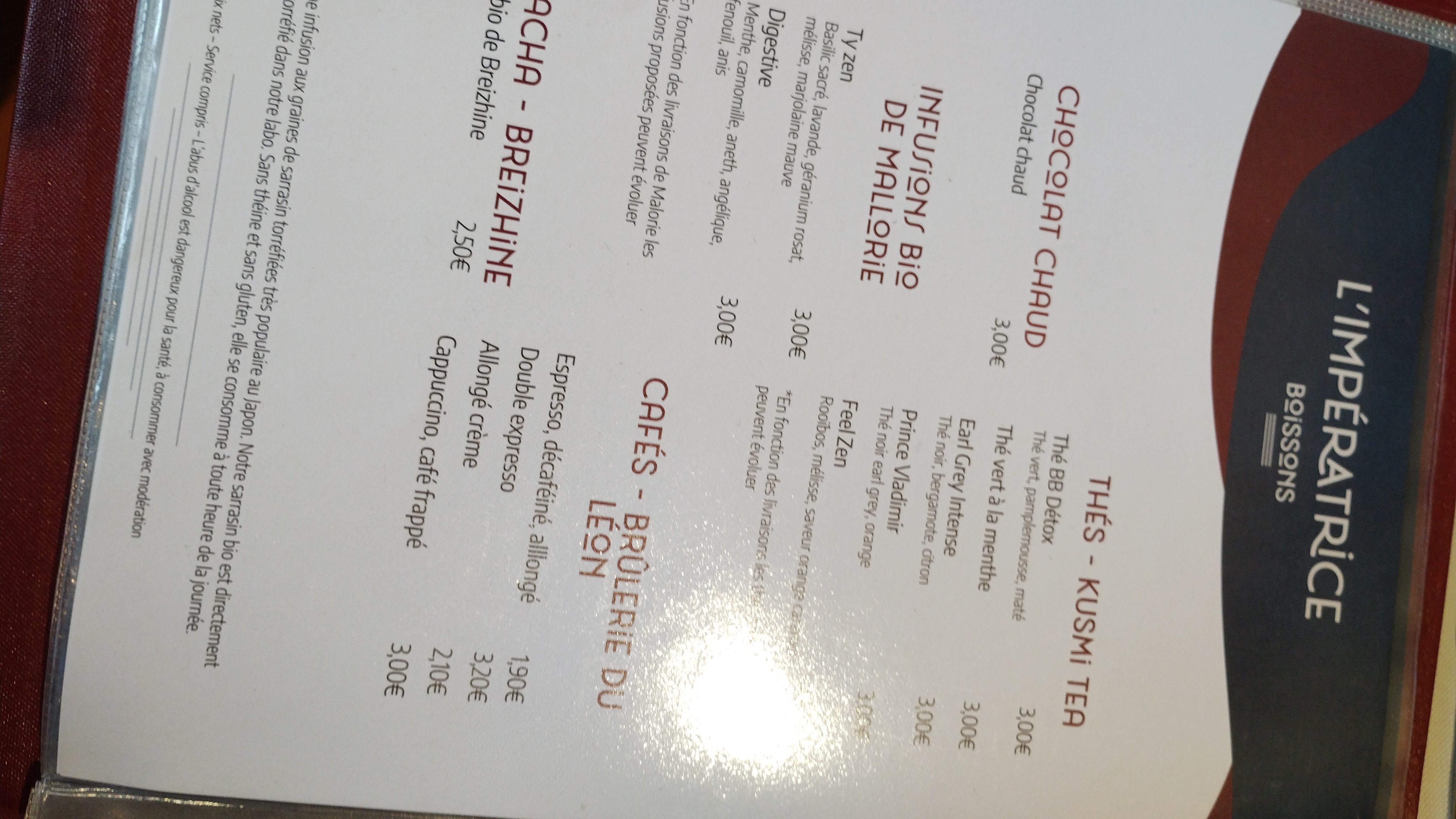 Avec ma femme nous avons dîner chez l impératrice ! Cela fut parfait . Les crêpes sont très bonnes et bien garnies quoique la pâte est très fine à mon goût. Le rapport qualité prix est assez élevé même si bien sûr les produits sont de qualité. Le personnel très efficace et sympathique.