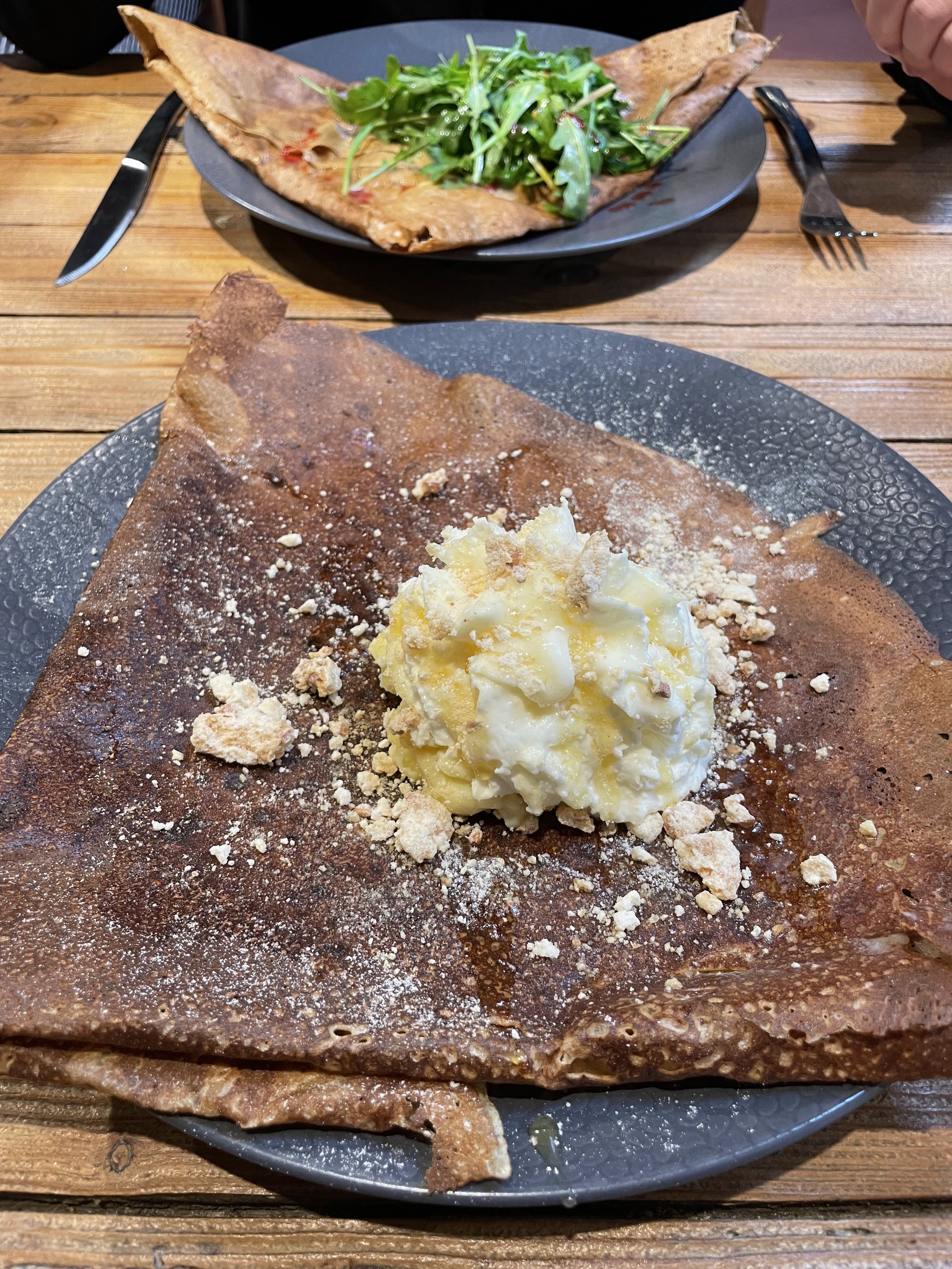 Nous avons très bien mangé. La galette au chorizo et la crêpe Breizhine (leur spécialité) étaient excellentes. Vous pouvez en profiter pour acheter des articles fabriqués à la farine de blé noir 😉, épices... Les cookies choco noisettes et les sablés bretons sont très très bons 👍