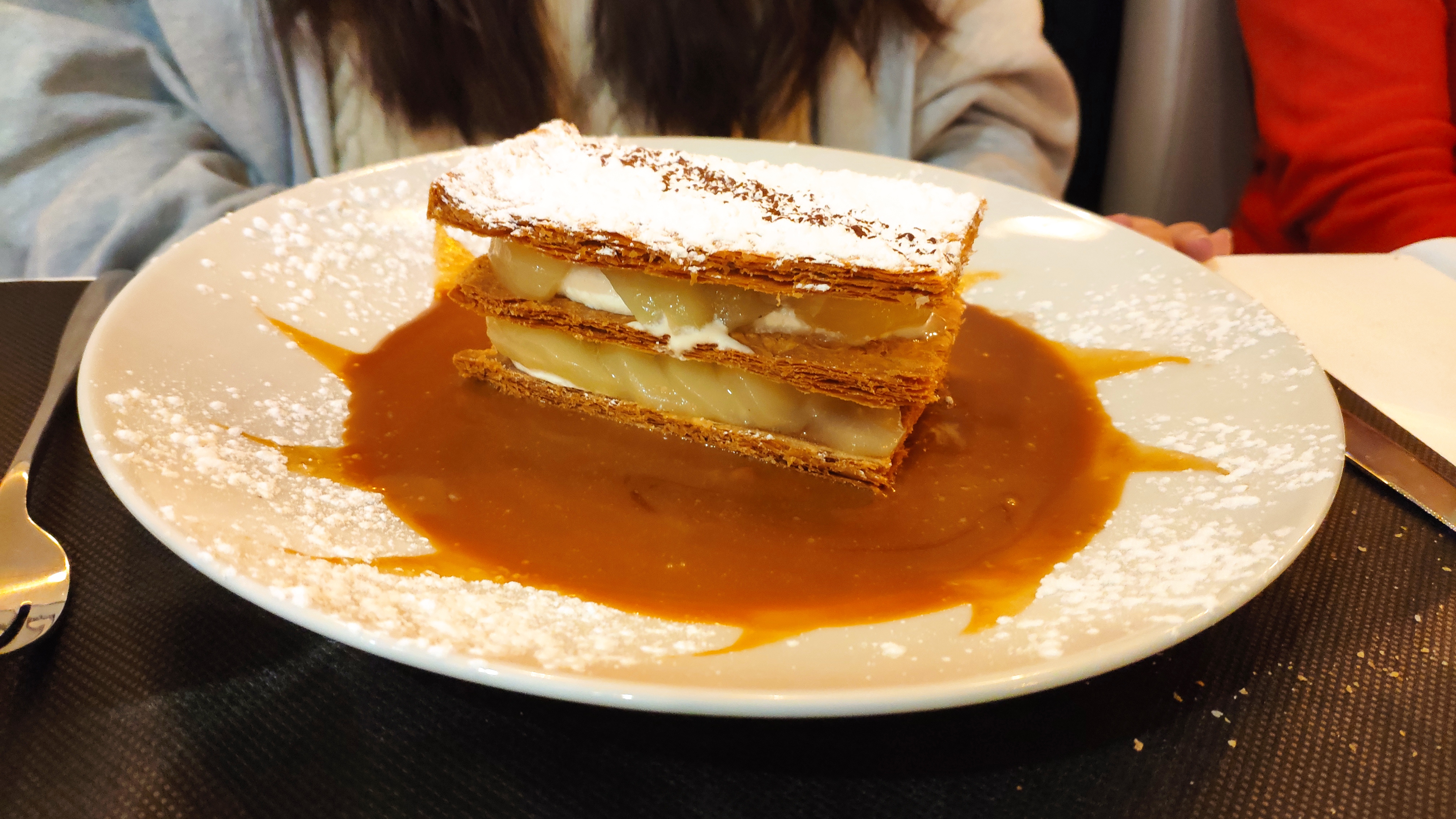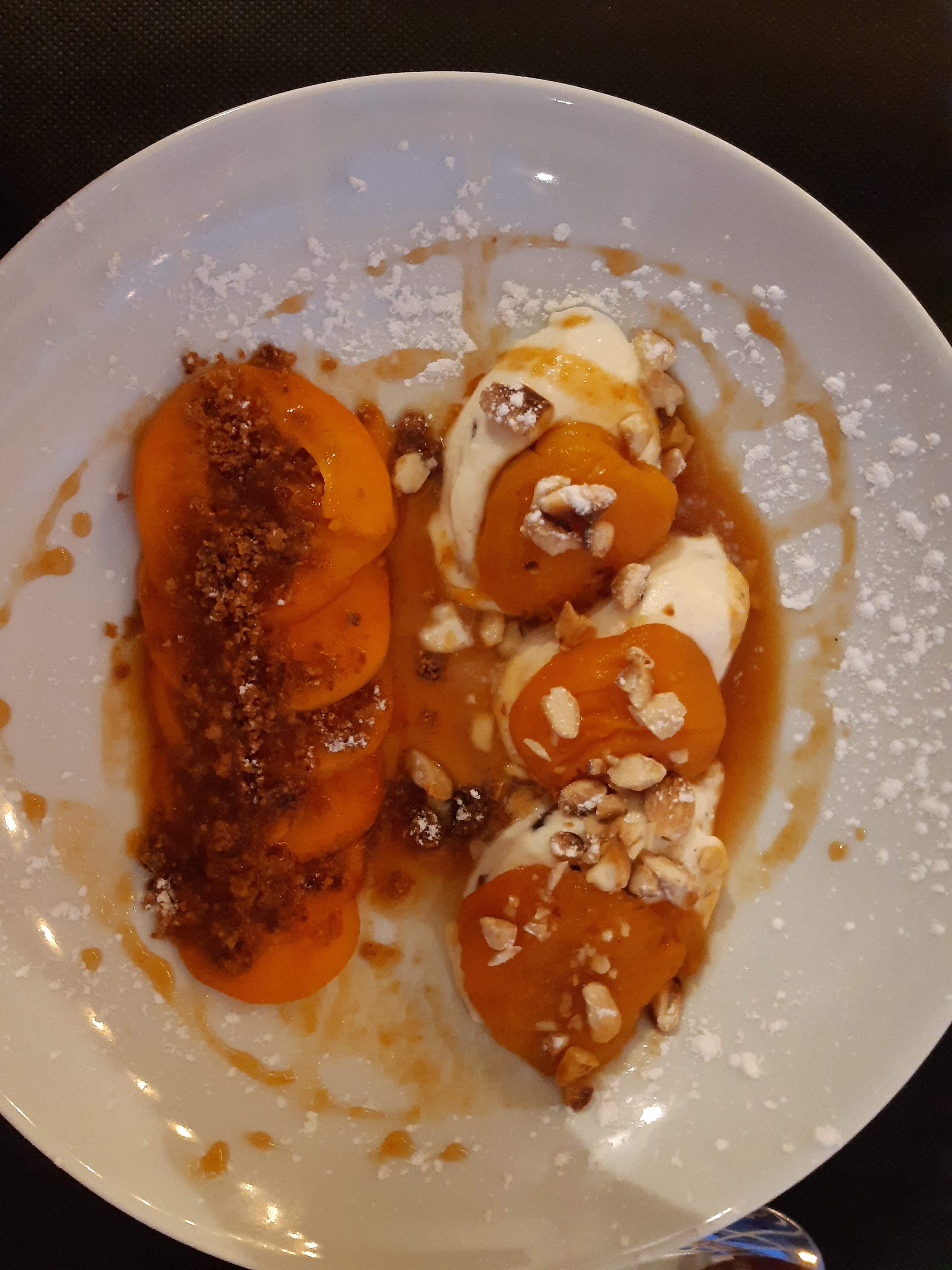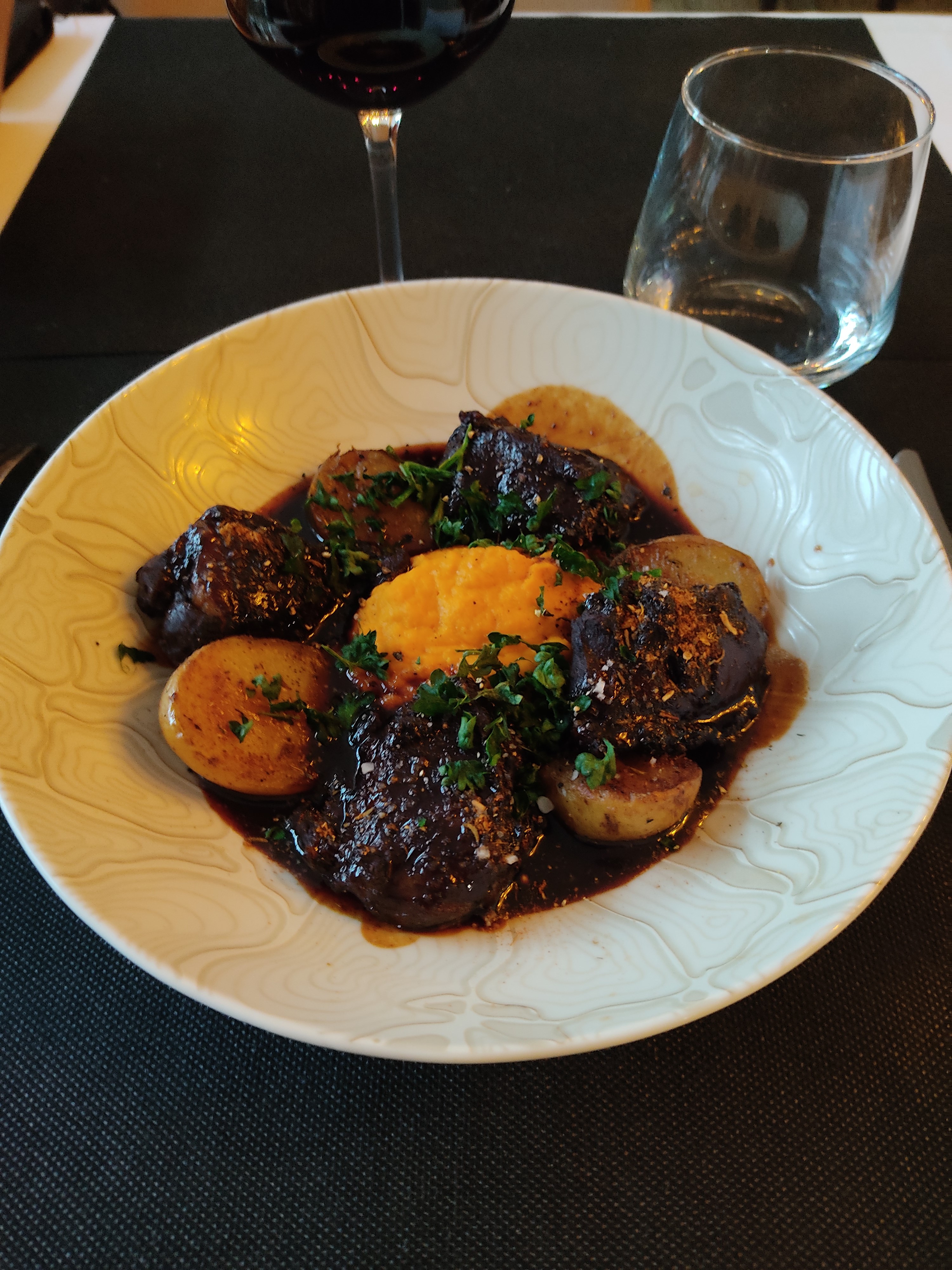 Joue de porc braisé aux épices créoles, mousseline de carottes orange et cumin : Ce plat fait partie d’un menu pris le midi avec un plat et dessert pour 21 euros….c’est très bon, assiette (très ) chaude, plat chaud, bonne portion, une belle qualité de viande, belle saveur, très bonne cuisson : goûteux, fondant, vraiment bien travaillé, l’accompagnement de la mousseline de carottes et pommes de terres est somptueuse comme la cuisson là aussi. Un délire des sens à la première bouchée, c’est un régal, pas d’autres mots mais un rendez-vous dans ce restaurant avec ses avis qui ne sont pas volés : service simple à l’écoute mais de qualité et calme en semaine avec un intérieur sobre et coquet. Un très bon moment de convivialité. Pour les vins, très honorable en terme de prix. Accompagnement , vin de Graves rouge . Verrine pommes et poires, crémeux caramel : Dessert délicat, sobre mais plein de saveurs, une belle fusion de pommes et poires fondantes avec un crémeux dont le sucre est peu présent sans oublier les amandes effilées . Léger, aérien mais tout en saveur, un régal là aussi. Rien à rajouter, simplement le goûter pour l’adopter. Concrètement…un restaurant dans son ensemble à recommander pour le plaisir de toutes et tous.
