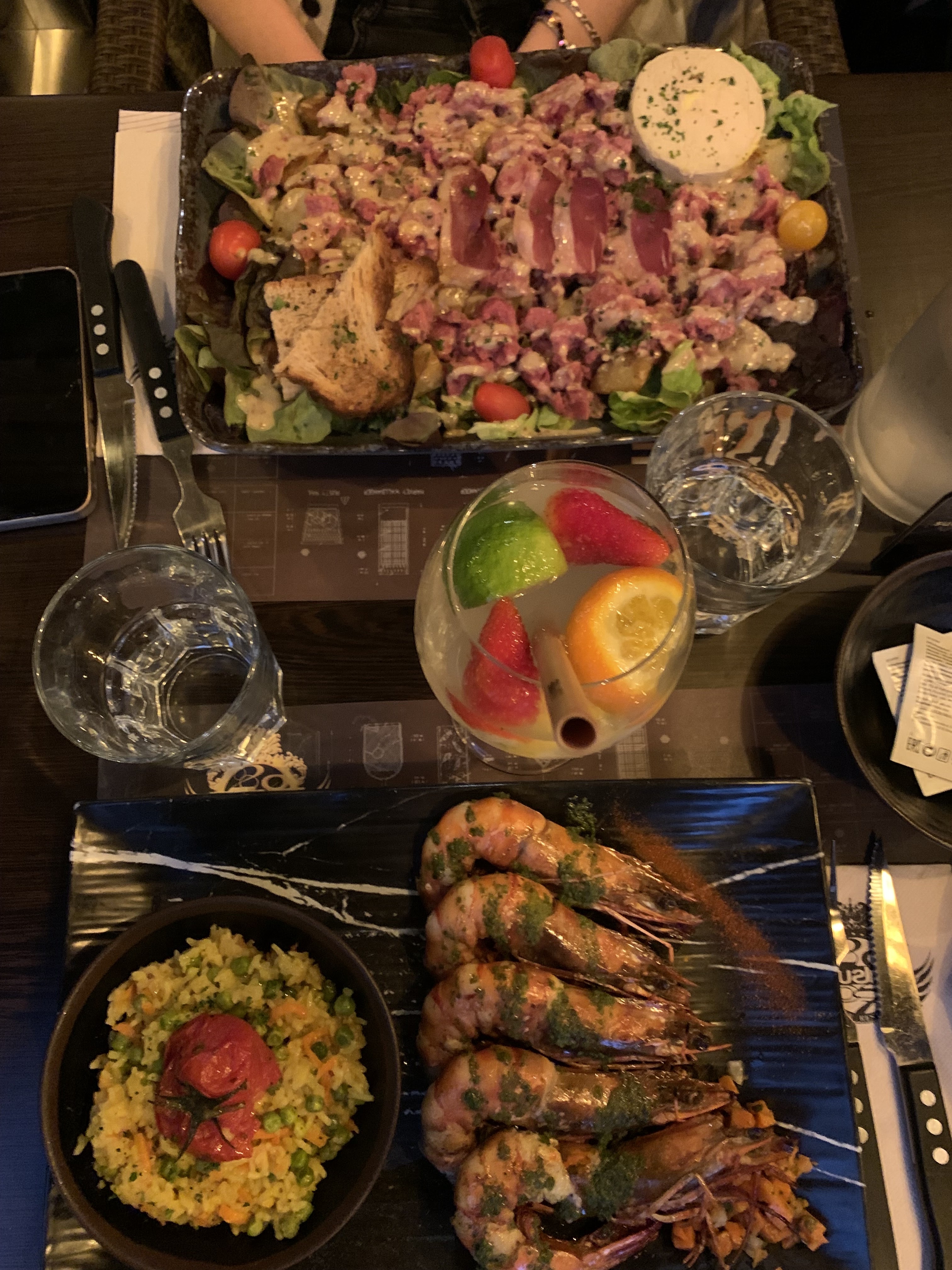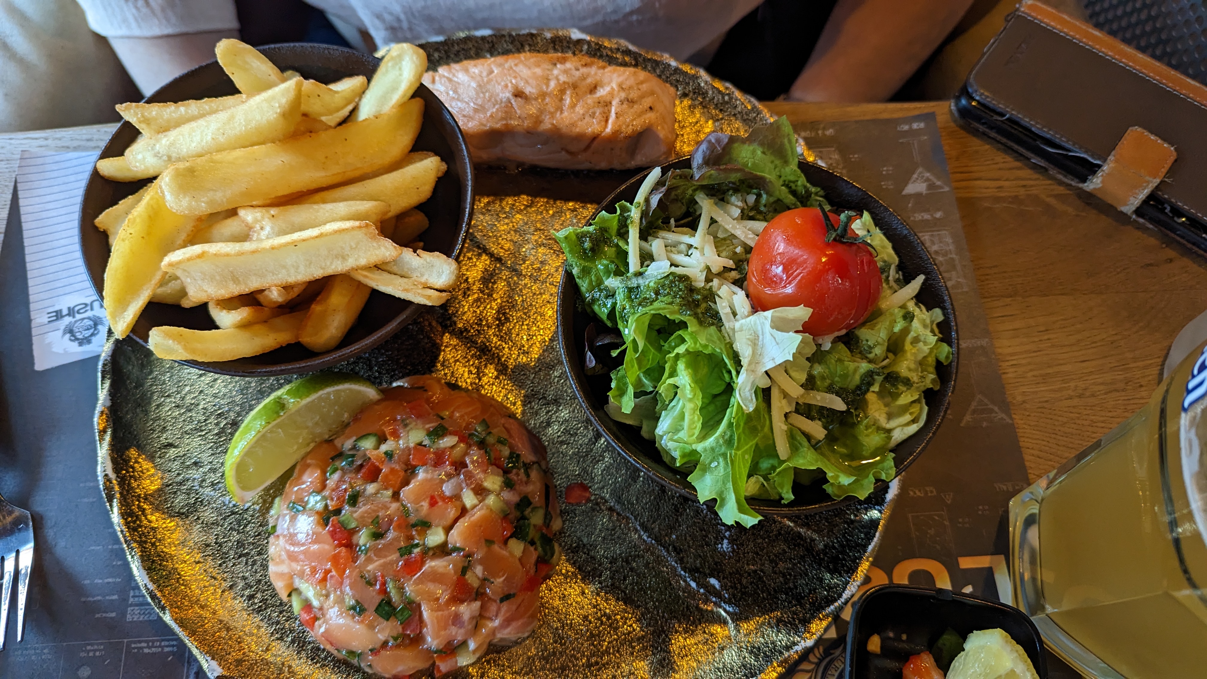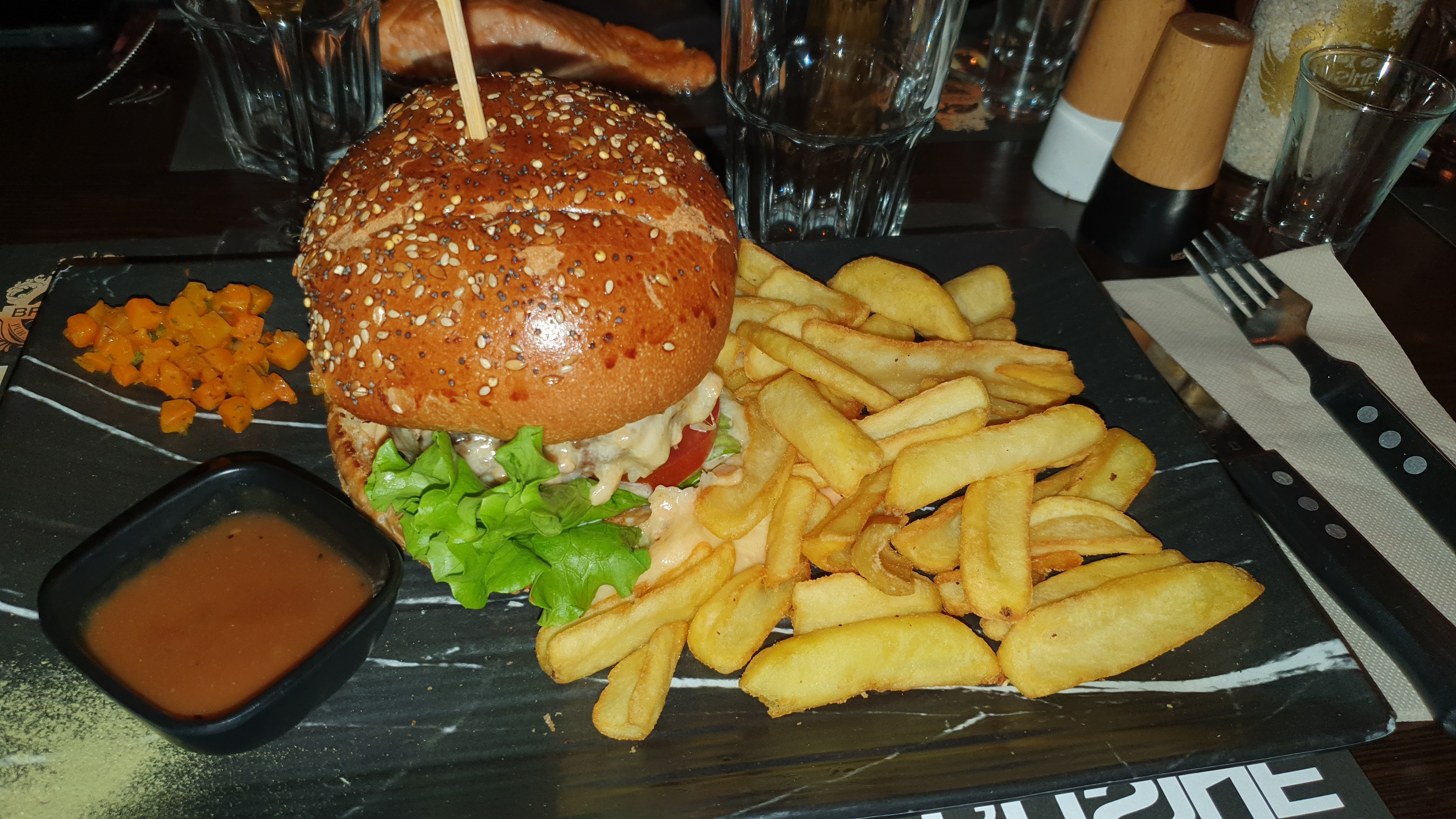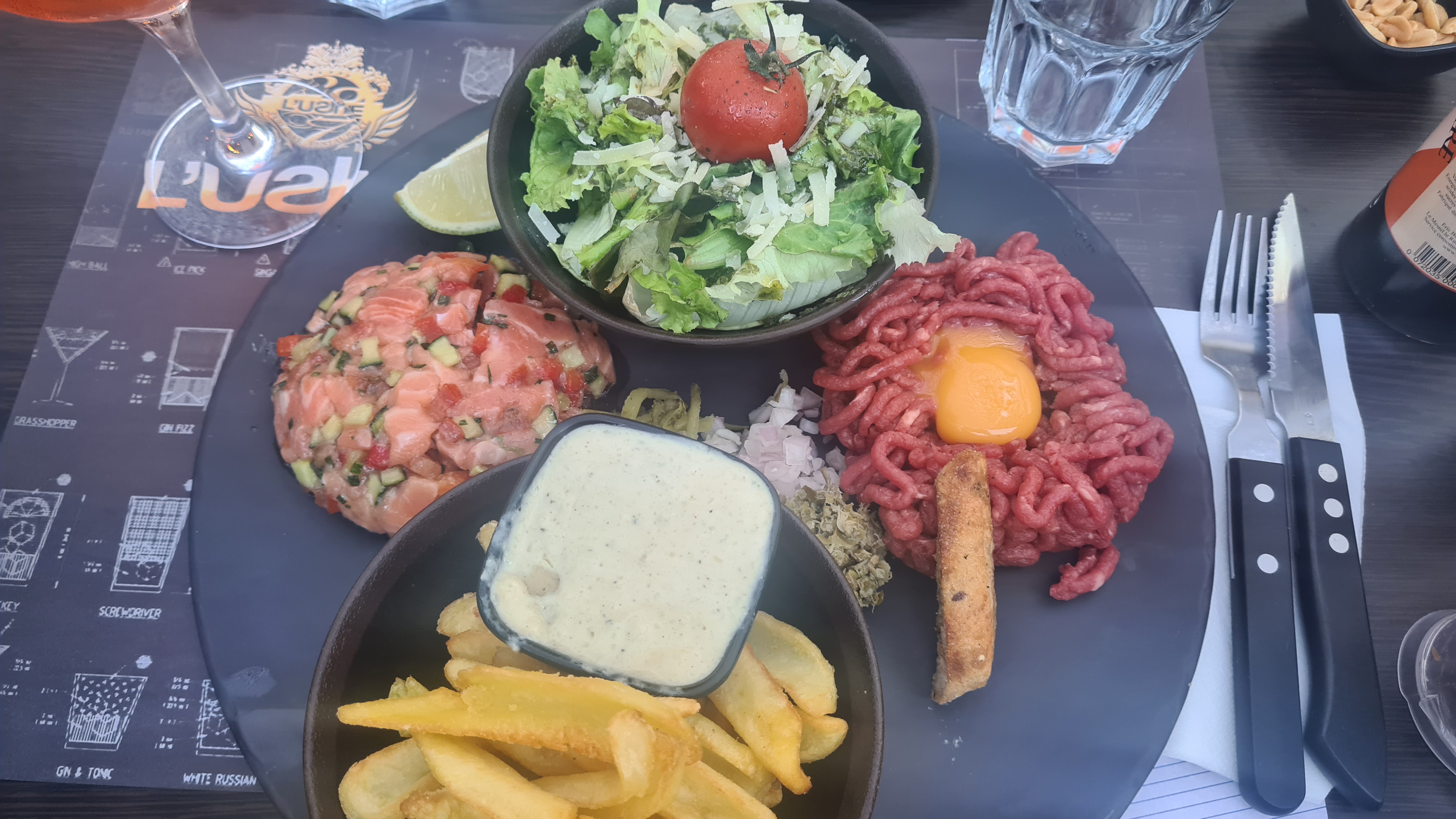 Trop de choix sur la carte, une dizaines de tartare, de pizzas, salades, fondues, hamburgers différents, autant en faire moins car trop d’attente, arrivée à 20h, le dessert est arrivé à 23h (sans entrée). Alors oui on était 8, oui il y a du monde mais déjà 1h30 pour 8 boissons c’est compliqué quand 5 serveurs différents nous servent !