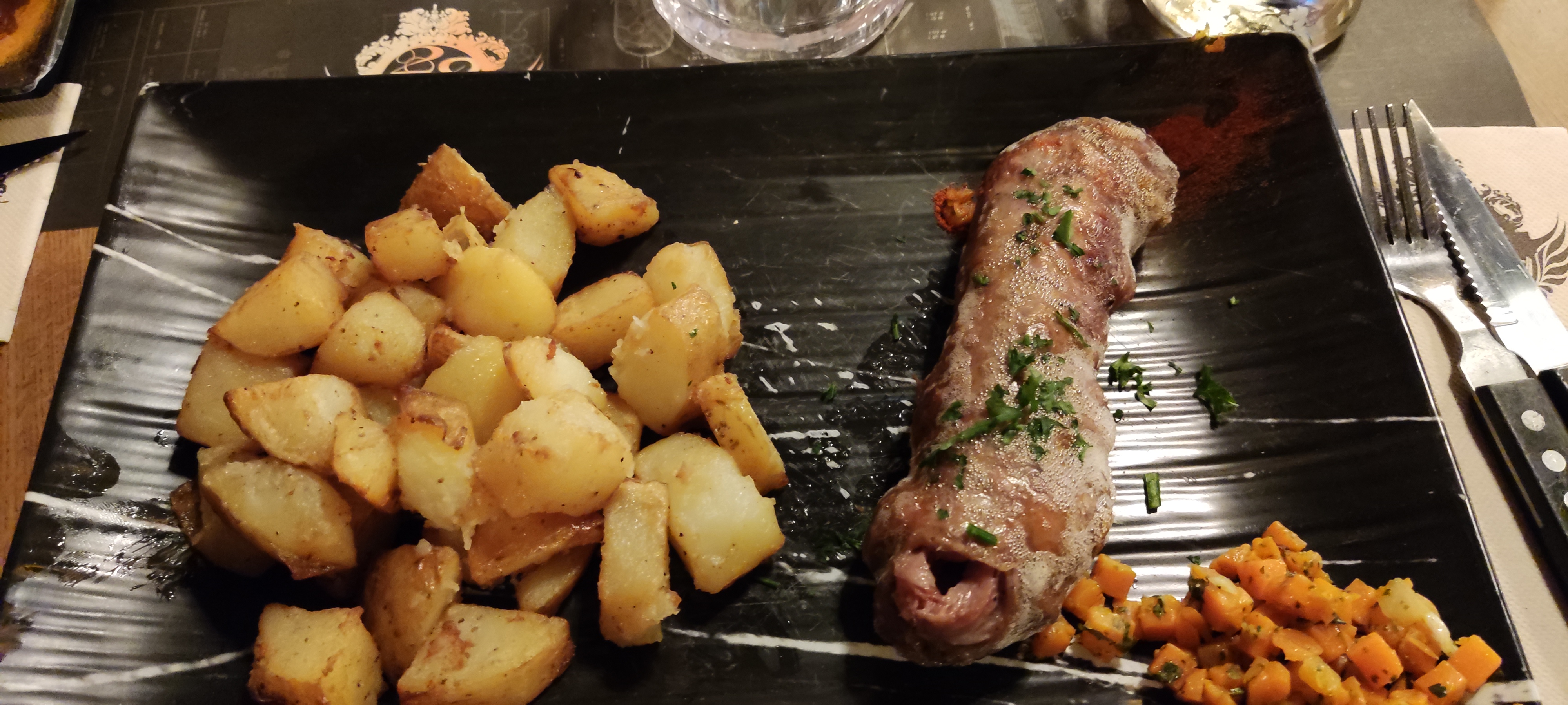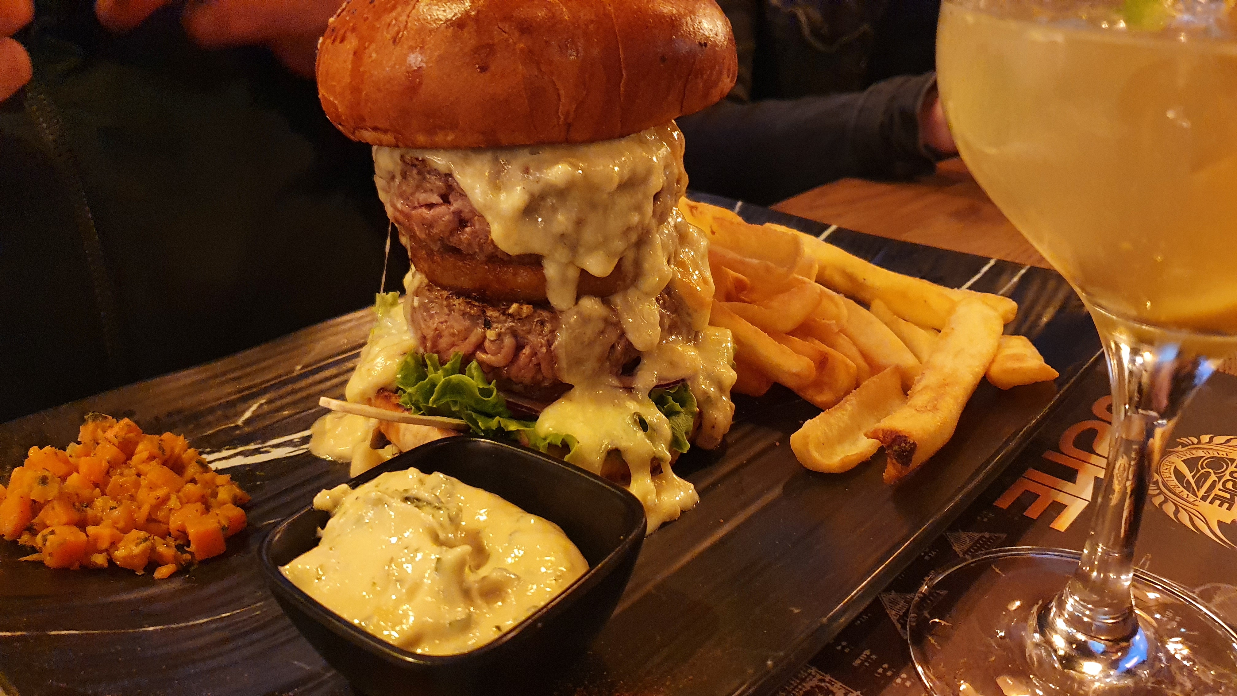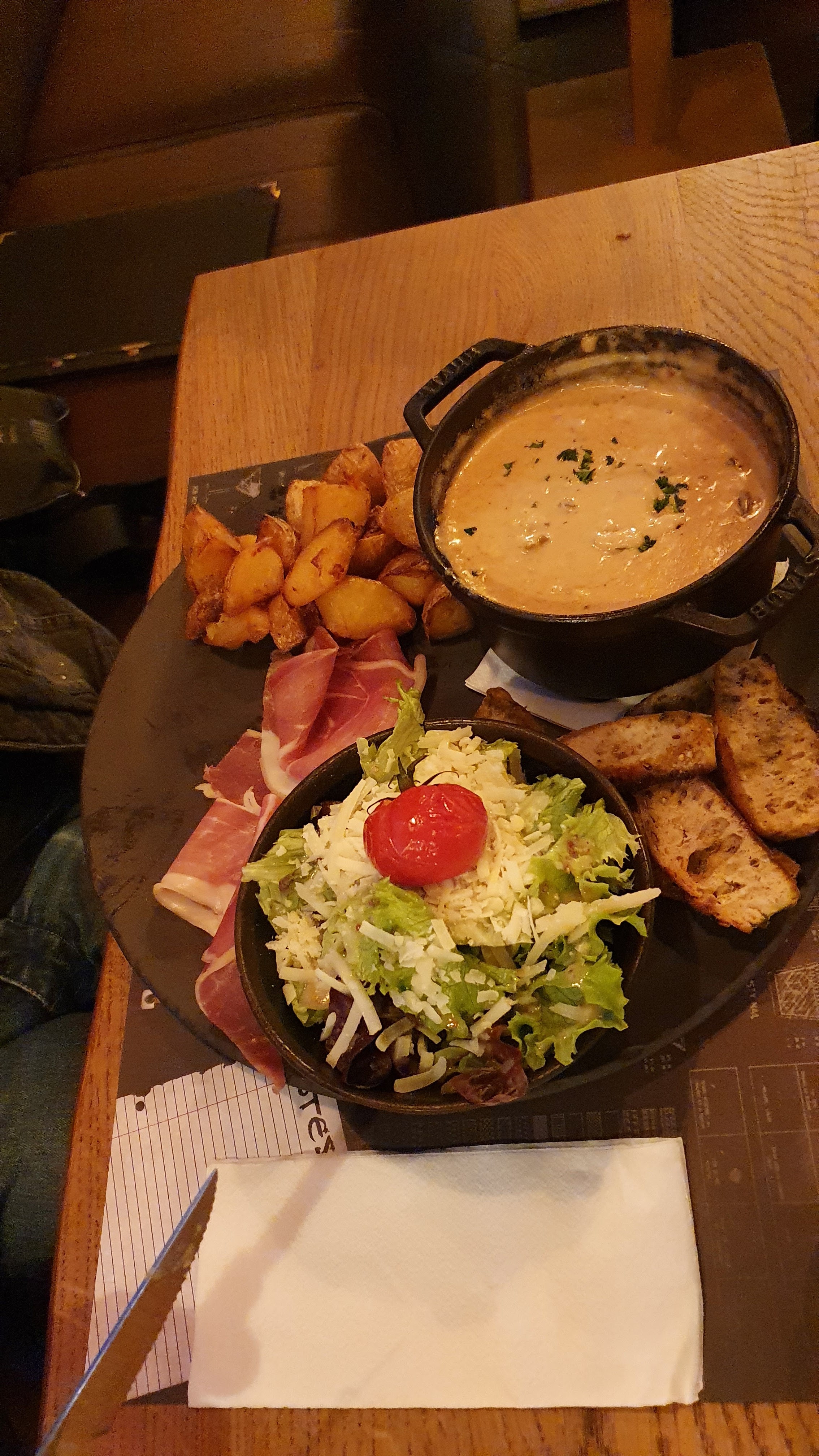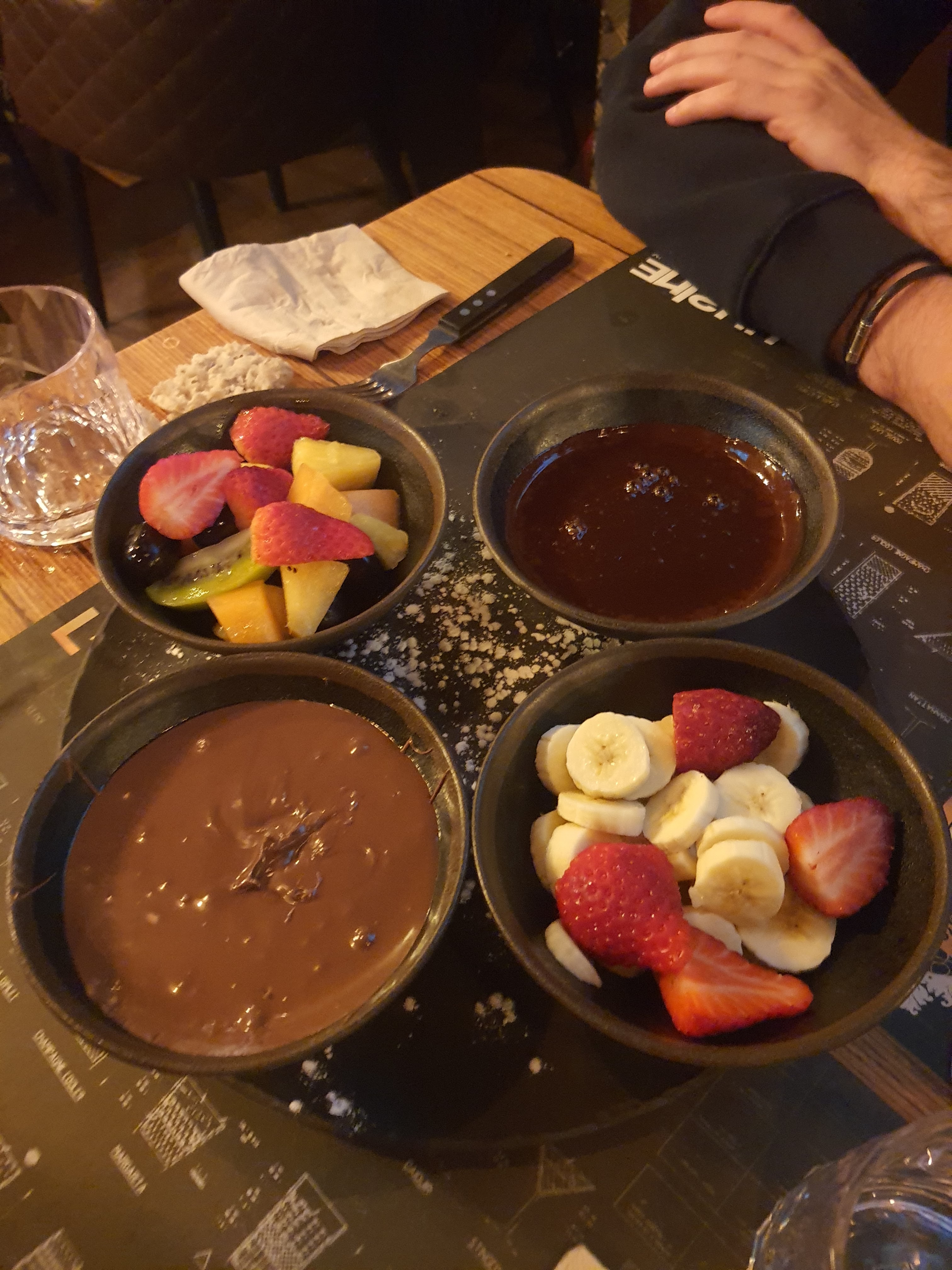 Trop de choix sur la carte, une dizaines de tartare, de pizzas, salades, fondues, hamburgers différents, autant en faire moins car trop d’attente, arrivée à 20h, le dessert est arrivé à 23h (sans entrée). Alors oui on était 8, oui il y a du monde mais déjà 1h30 pour 8 boissons c’est compliqué quand 5 serveurs différents nous servent !