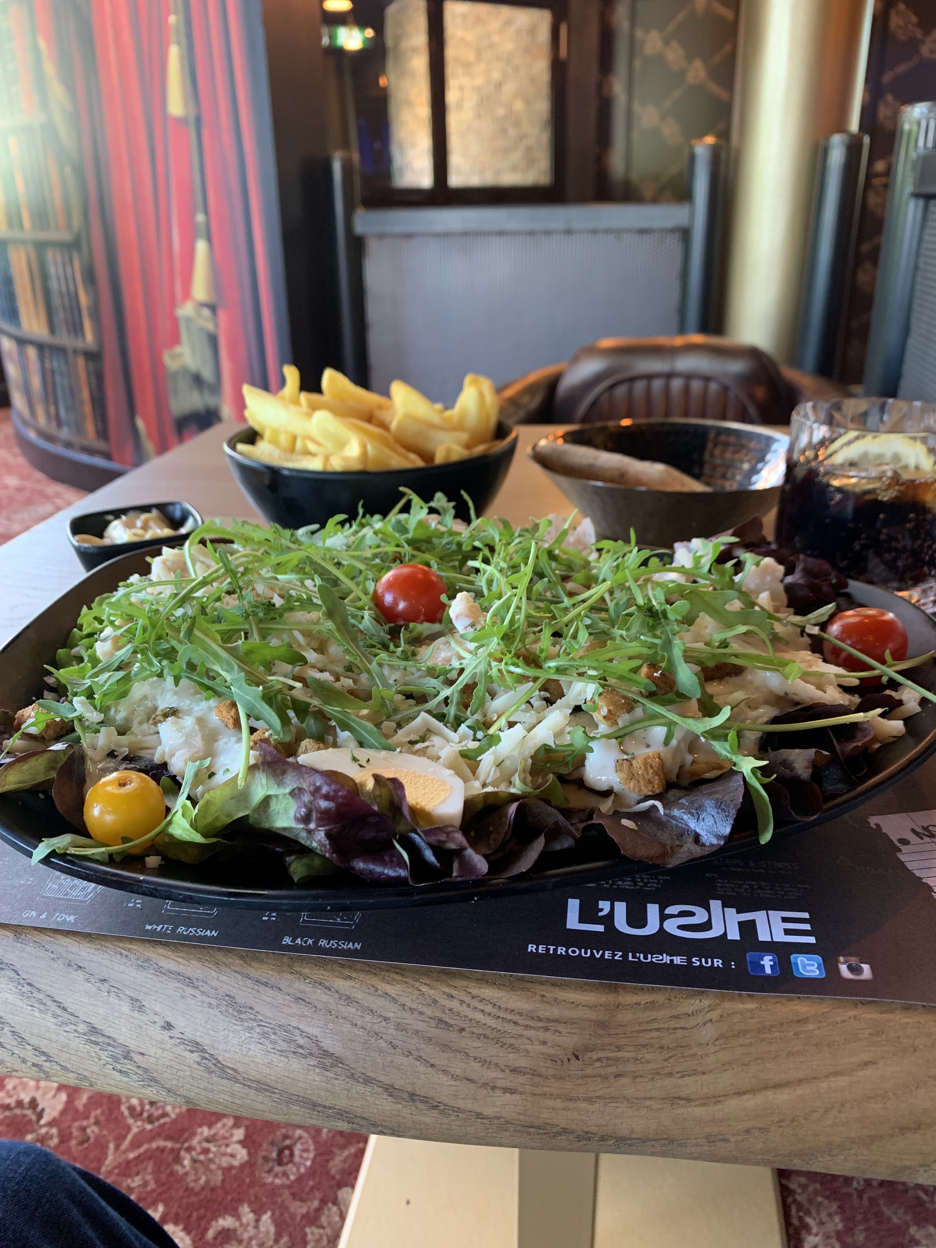 Tout bon gastronome le sait, une carte proposant trop de choix et de types d’aliments différents, ne saurait donner confiance. En effet, nous avons en premier lieu 4 pages de boissons et cocktails dont tapas ; ceci est digne d’un bar à tapas plutôt que d’un restaurant. Ensuite, nous avons une page entière d’entrées et de salades … 13 entrées dont des nems, des oeufs mayo ou bien la cassolette d’escargots ! L’écart gustatif est impressionnant 😅. Puis vient une page entière de burgers en tous genres, accrochez-vous, 18 burgers au total en simple, double ou triple steak; même les fast food que je ne citerai ne font pas mieux. Mais encore, une page entière de pizzas et de pâtes ! On se dit que c’est fini et bien non, il y a encore les poissons, puis les viandes avec des tartares en tous genres dont celui de Maitre BEN (c’est qui ?) Ce n’est pas terminé car vous pourrez même choisir un risotto aux morilles ou bien le saint-jacques, une souris d’agneau ou bien même des tartiflettes et la fameuse fondue du cochon; mais si vous changez d’avis, pas de panique il y a le boeuf sauce thai juste en dessous ! 😳 Ce n’est pas assez ? Alors changement d’ambiance, vous pourrez choisir des sashimis de thon et de saumon ou bien une andouillette AAAAA et ses frites 😂 Pour résumer, l’endroit porte très bien son nom, c’est l’usine, on est totalement perdu et on n’est pas rassuré par la qualité des plats. Et cela se ressent nettement aux goûts, car avoir une carte extrêmement large ne peut aucunement garantir la fraicheur des produits consommés, lorsque l’on a qui plus est des poissons crus ou bien des viandes crues.