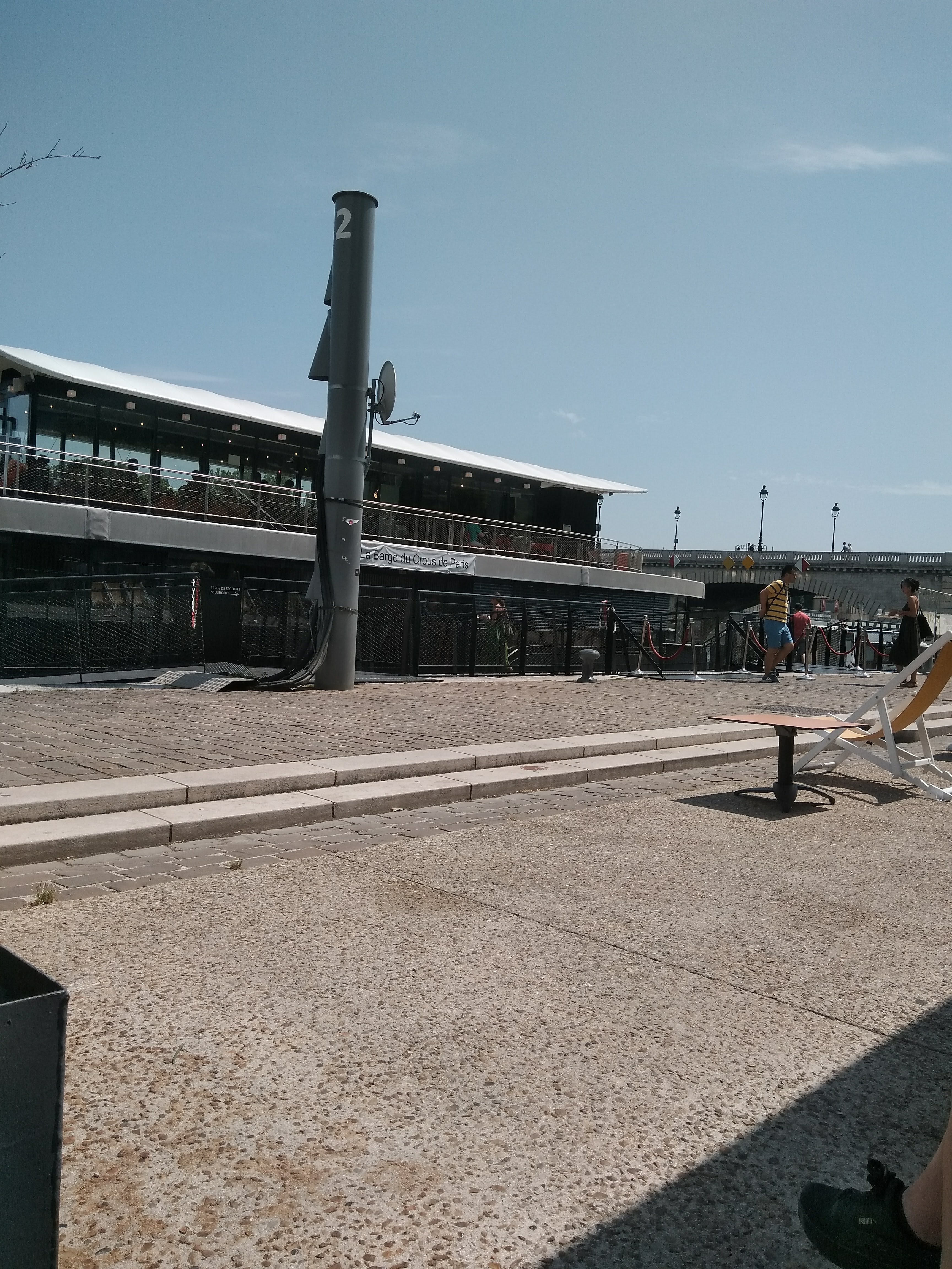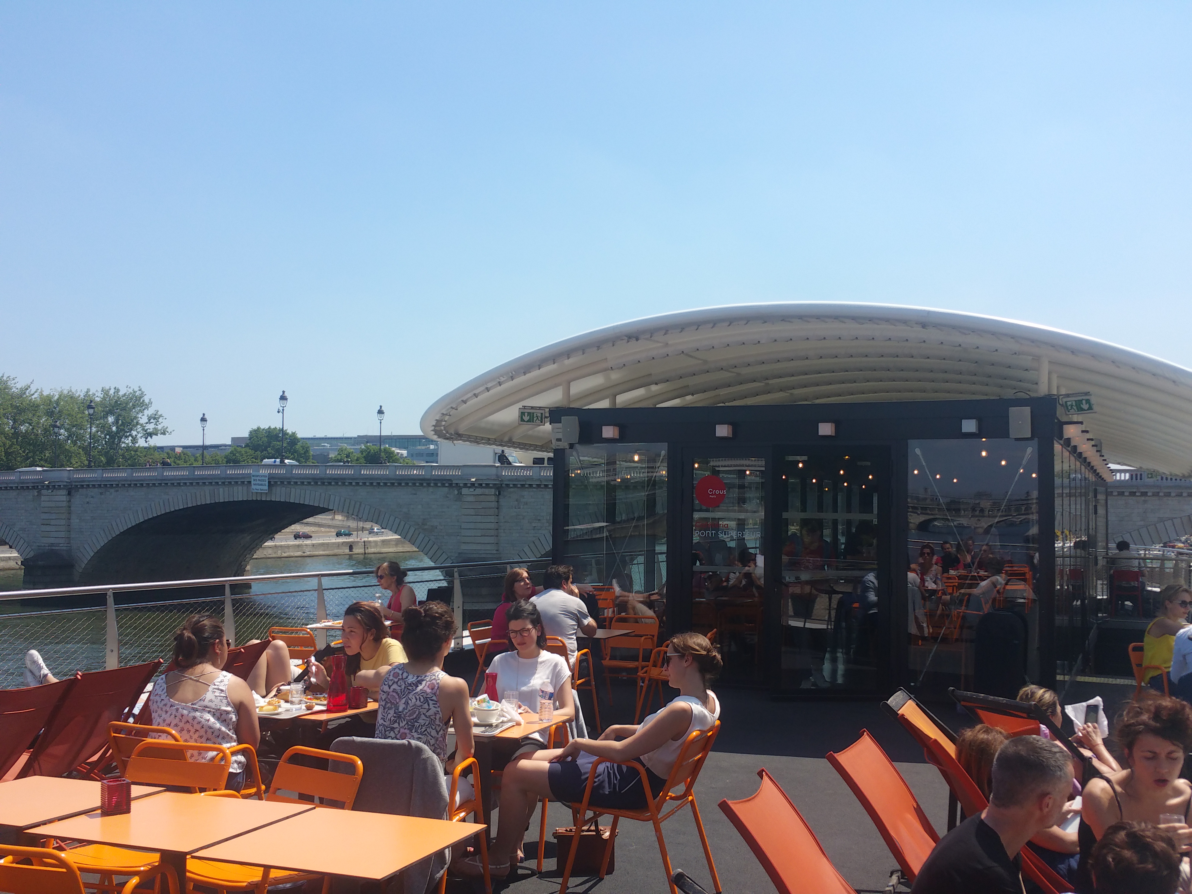 C'est la nouvelle péniche du CROUS, ambiance stylé avec transat, collation abordable, et chaine HIFI branchement cable jack pour les convives. C'est un peu retour à l'époque des colonies de vacances ou des moment de restauration pendant la pause déjeuné avant les cours. Je crois qu'il y a une programmation avec des concerts et des journées à thèmes. HAVE A GOOD LUNCH !
