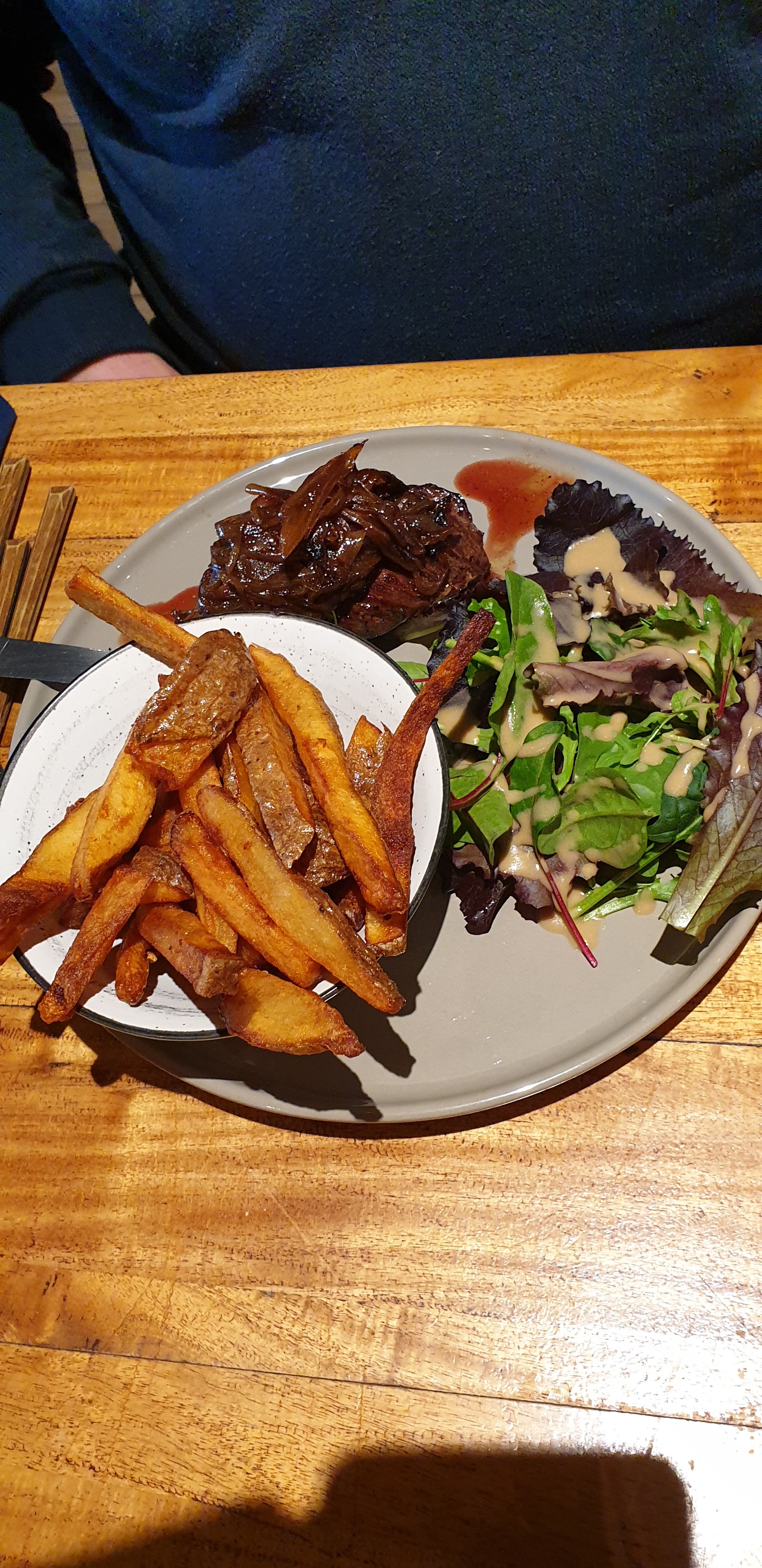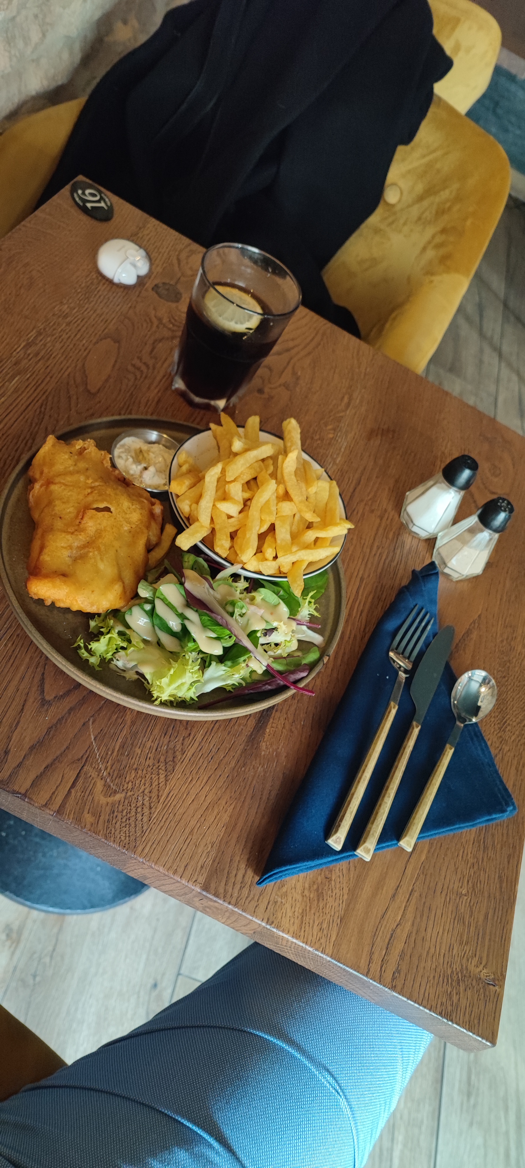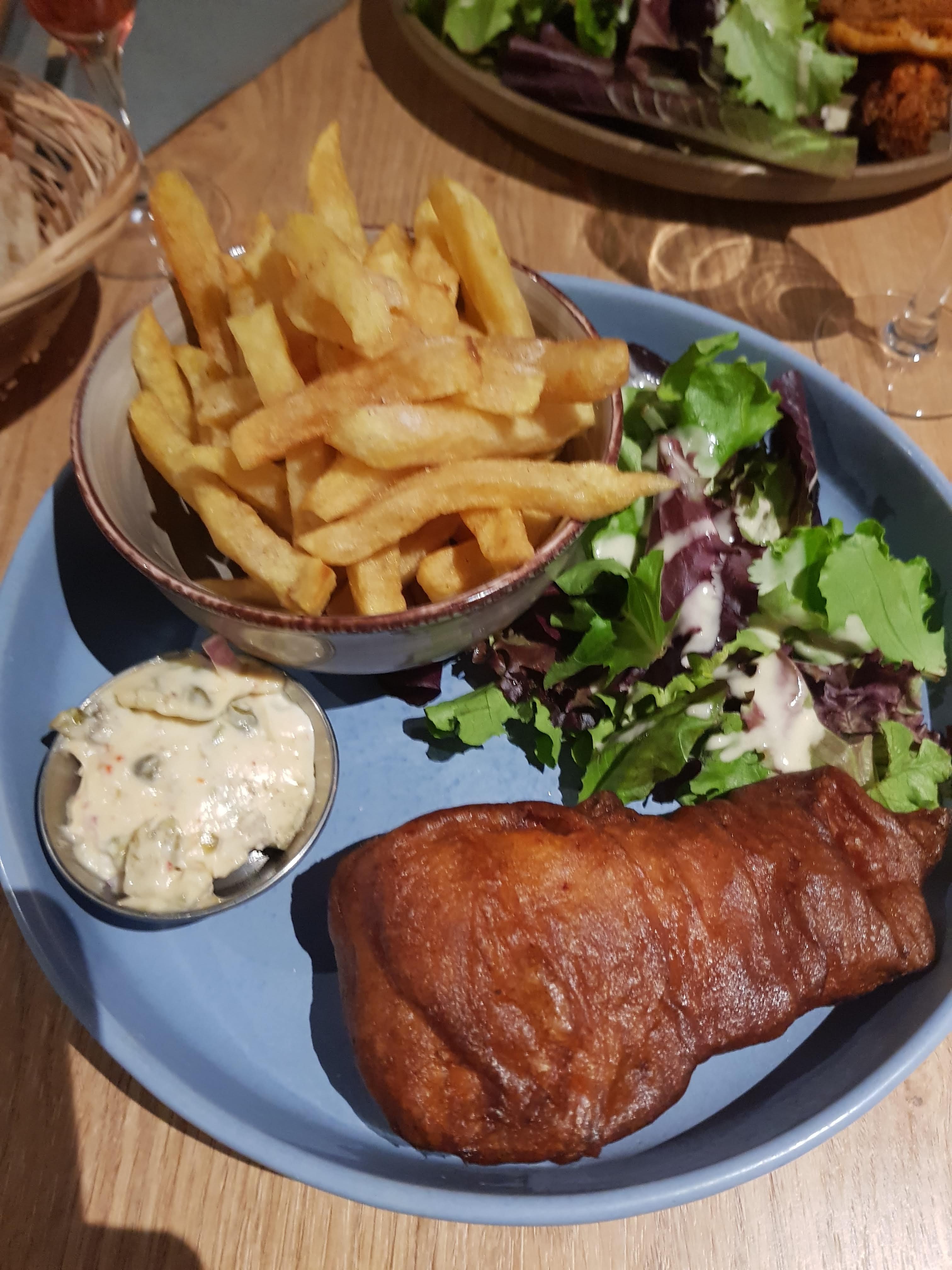 Joli endroit. J'aime beaucoup l'ambiance Pub et elle y est ! J'ai passé un très bon moment entre amis. L'accueil et le service sont agréables. L'éclairage est sympa. C'est rare et pourtant tellement important. Mais alors, la cuisine... quand on ne sait pas faire un fish and chips - normandou pas, on fait autre chose et on le fait bien. Poisson trop cuit. La truite ne va pas avec la recette il faut un poisson blanc. Les frites.... je vous en prie M. Le cuisinier, revoyez et maîtrisez vos classiques. Je reviendrai pour boire un verre pas pour dîner.