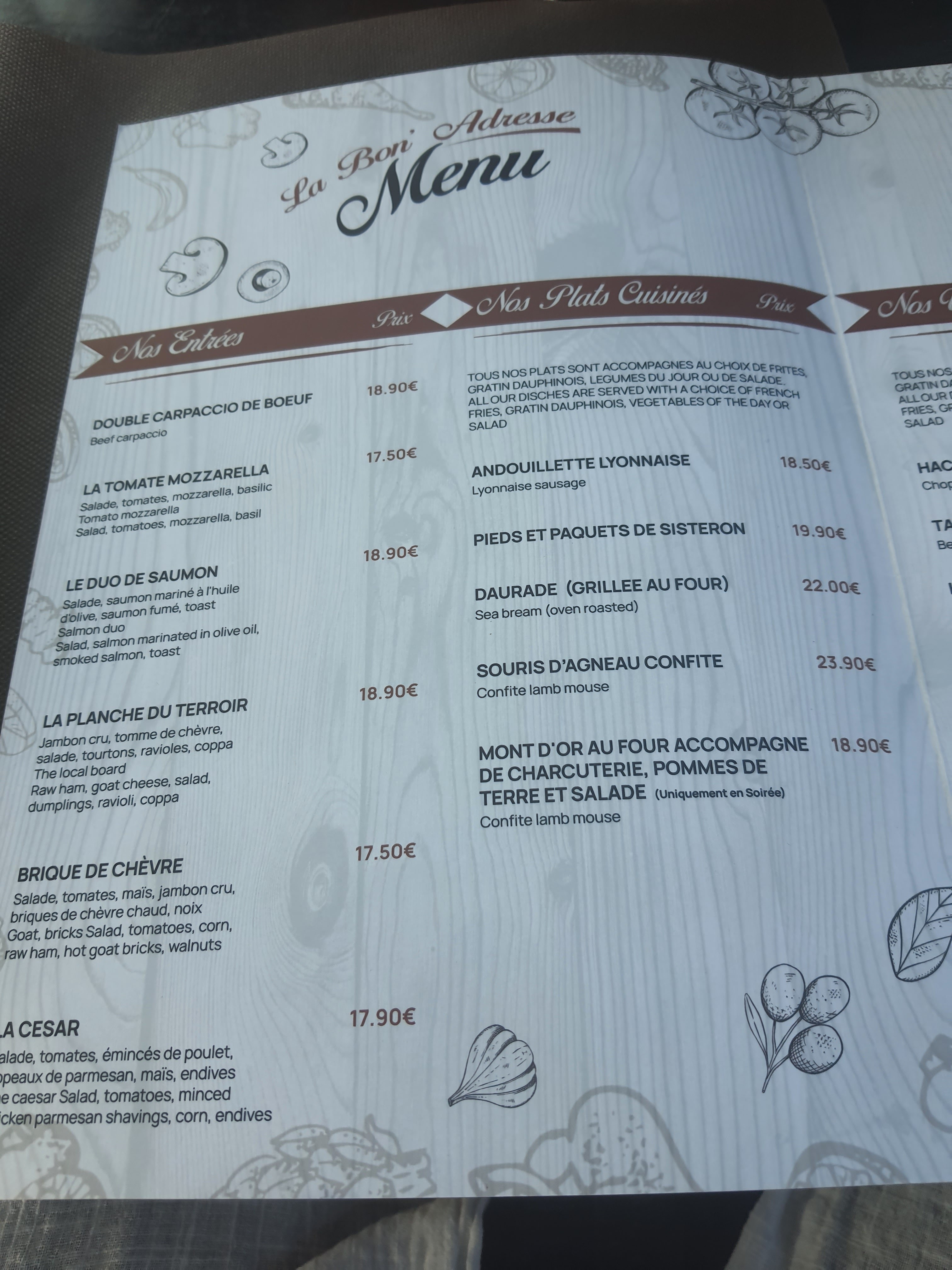 Très belles portions pour les plats, même s'il a manqué de la cuisson sur un gratin dauphinois et il manquait de l'assaisonnement pour le carpaccio (poivre du moulin, plus d'huile d'olive, etc). Service rapide et souriant. Une bonne halte à la Bonne Adresse
