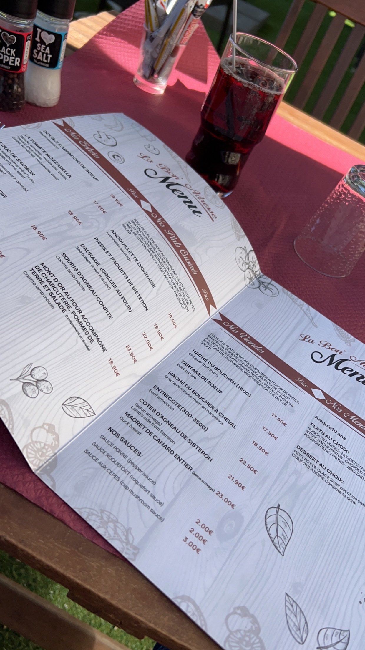 Service et serveur très sympathique J’ai pris un Pepsi Fraise Une entrecôte 300-350g +Frite. Excellent En dessert un fondant au chocolat. Total 35€ Pour le plat le prix et bon maltées les 2€ de supplément pour une sauce au poivre. Je trouve un peut chère le fondant au chocolat malgré qui soit super bon aussi. Je recommande cette adresse.