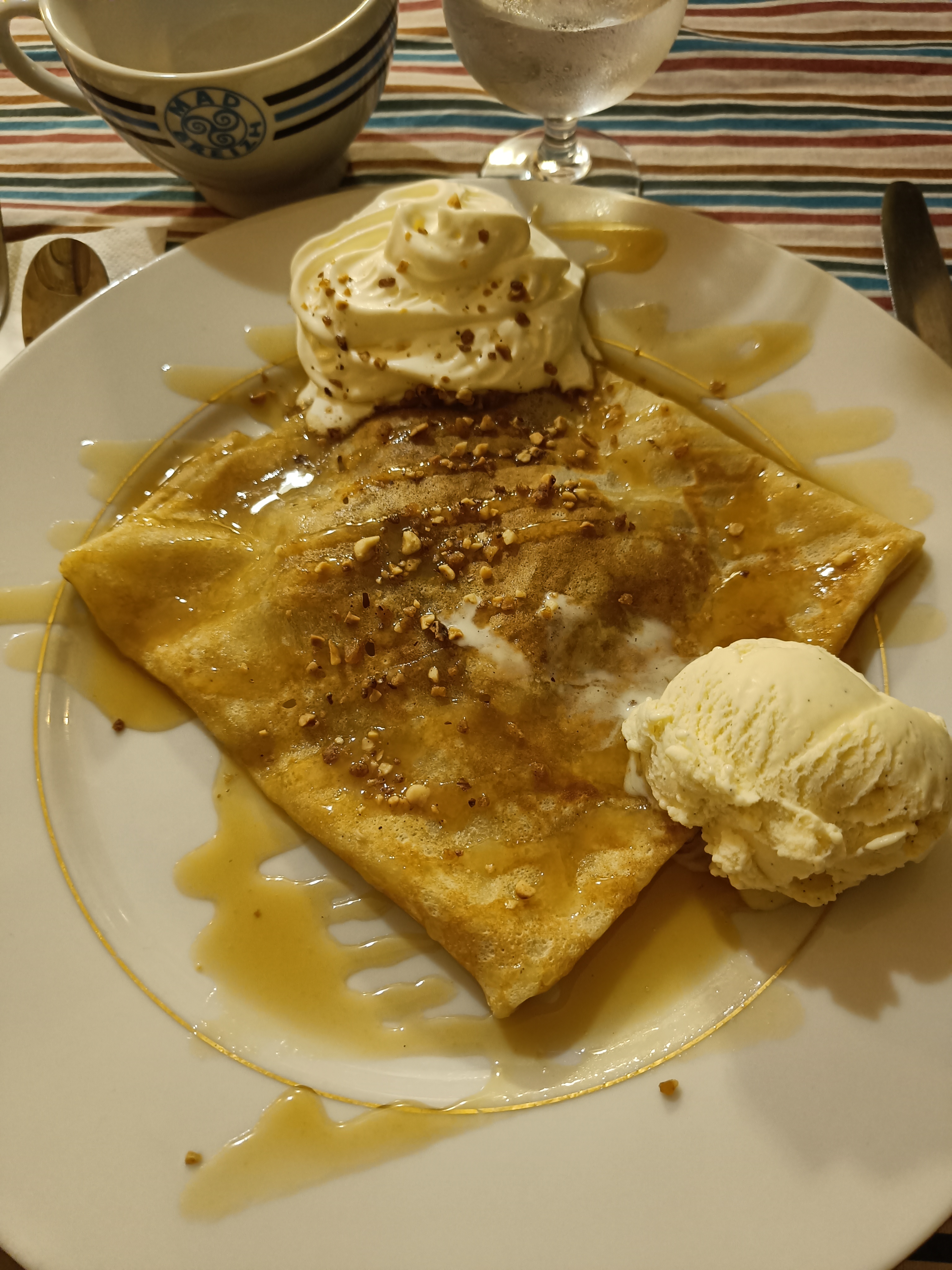 Galette thaï annoncée épicée aura été bien fade et surtout très peu garnie. La crêpe chocolat, quant à elle, était trop cuite et la chantilly un peu liquide. Heureusement que ma compagne, qui a eu plus de chance que moi, n'a pas pu finir sa double crêpe, ce qui m'a permis de repartir sur une note positive 😁