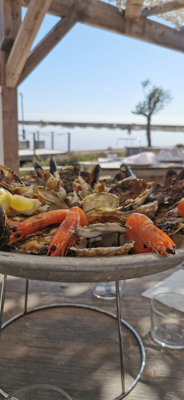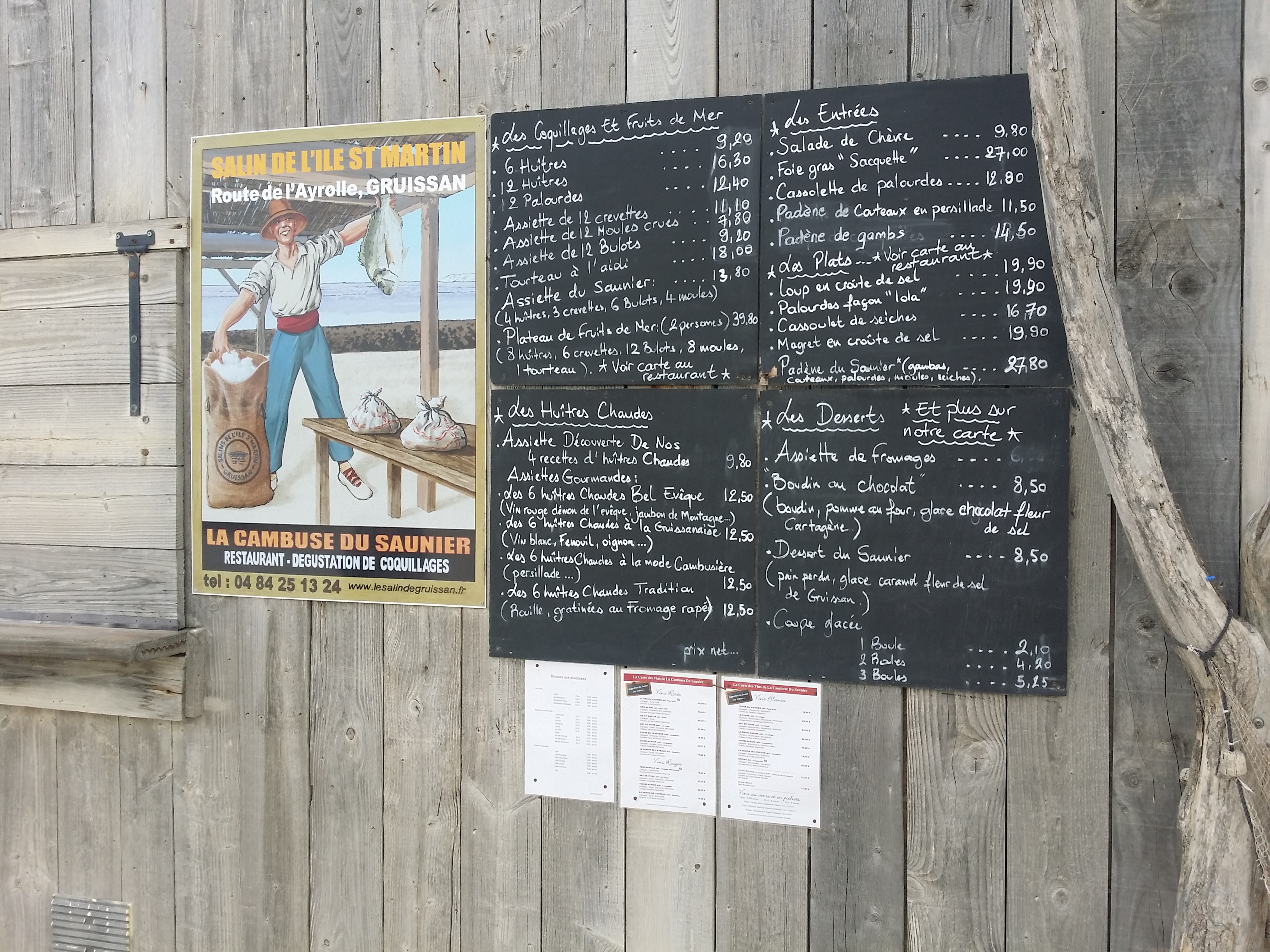Cadre enchanteur sur les salins. Dommage que le plateau de fruits de mer soit servi dans un jus de glaçons fondu. C'est moins sympathique de devoir attrapper les huitres, moules, boulots et crevettes qui baignent dans l'eau pour pouvoir les manger...
