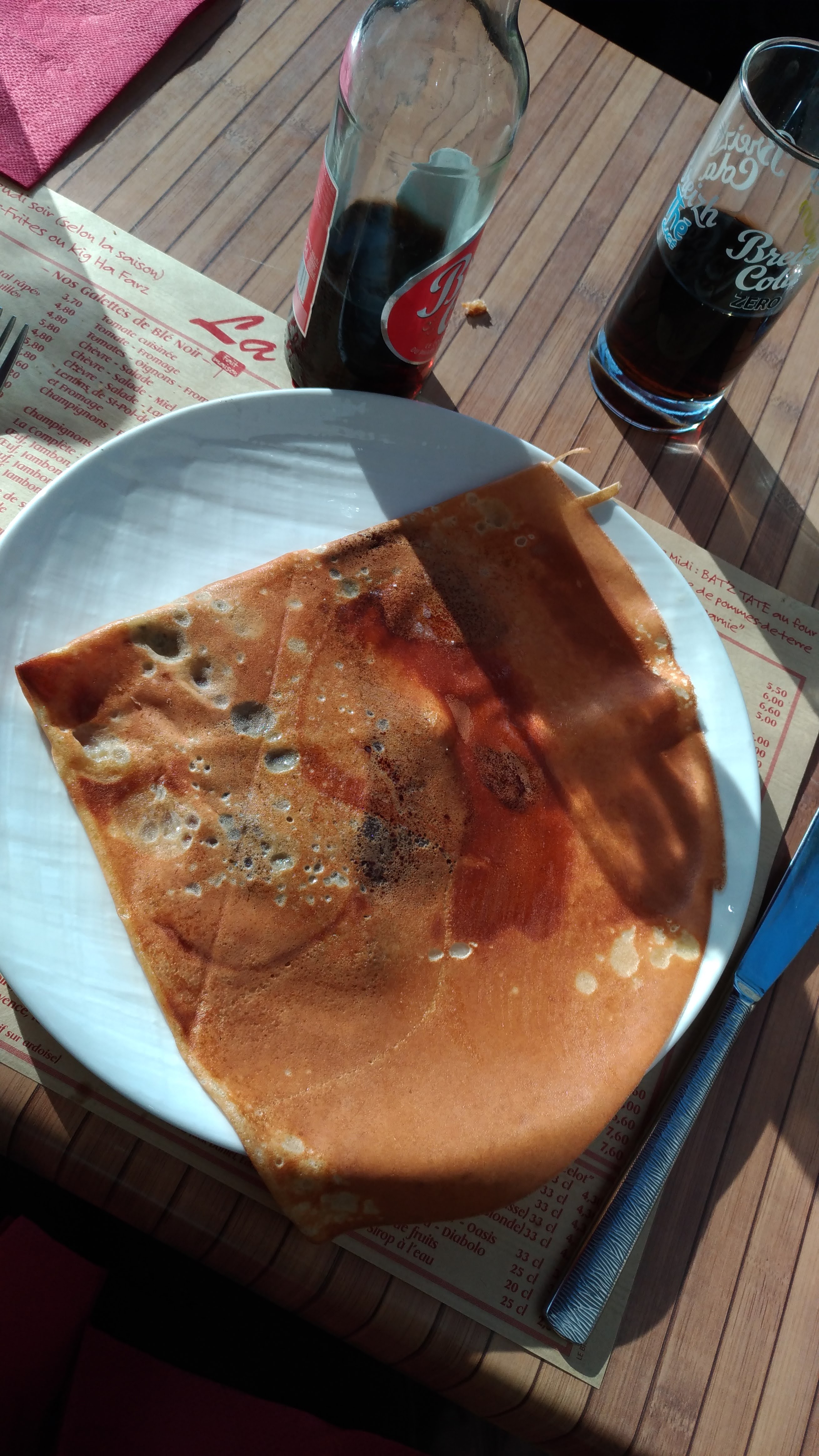 Posté le 27/07/2018 à 12:59"Avis mitigé. L'accueil est plutôt sympathique, or une fois a table la serveuse nous annonce sèchement qu'à cette heure ci la carte est reduite. Effectivement le choix est plus que restreint et se cantonne a quelques crêpes. De plus, nos voisins de table servis en même temps que nous ont droit a la carte complète. Les tarifs sont un peu élevés mais je pense que c'est normal pour l'île. Bref notre crêpe était bonne mais ce restaurant est sans doute plus agreable avant 13h30"