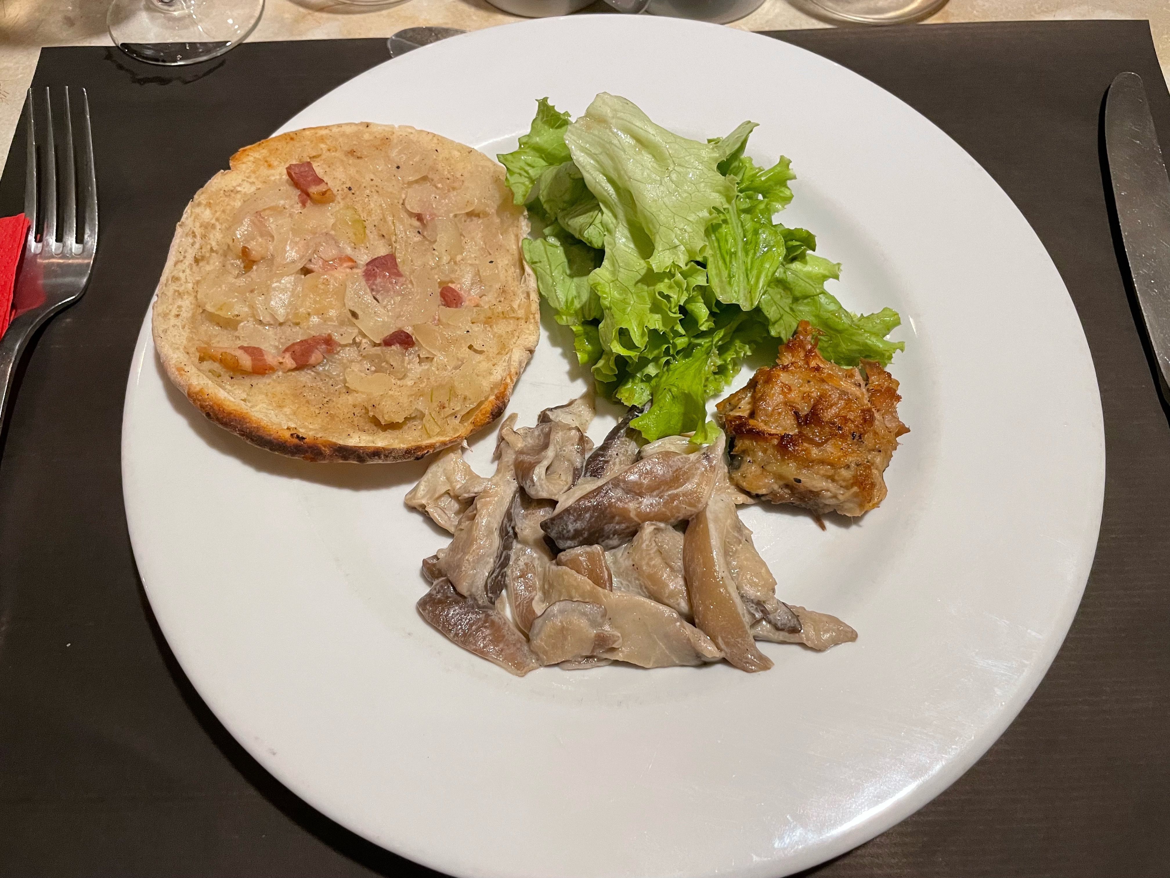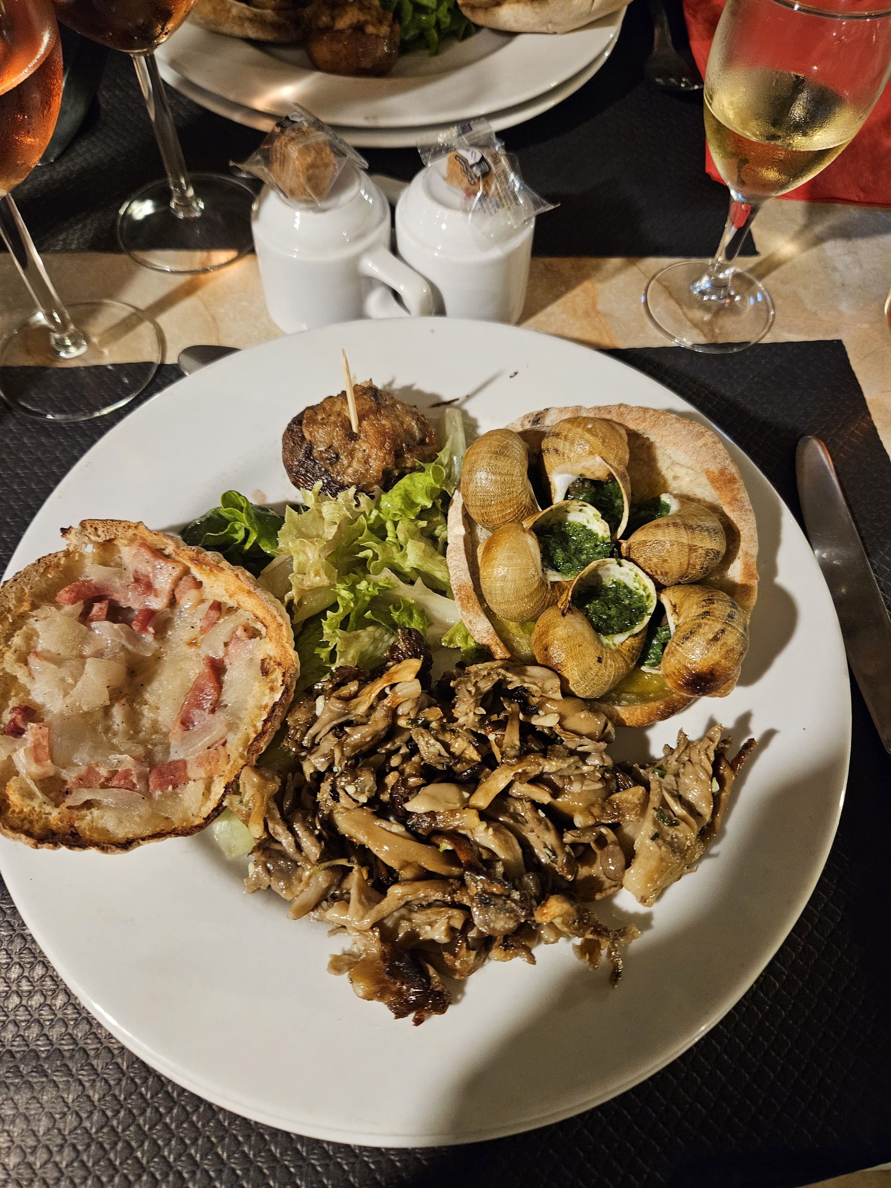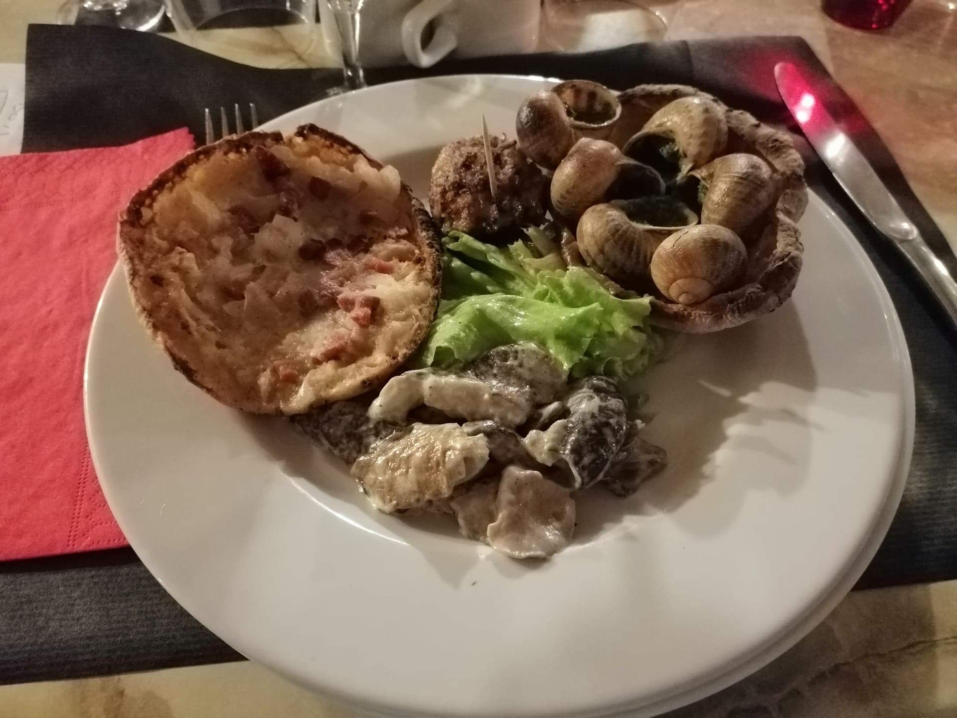 Concept de menu unique sympa avec les champignons et les escargots de la cave et les fouees sorties du four. Service très sympa Venez chaudement habillés !
