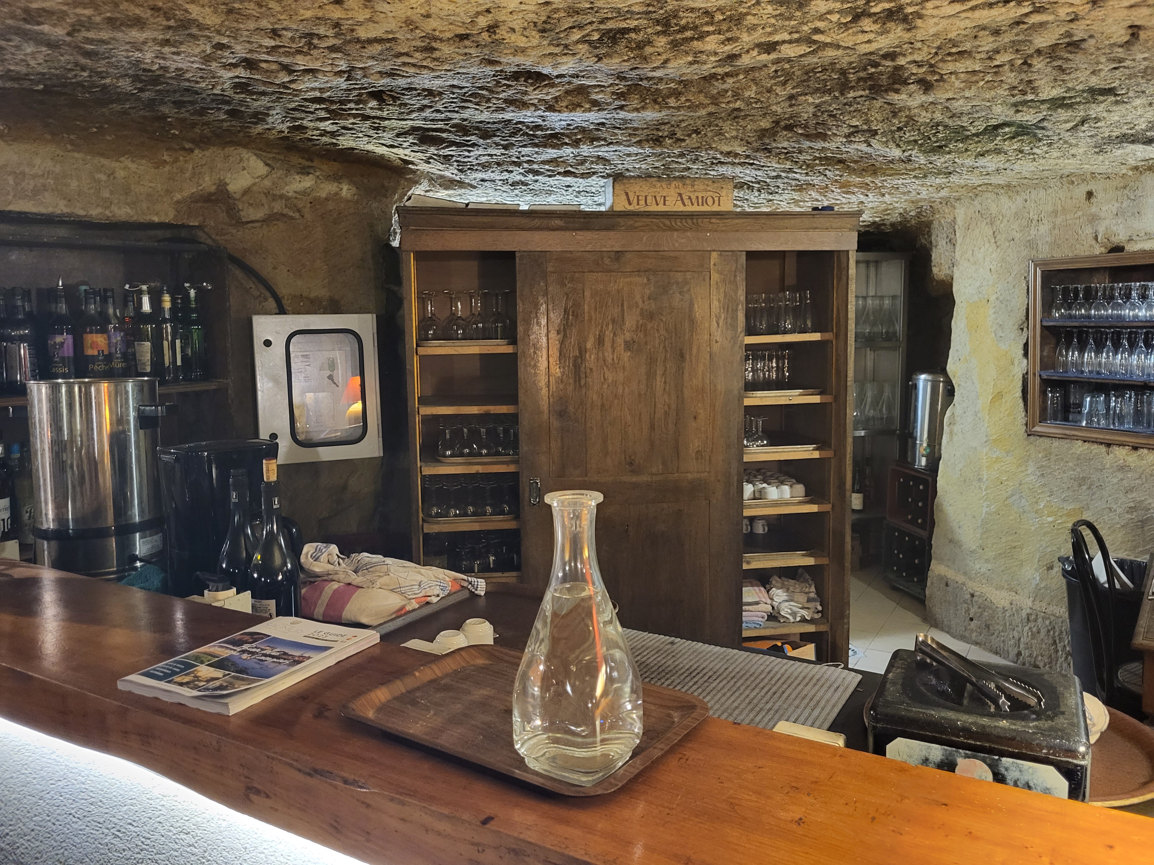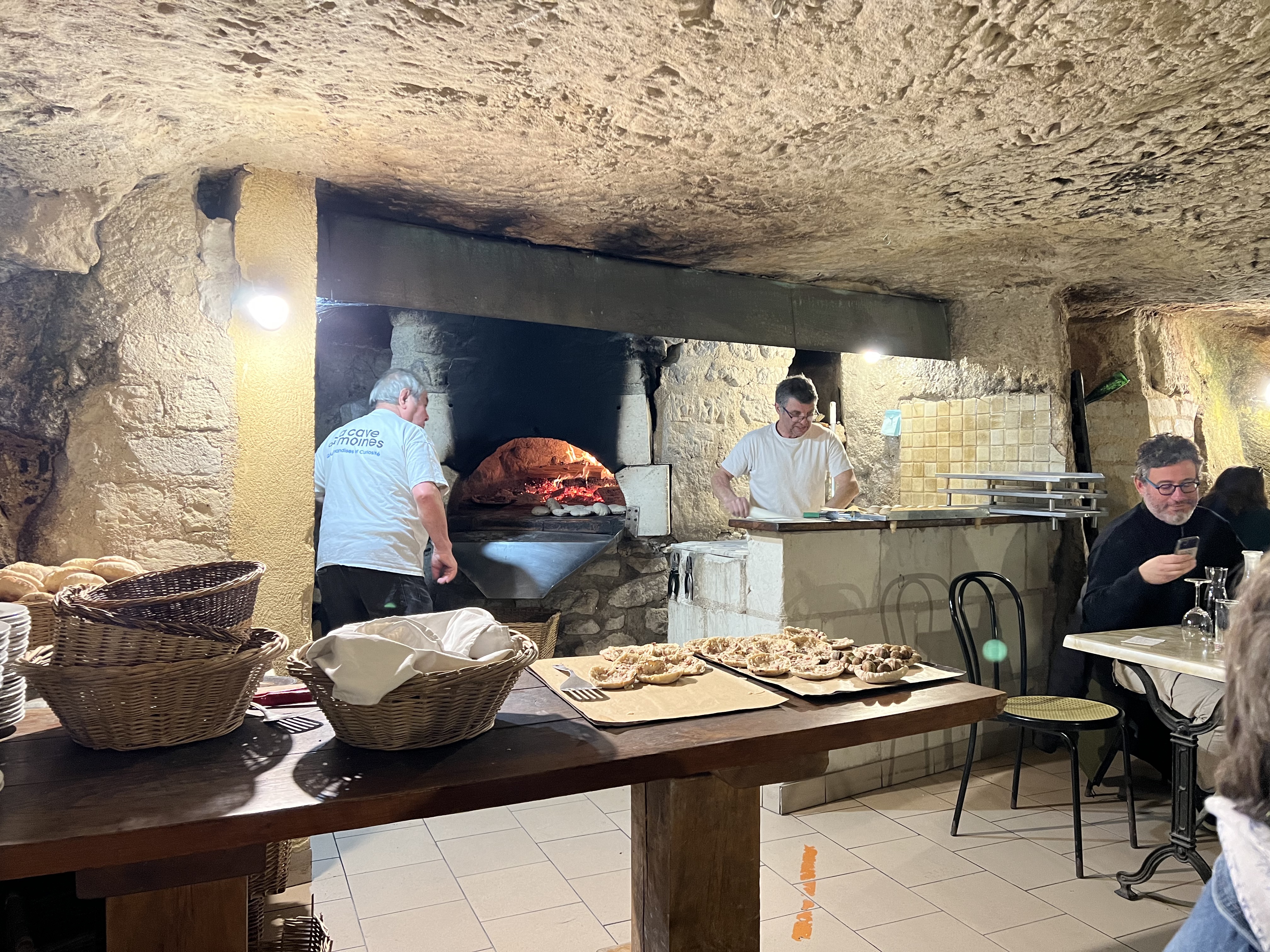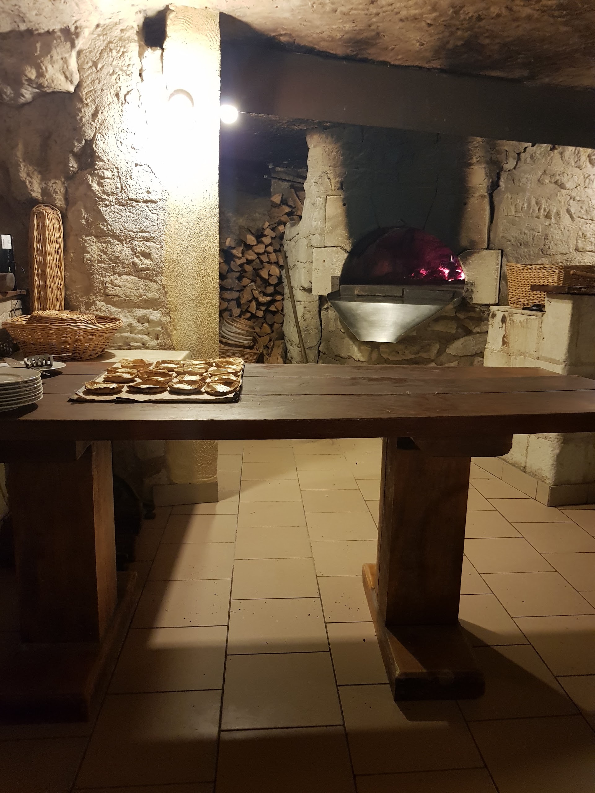 Endroit atypique et typique du Maine et Loire Nous voilà plongés dans des grottes troglodytes en rive de Loire Plus déclinaisons de menu sont proposés à partir de 25 euros tout compris L'accent est évidemment mis sur les spécialités locales : la fameuse Fouėe, petite boule de pain, cuite au four et fourrée encore chaude, les champignons, les mogettes, les escargots.... C'est bon, simple et efficace ! Vous pouvez voir le cuisinier préparer les fouėes et les insérer dans le four à pain C'est grâce à ce vieux four qu'on ne recent ni le froid, ni l'humanité. Si le cœur vous en dit, après le repas, vous pouvez visiter les galeries annexes (payant) Je vous conseille fortement d'y faire une halte.