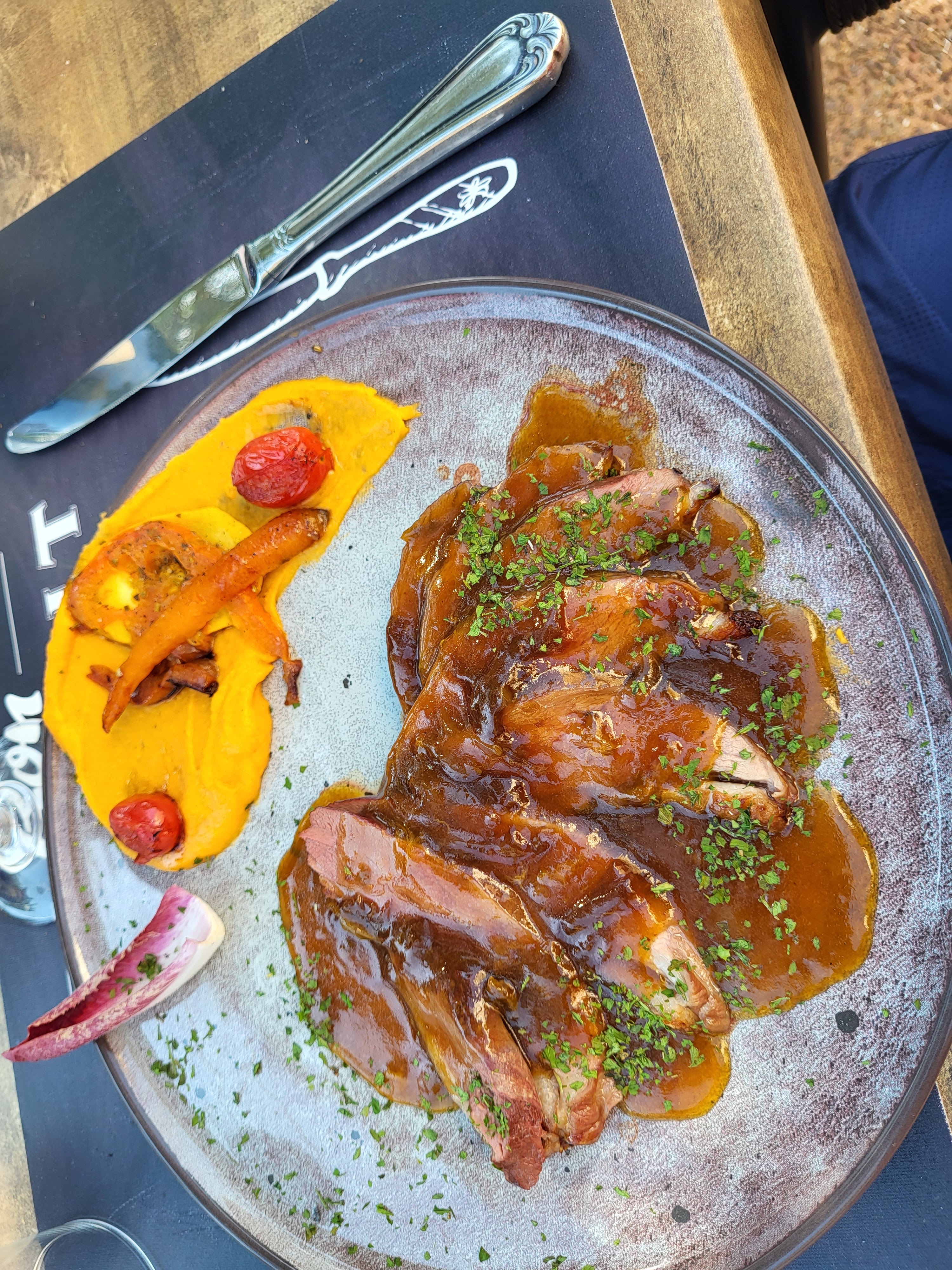 Nous nous sommes arrêtés au hasard pour déjeuner et voir la vue. Les deux plats ont été extrêmement bien préparés, avec une touche délicate et une technique réfléchie. La « Margret de Canard à l’orange » était accompagnée de plusieurs tendres tranches de canard préparées avec une sauce sucrée-salée à base d’orange et de figues. En dessous se trouvait une tranche de pain sucré, qui se marie bien avec les figues. Le canard, la sauce et les pommes de terre sautées constituent également un excellent accompagnement. Dans l’ensemble, le plat peut être décrit comme audacieux et profond. C’était une belle exploration du contraste entre le sucré et le salé. La « Blanquette de Lotte / riz » a été présentée avec la lotte cuite à un niveau ferme et savoureux, avec la sauce à la crème décrite comme délicate et complémentaire au poisson. Le riz était cuit avec un léger assaisonnement et était ferme mais savoureux. Le plat dans son ensemble est mieux décrit comme étant sobre, mais nuancé. C’était une préparation très gourmande qui met très bien en valeur les qualités de la lotte. Chaque plat coûtait environ 25 € et les deux spécialités de café que nous avions commandées coûtaient environ 8 € chacune.