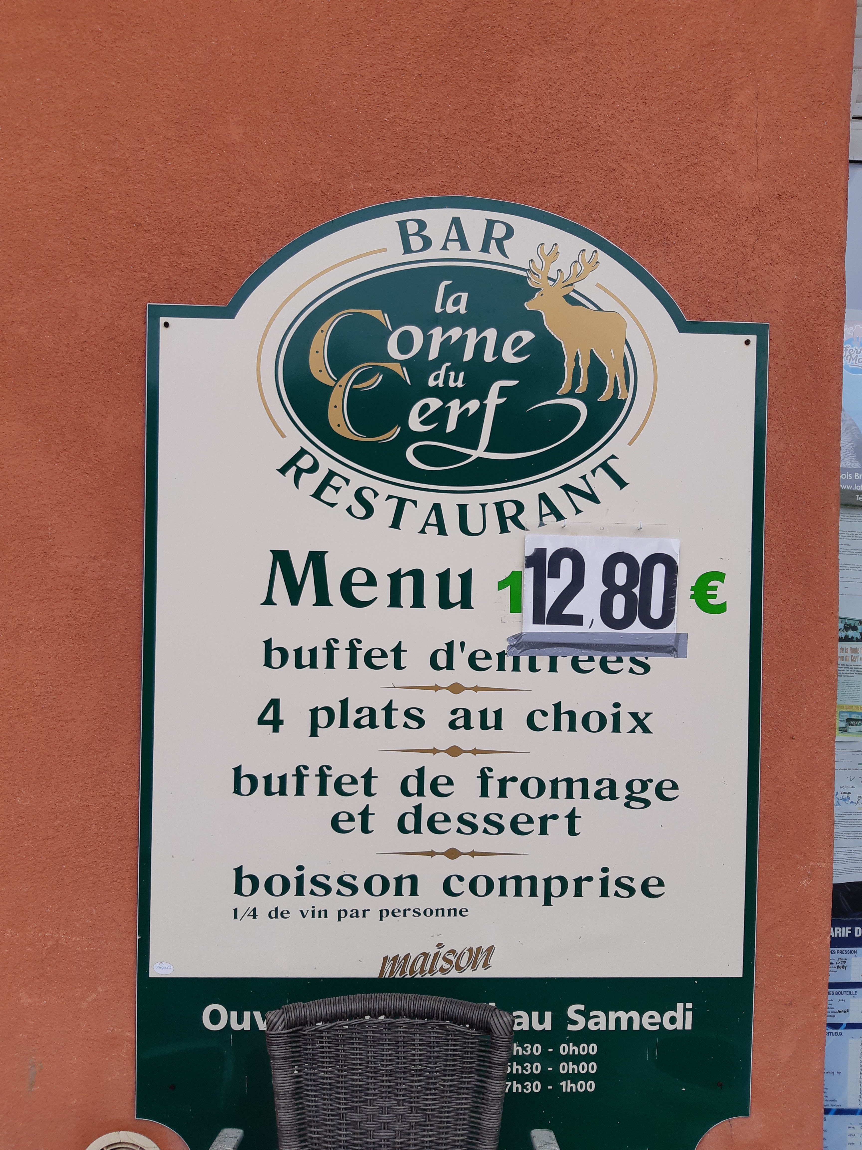 Nous aimons venir à la Corne du Cerf. Par contre, il faut de préférence retenir sa table. Nous n'avons jamais été déçus. Le prix est très correct pour le menu tout compris : beaucoup de choix dans les entrées sur le buffet, 2 plats aux choix, fromage et dessert avec vin compris. Le patron est super et le personnel très sympathique