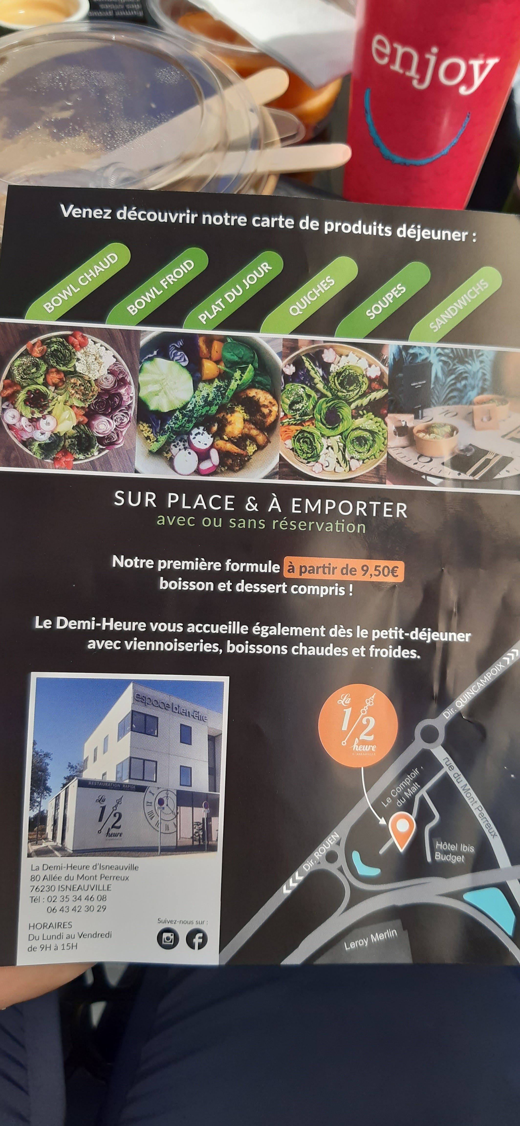 Parfait, rien à redire, les bowls sont très bons réalisés avec soins, copieux et avec des produits de qualités. Le personnel et sa responsable sont absolument charmants. Nous avons également testé le service traiteur avec le buffet pour notre cérémonie de mariage, bluffant !! la présentation est superbe et change vraiment des buffets traditionnels, et vraiment très excellent. Nous ne pouvons que recommander la demi-heure.