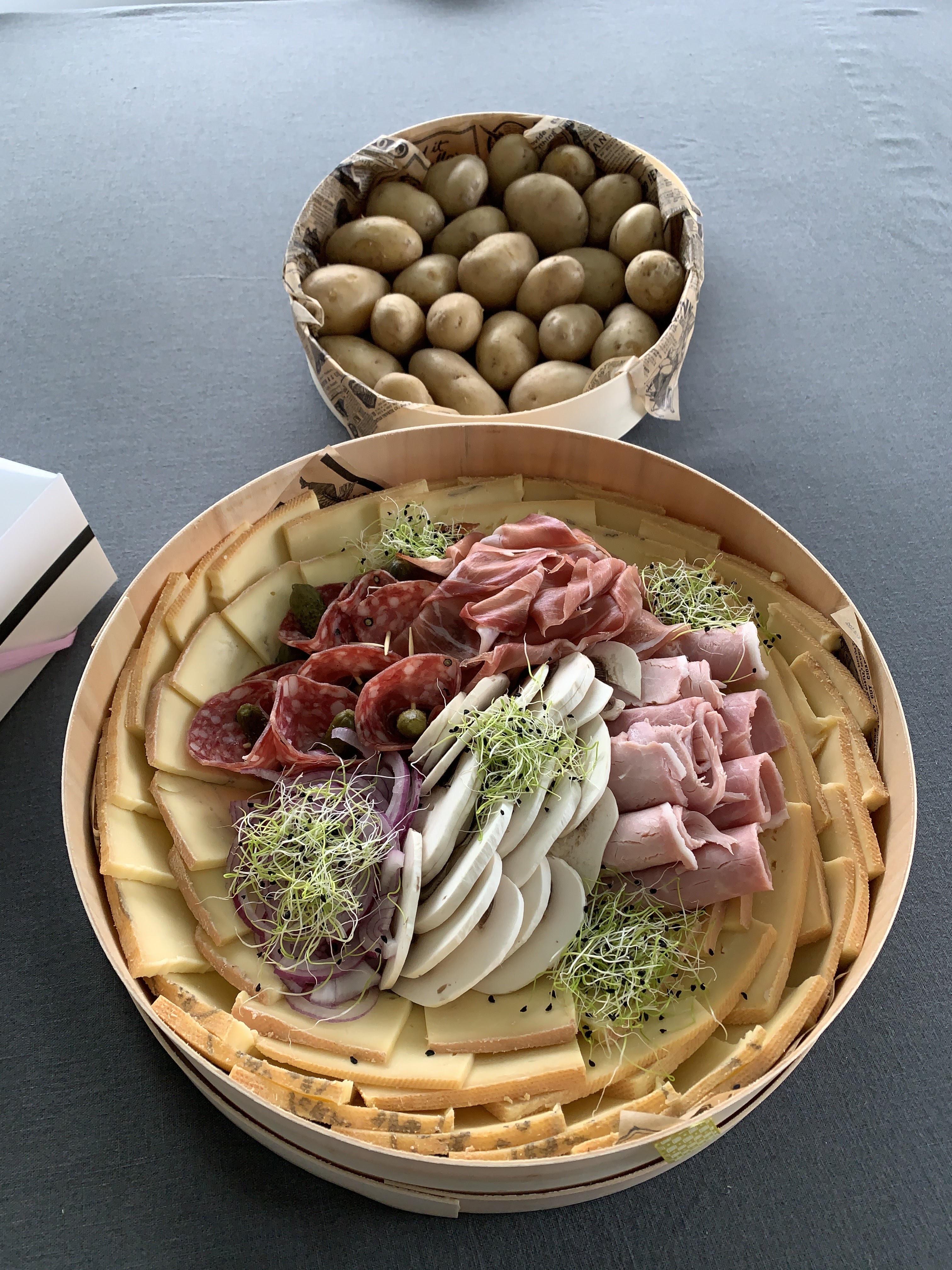 Plateau raclette super beau à voir et fait avec de très bons produits : plusieurs variétés de fromage à faire fondre, mix de charcuterie et pommes de terre déjà cuites .. parfait pour inviter sans rien préparer ! Merci ☺️