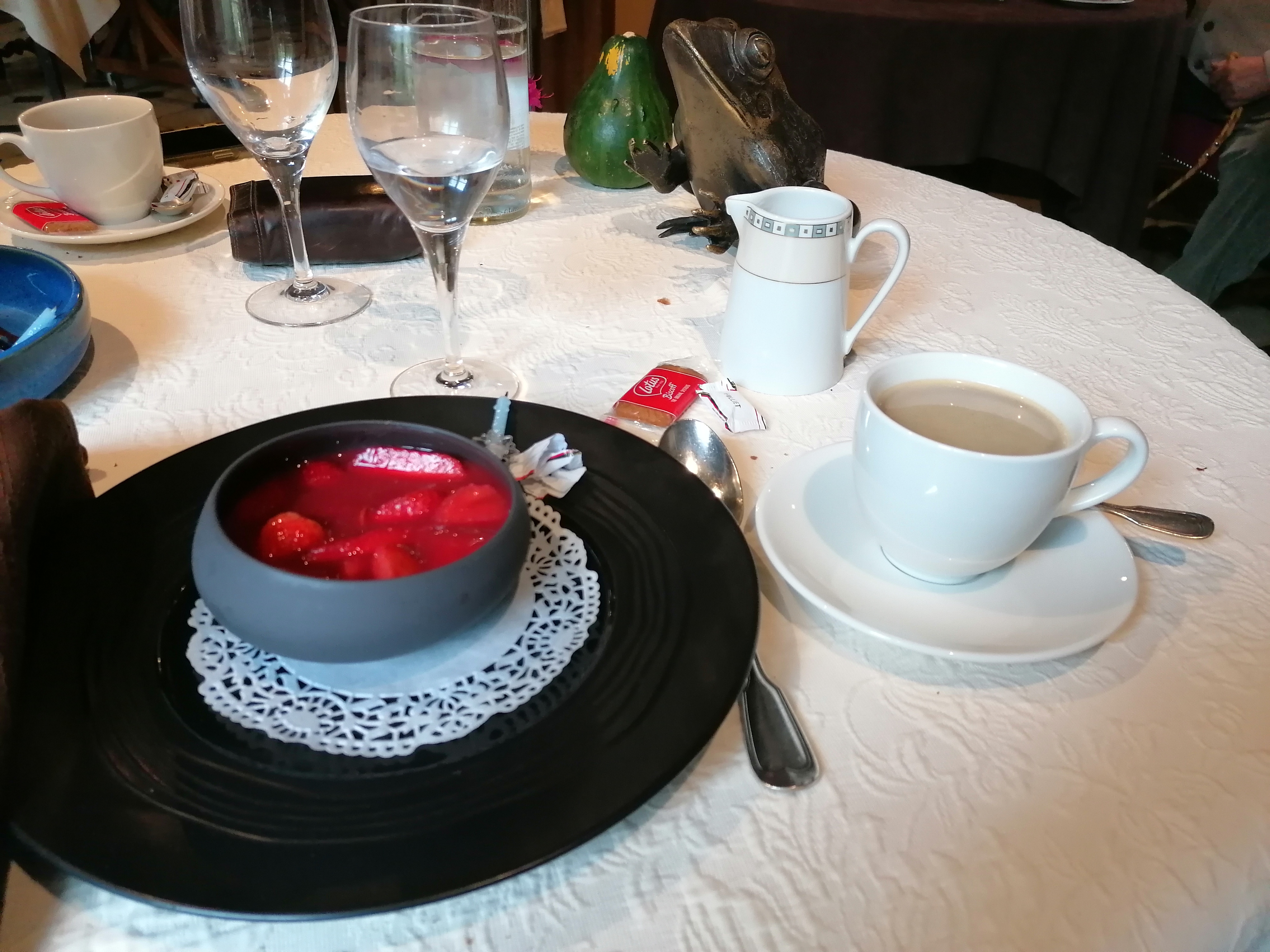Posté le 11/05/2024 à 10:24"Dîner très tranquille au coin du feu de cheminée en un soir frais de printemps, en pleine semaine ! Belle cuisine normande, ce qu'il faut de raffiné sans en faire trop. J'ai pris Nage de langoustines et soles, et pavlova de fraises. Délicieux... Accueil agréable et cadre intimiste et protégé dans la verdure. Cela doit être aussi fabuleux quand il fait beau, sur la terrasse du jardin."