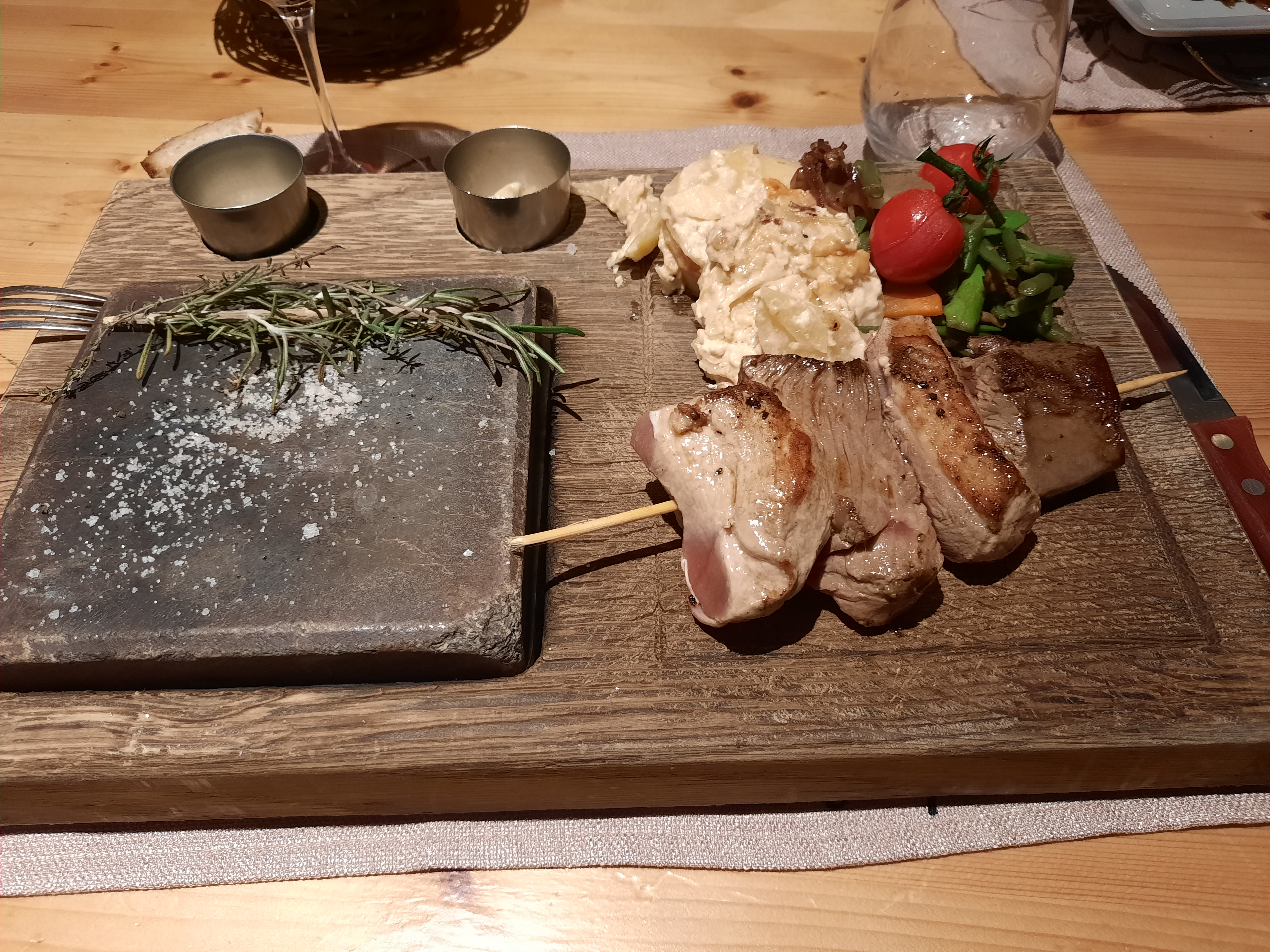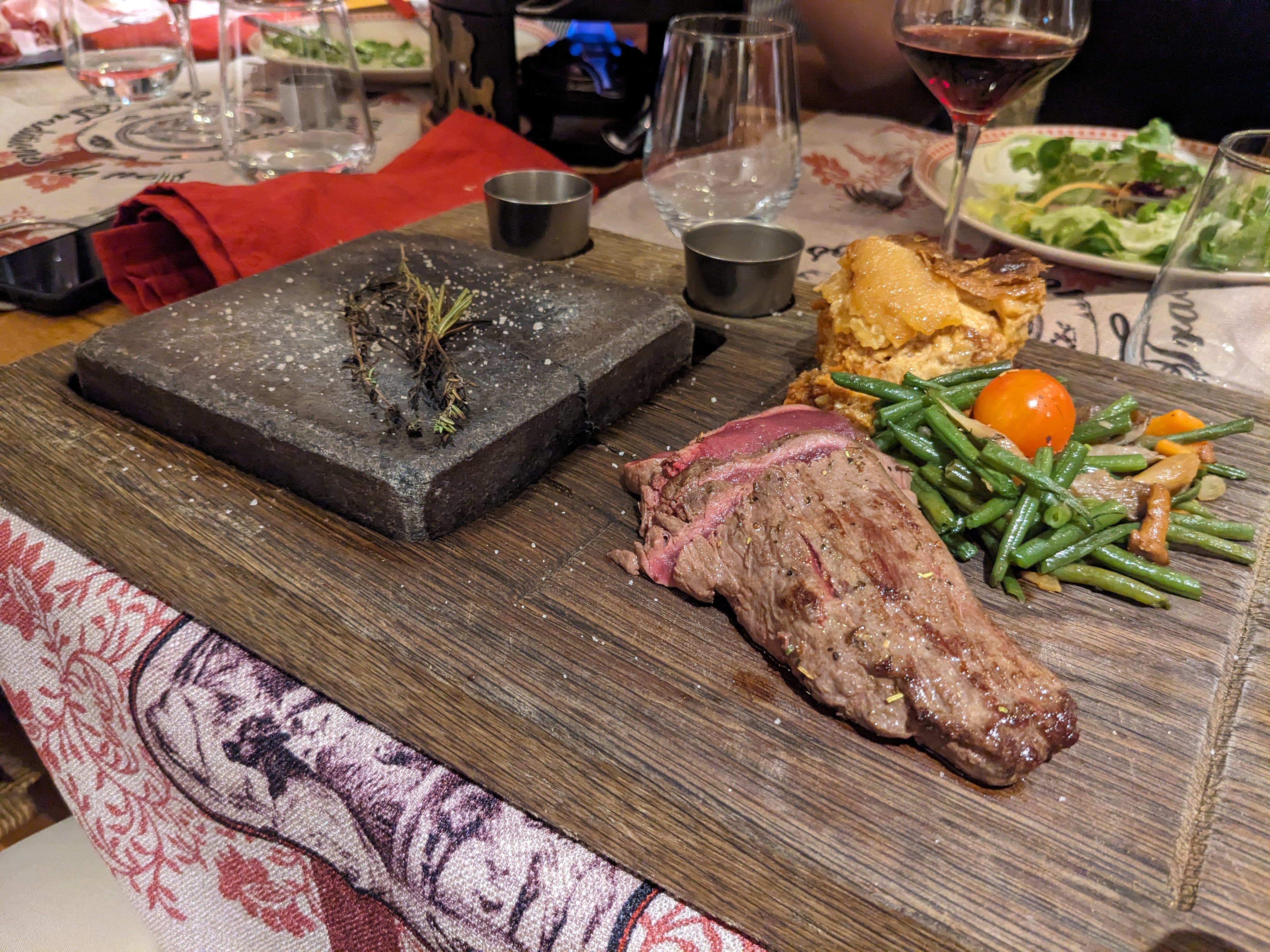 En terrasse cet été, le cadre était magnifique! Mais l'intérieur façon chalet alpin vaut également le coup. La nourriture et le service toujours excellents (c'est la quatrième fois que nous venions). Un gros coup de coeur pour l'originale façon de cuire soi-même sa viande sur pierre chaude! Nous recommandons vivement !