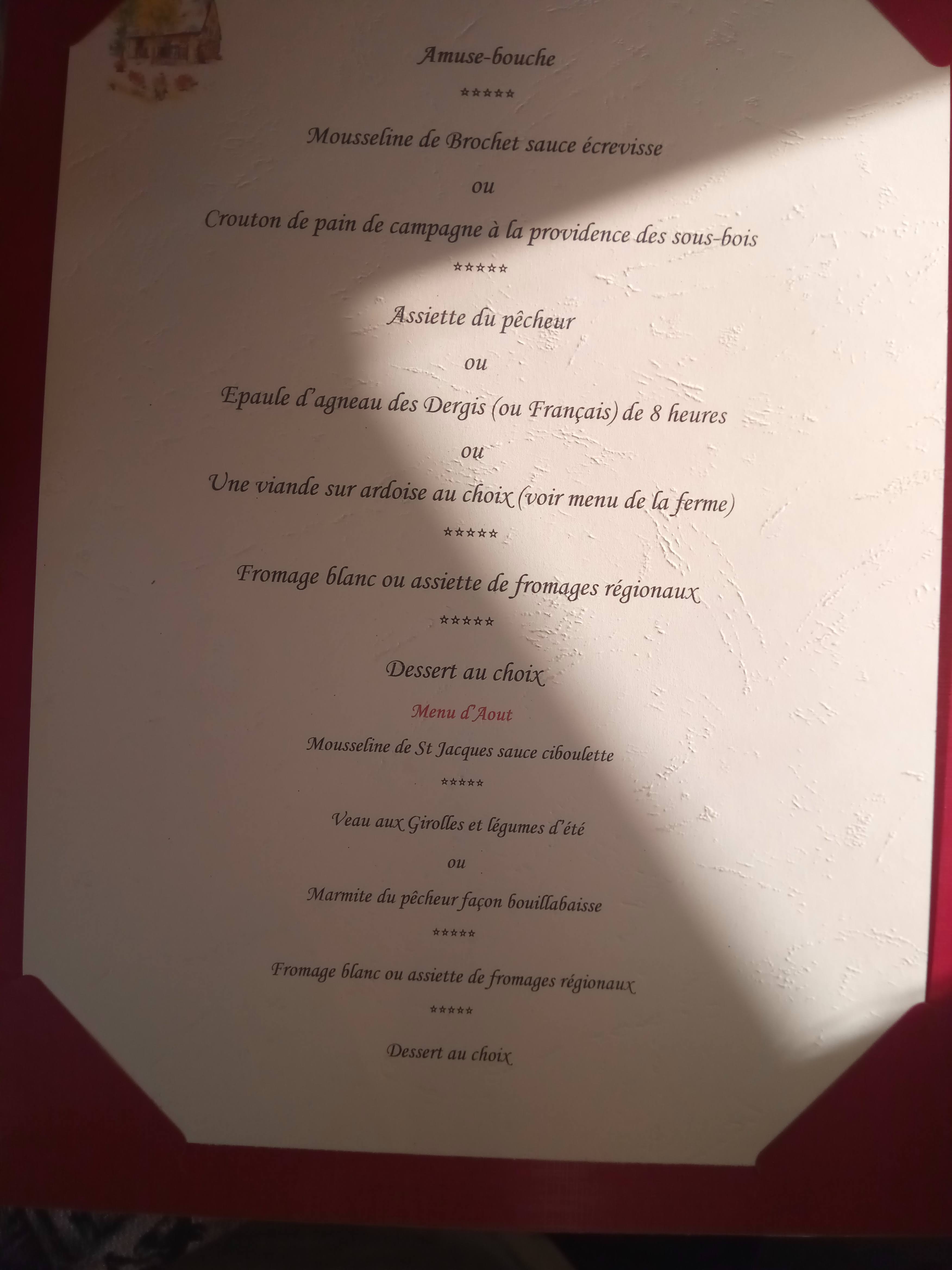 Restaurant excellent, cadre magnifique, repas de haute qualité (terroir français).Service et cuisine impeccable, on y retournera avec grand plaisir.