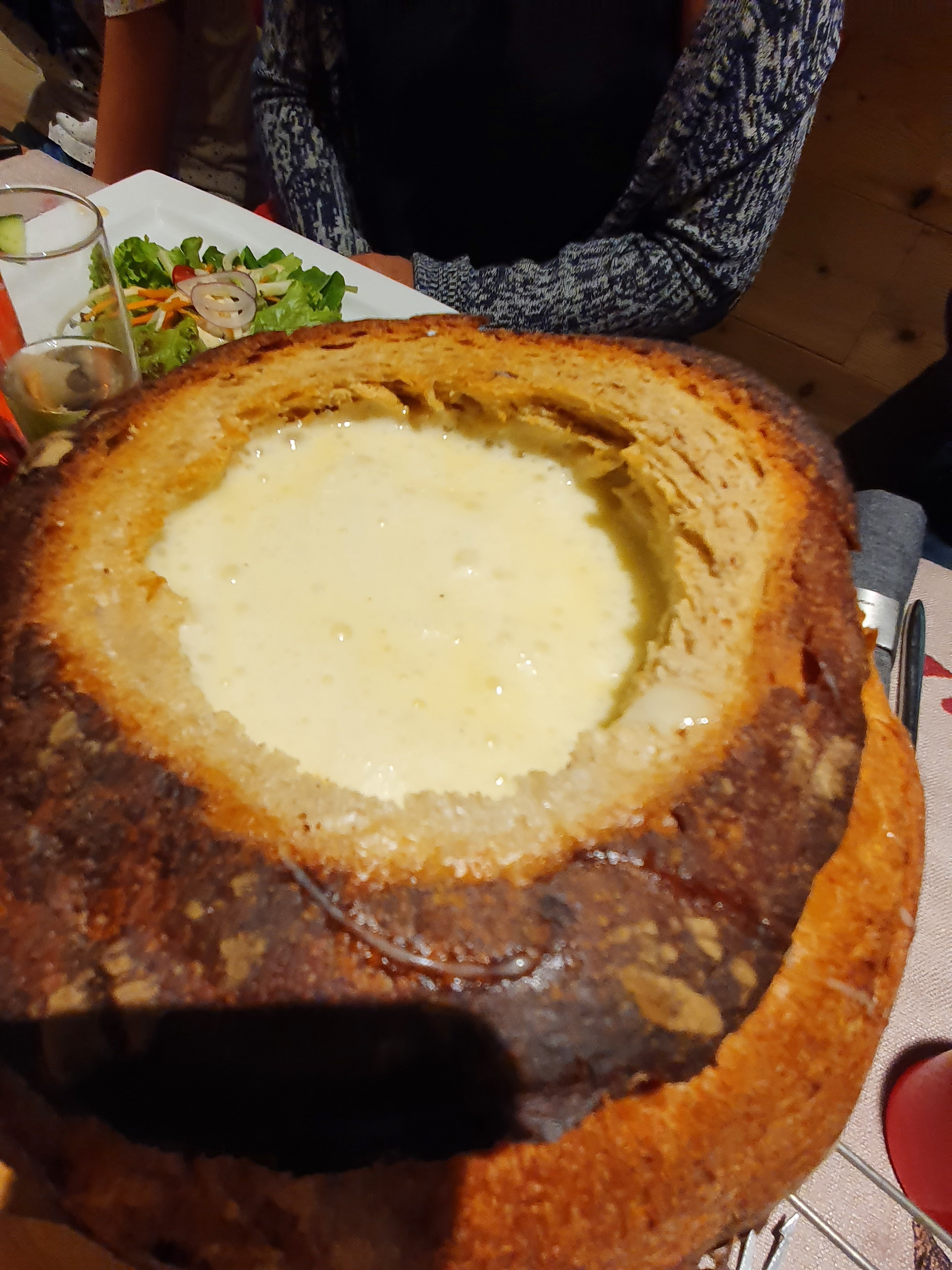Découverte exceptionnelle de la fondue dans une miche de pain Très bonne adresse bon accueil Visite du patron a la fin du service
