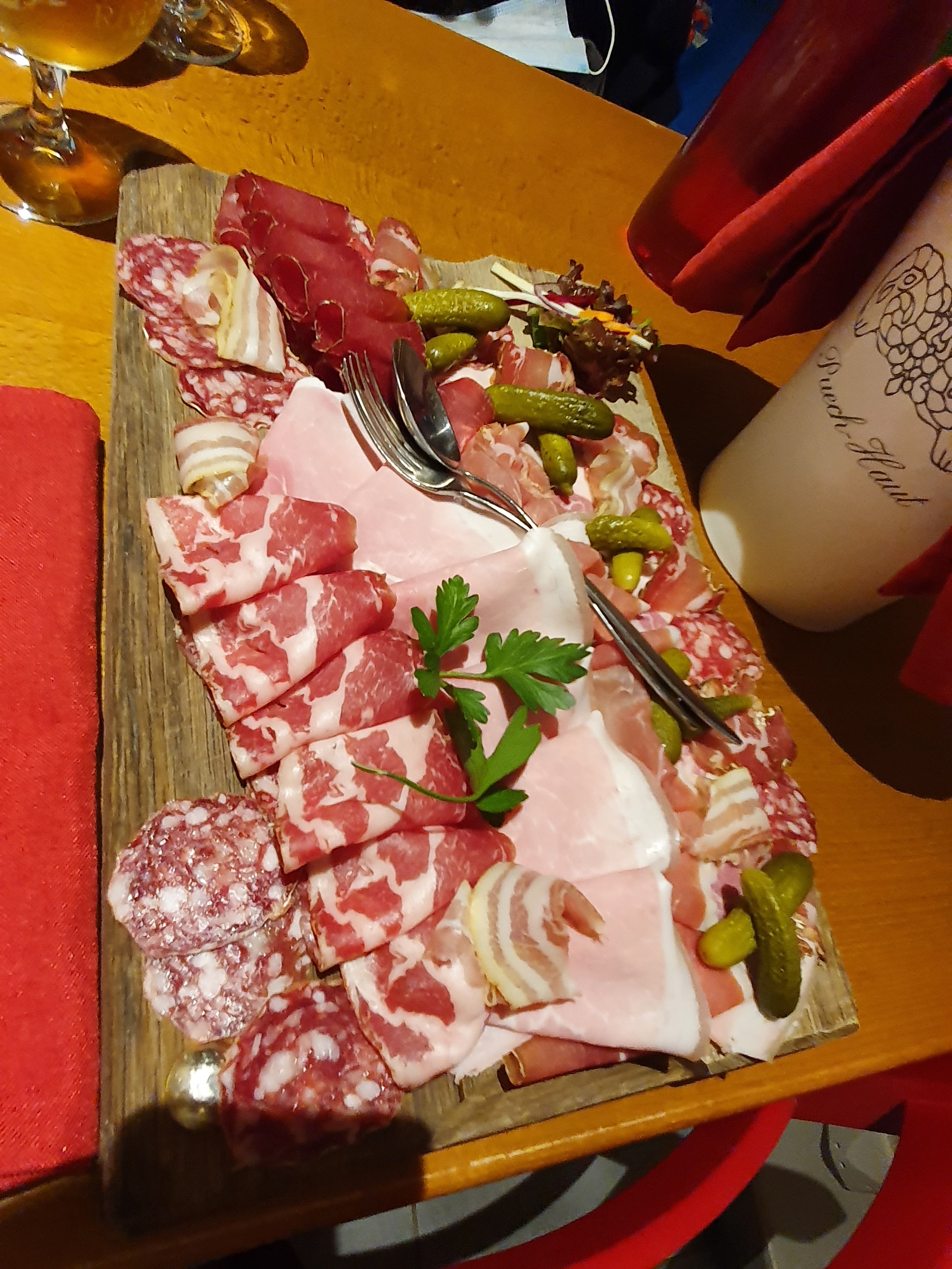 Découverte d'une restaurant, niché dans les hauteurs de Hauteville, où rien ne perturbe un repas bon en saveur, une cuisine issue d'un circuit court. Des plats toute en élégance mais simple. Une coupe du Bugey en apéritif, accompagnée de son tartaredz boeuf, une petite pépite. Le gâteau de foie sauce écrevisses, un régal. Le pavé de cerf de chasse, en cuisson sur une ardoise, issue de de la prasinite, apporte une authenticité au plat, où chacun cuira sa viande selon ses envies. Une découverte pleine de charme et d'authenticité. À refaire pour les fondues proposées.