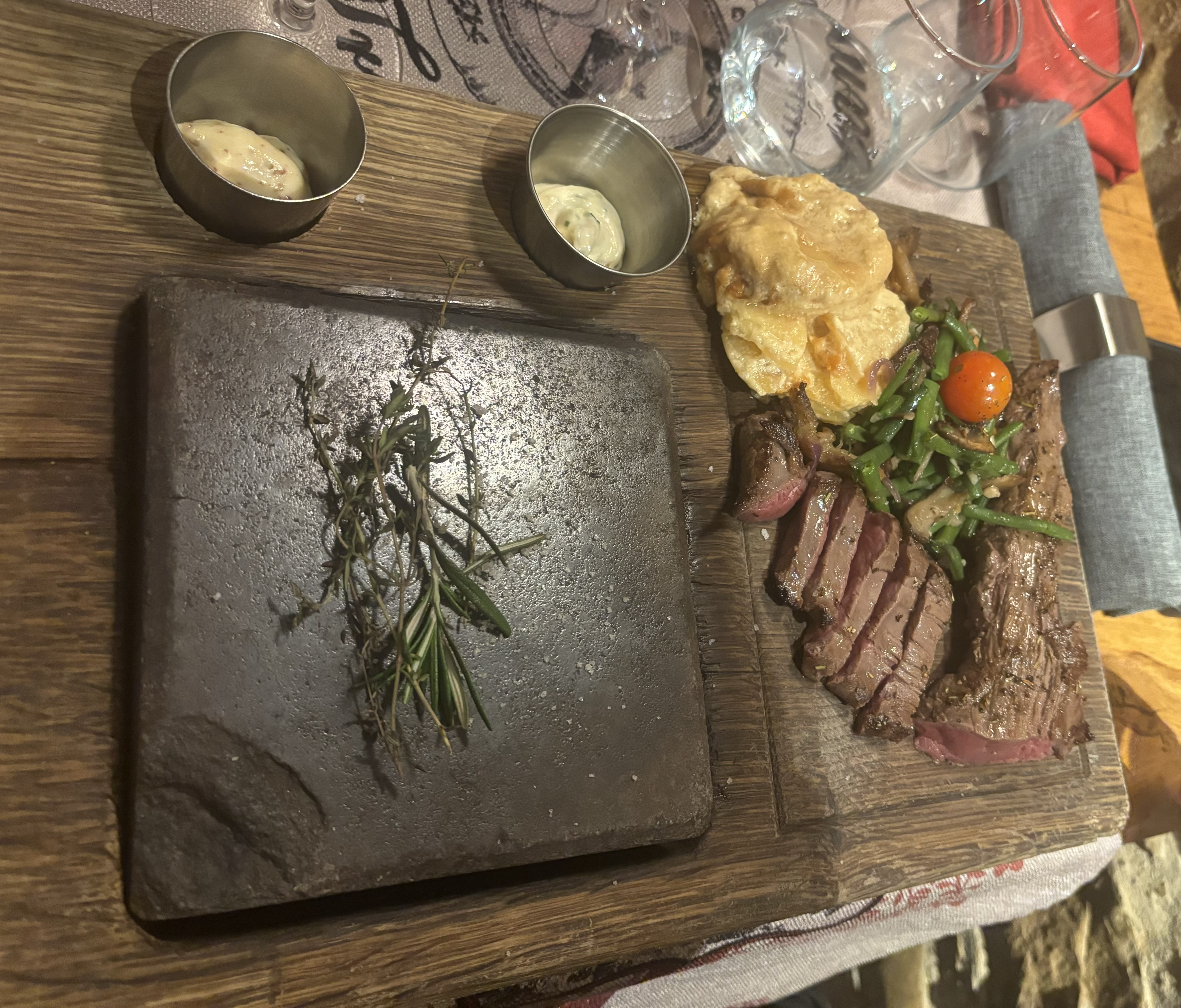 Cuisson sur ardoise exceptionnel . Cadre magique. Les cocktails d'une saveur de la région et la fondue pour finir sur une note fromagère a tombé par terre