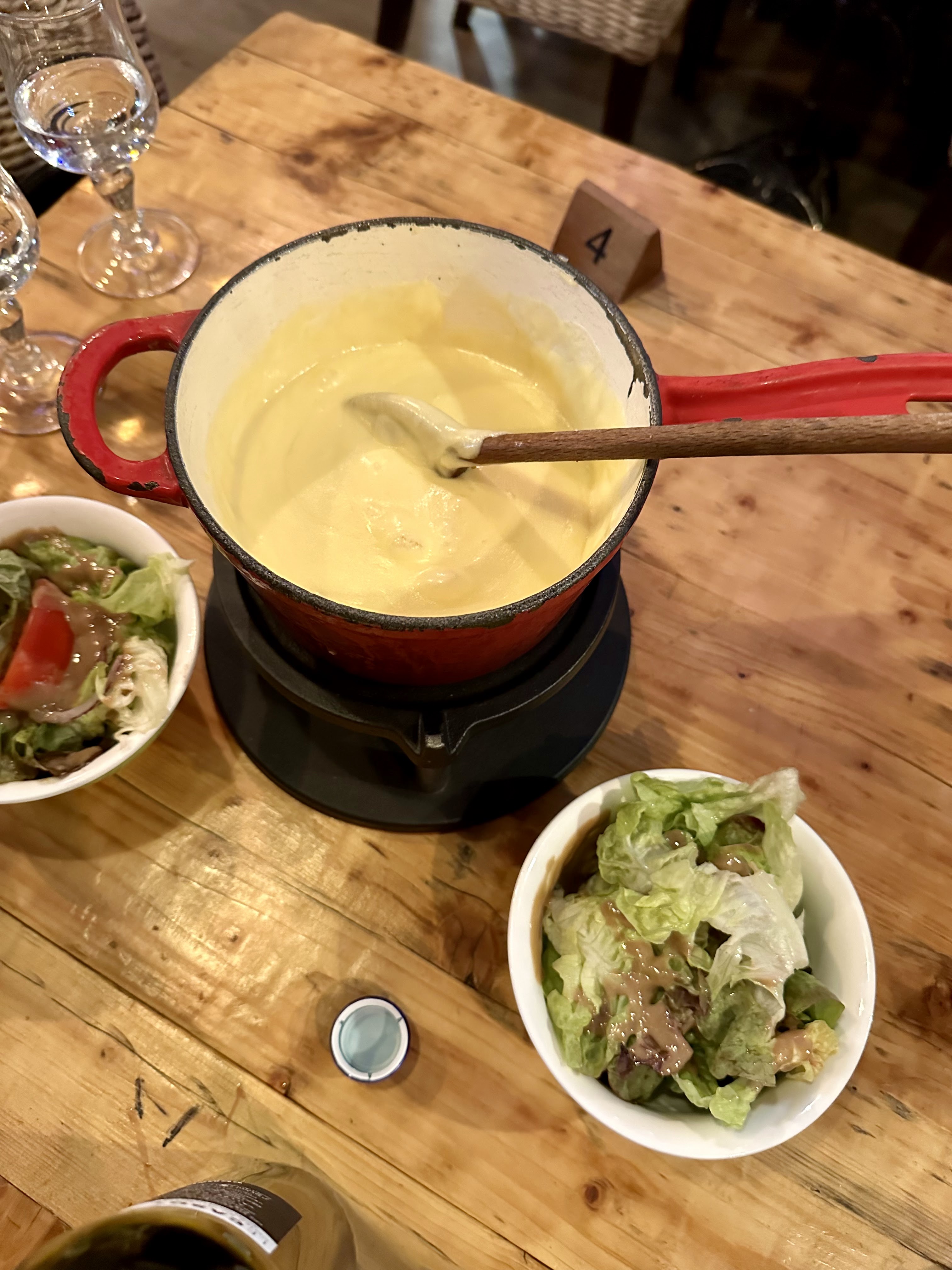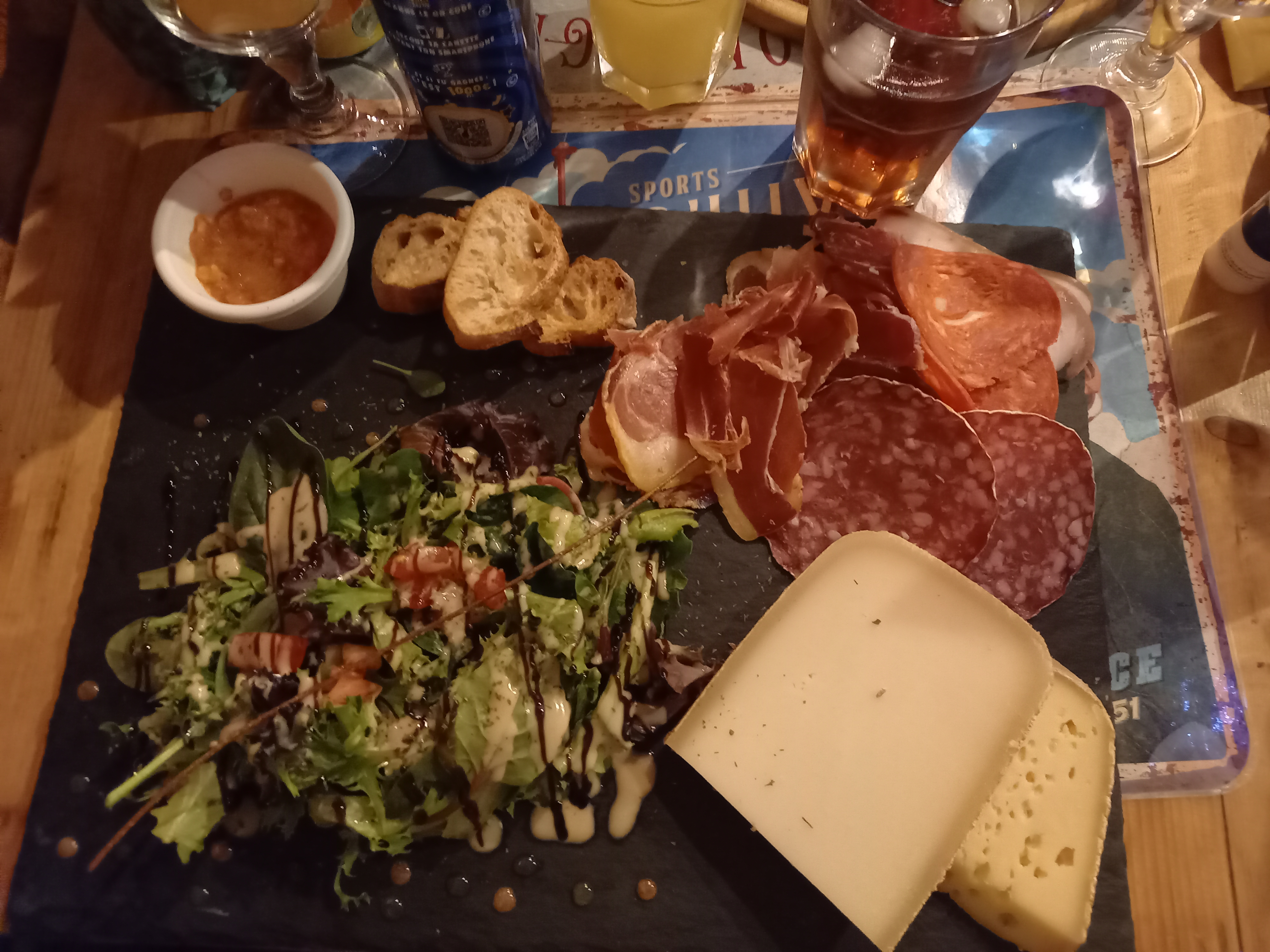 L’attente fut longue… pour la prise de commande surtout ( nous avons bien attendu avant qu’on vienne nous proposer à boire). Alors qu’il n’y avait que 3 tables… Lieu froid , un vent frais envahira vos jambes durant TOUT le repas Pour avoir de l’eau il faut demander et patienter… encore… La fondue est bonne, la charcuterie aussi. Accompagné d’une petite salade. Le café était tiède…