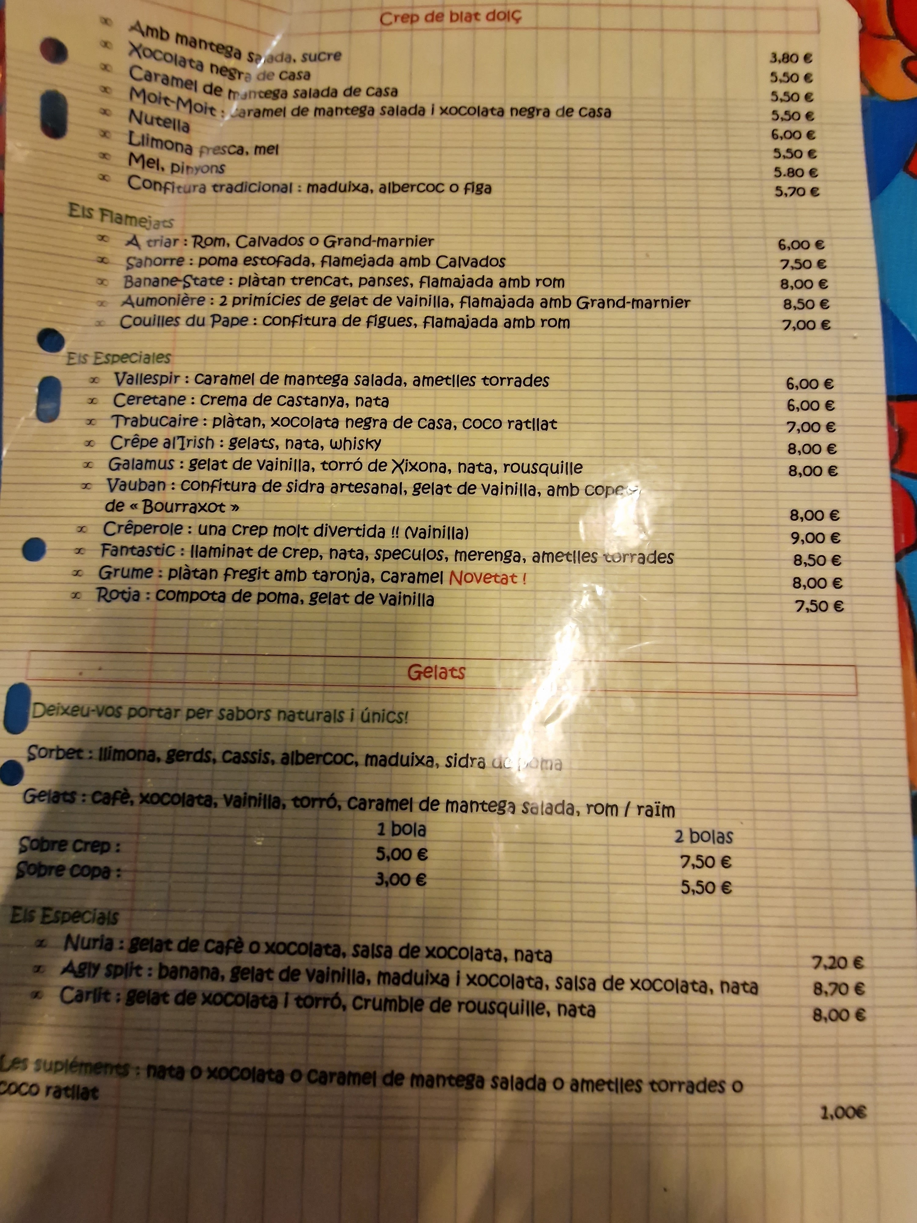 Posté le 17/08/2017 à 14:12"Crêperie excellente. De vrai galette au sarrasin comme on les aime. Mayorcina avec une purée de chorizo qui déchire Et une Anec (canard, glace pomme et sauce Touron chocolat), une découverte et une excellente surprise, on finit l'assiette au doigt ! On a calé donc pas de crêpes sucrées (on reviendra) À recommander. Un grand merci."