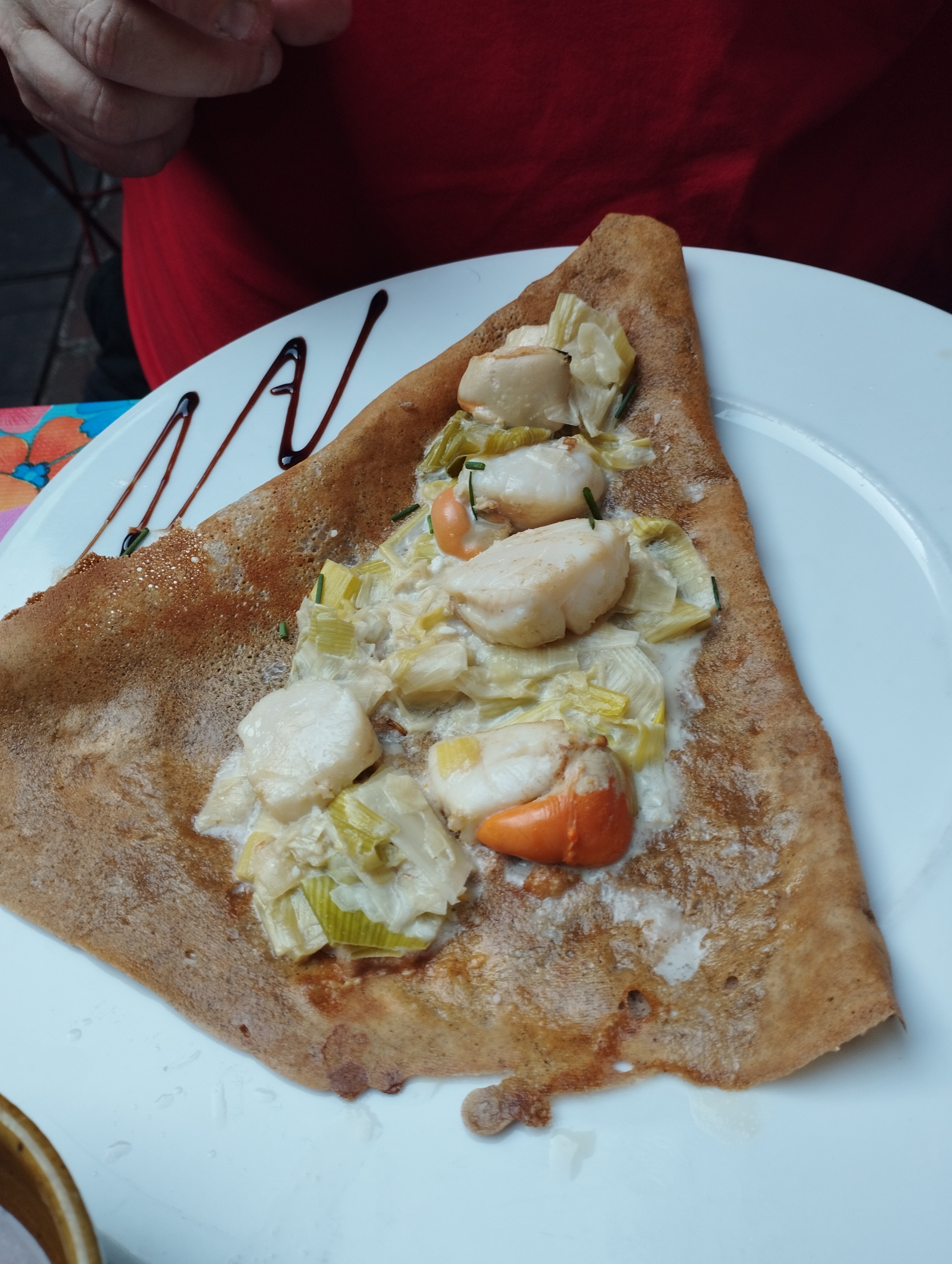 Posté le 19/07/2019 à 20:11"J'ai pris le Menu découverte 16euro, vous avez plusieurs choix, j'ai opté pour la saint Jacques poireaux, excellente avec de VRAIS saint Jacques, la crêpe dessert est bonne, laissez un tips vous aurez le droit a une spécial ;)"