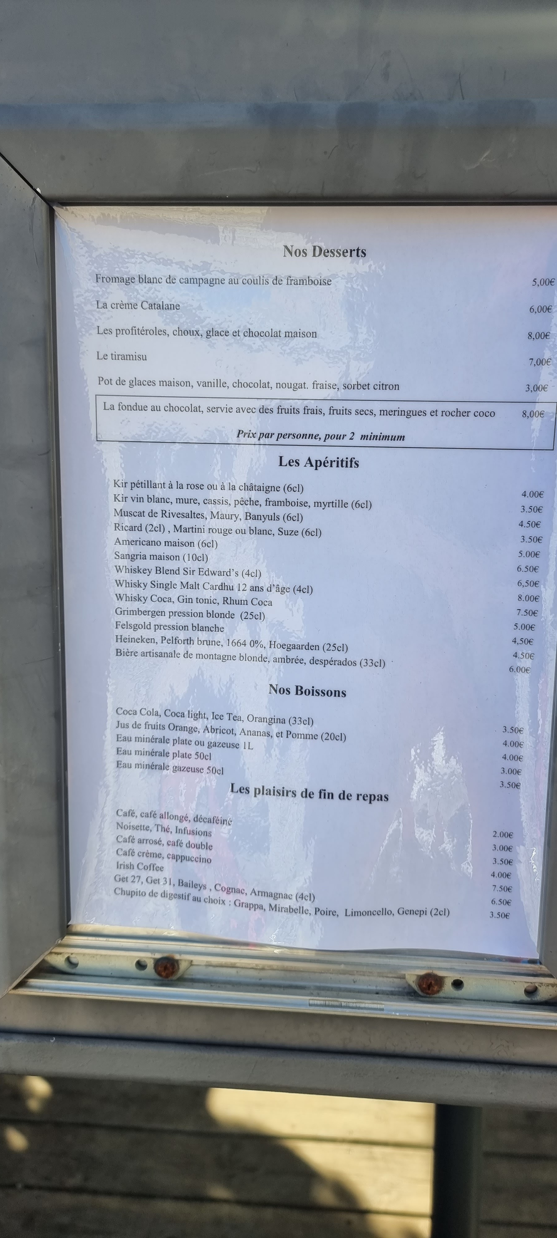 Posté le 31/01/2024 à 19:42"Joli petit restaurant dans le centre de Font Romeu. Les serveurs sont très agréables, l'ambiance est sympa. Un petit bémol sur le temps d'attente des plats (une bonne heure). La fondue savoyarde et la croziflette excellente, rien a redire. Le prix raisonnable. Par contre l'installation pour la raclette laisse un peu a désirer... Une petite bougie pour faire chauffer le fromage n'est pas du tout suffisant, du coup l'accompagnement est froid le temps que le fromage fonde, ça met vraiment beaucoup trop de temps. Pour le dessert, les profiteroles sont très bonnes et copieuses, par contre la fondue de chocolat un peu déçue également. 8€ par personne pour un fond de chocolat tiède voir froid, et quelques fruits découpé... Mais c'était tout de même bon. Nous avons bien mangé dans l'ensemble."
