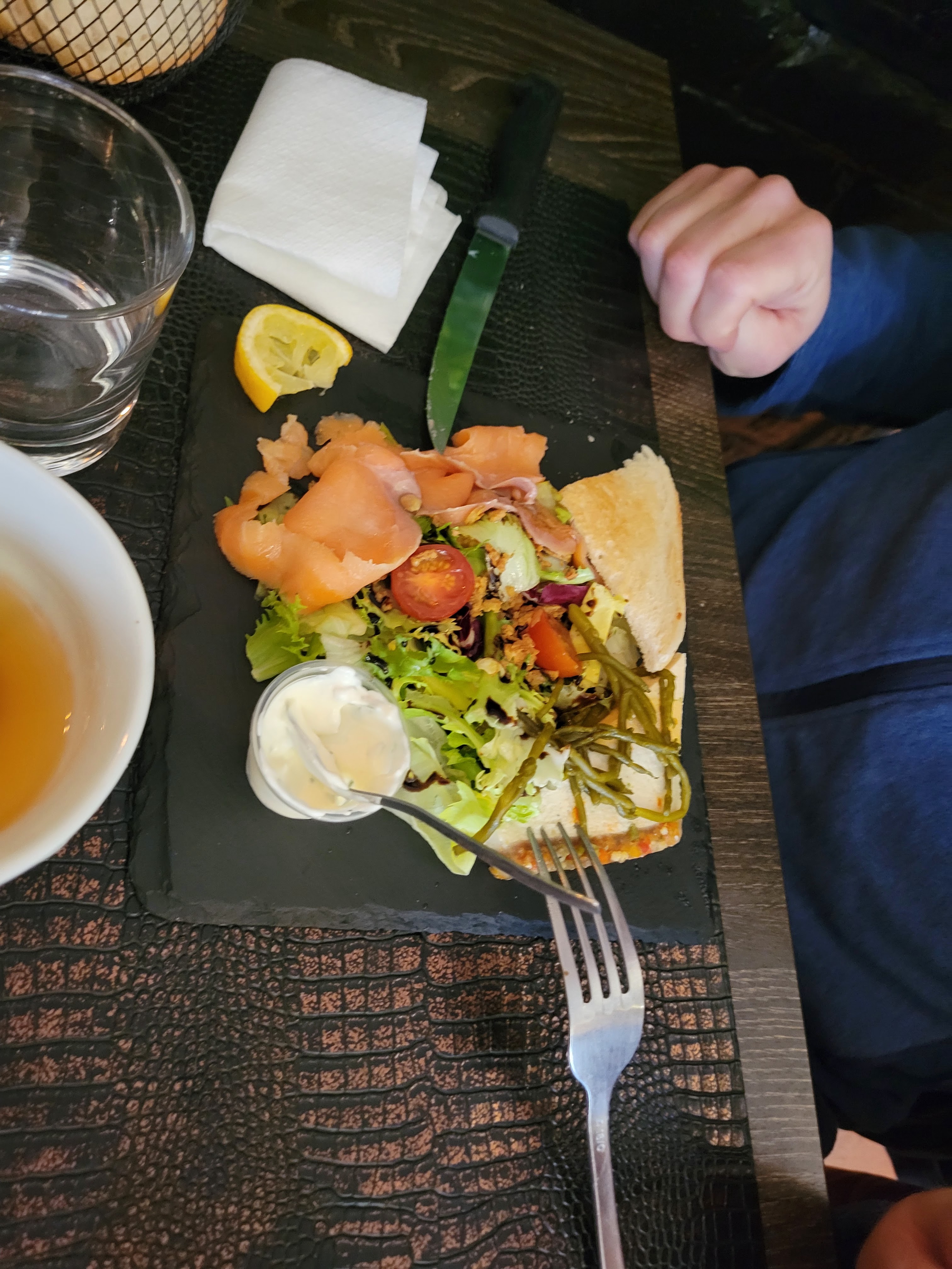 Découverte extrêmement agréable. Nous sommes très bien reçus. Assiette charcuterie fromage assez copieuse. La tartine saumon est excellente. Petit bémol sur le prix des desserts que nous trouvons un peu excessif . Nous recommandons ce restaurant.