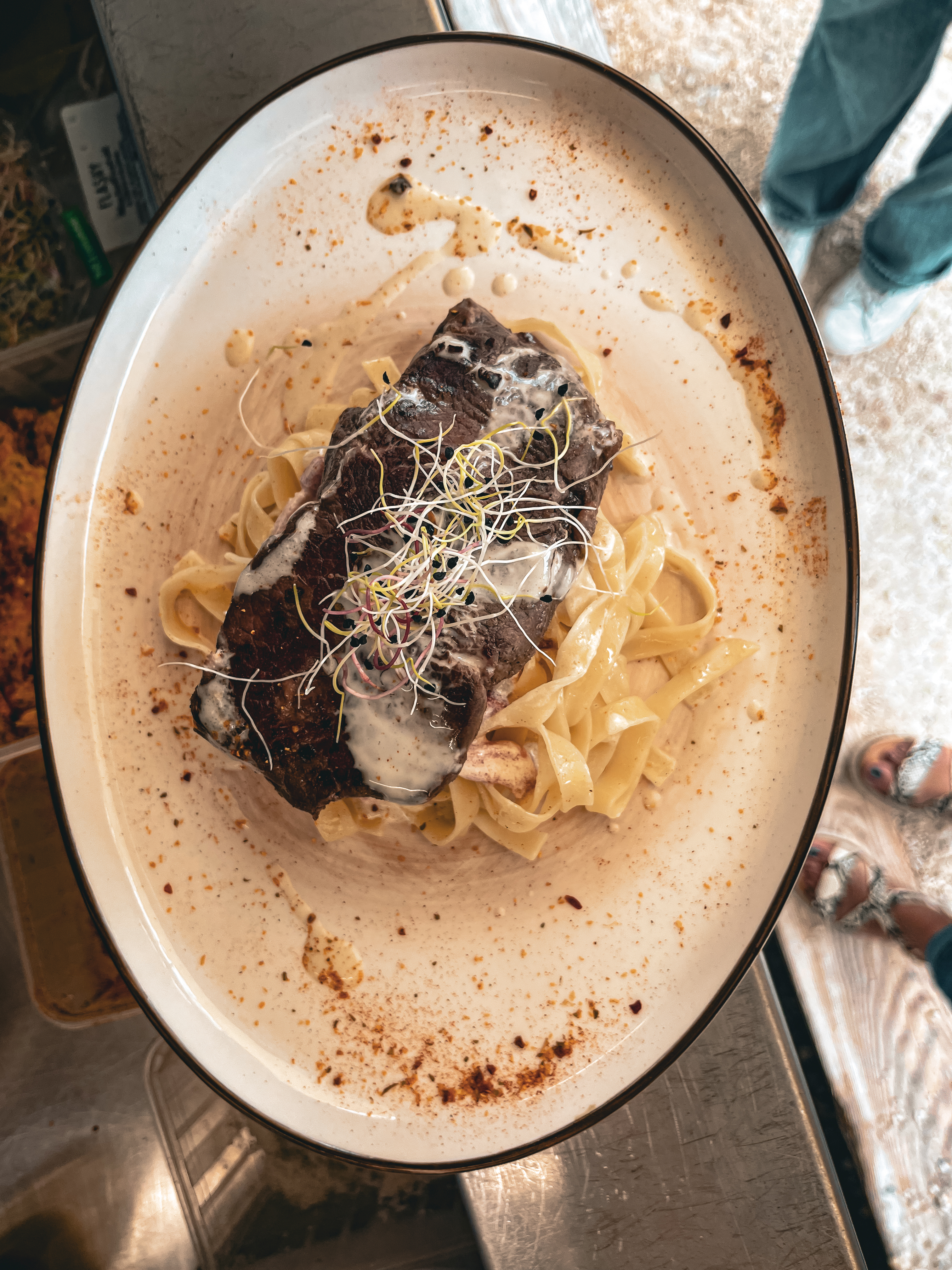 Un peu d'attente, même si le lieu était presque vide. . On avait demandé un lieu noir avec du riz et un faux filet accompagné de tagliatelles. Petit problème, le faux filet est arrivé avec du riz. 😆 Cuisson de viande : demandé saignante, arrivée trop cuite 😒 du coup la viande etait trop dure. Je n ai jamais mangé une viande avec autant de nerfs c'était du chewing-gum. C est bien dommage, pour une première sur ce restaurant.. Après la serveuse est très sympathique, merci Chloé. Guinguette, bien pour boire un verre.