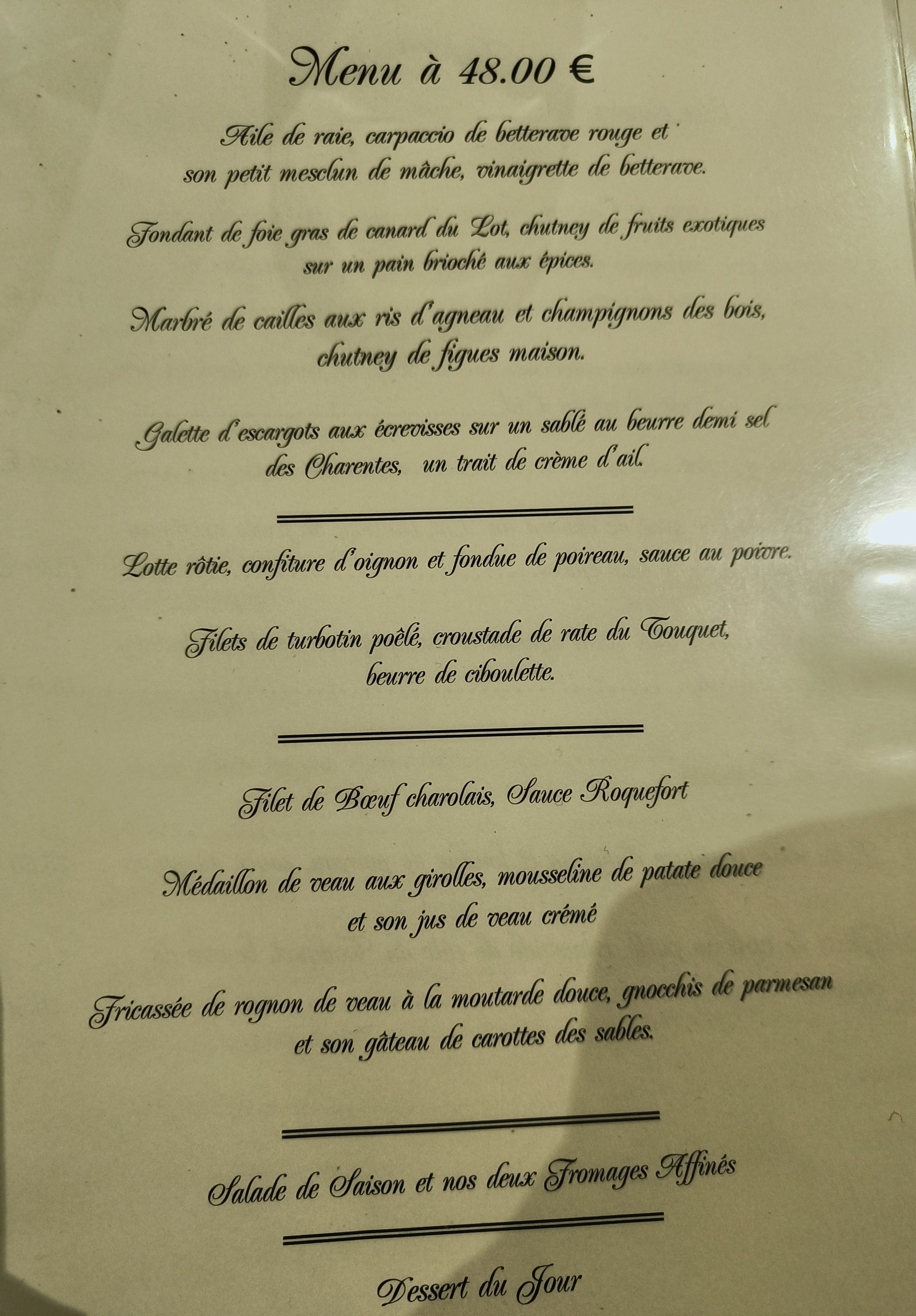 Bon déjeuner. Menu à 36 euros. Très bons plats. Pensez à réserver certains jours il peut y avoir du monde. Nous avons eu de la place sans résa.