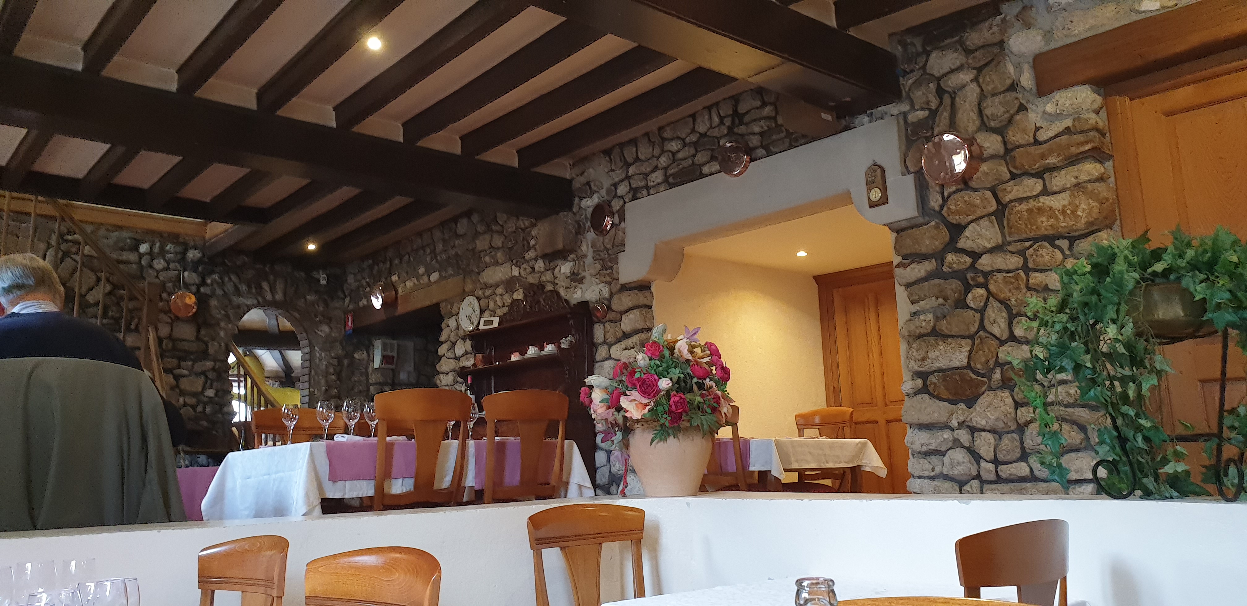 Belle salle aux murs de pierre au centre d'un très joli village. Cuisine extra bonne en qualité et généreuse en quantité. Entrée, principal, salade, fromage et dessert. Du bon vin au choix en 1/2 bouteille (si on veut). Un excellent moment pour démarrer un bel après-midi. Merci