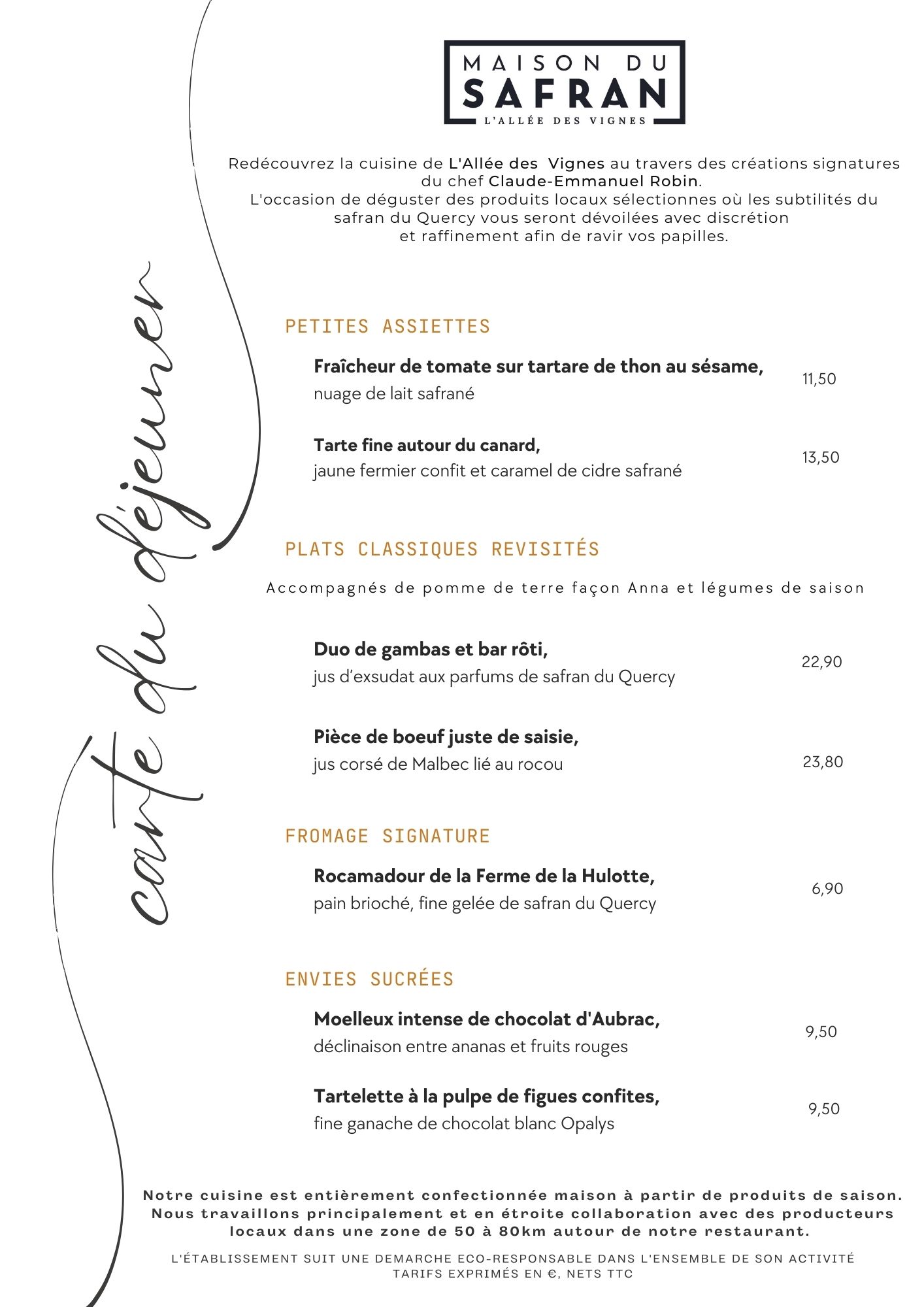 Posté le 02/06/2023 à 17:25" Après un an de grâce (et notre absence les 2 années précédentes en raison de restrictions de voyage en provenance d'Australie), notre retour dans ce fabuleux restaurant a été un grand plaisir pour nous deux après en avoir été de fervents adeptes depuis 2011. La nourriture était exceptionnelle, comme toujours. , la carte des vins une sélection plus limitée mais excellente et le service impeccable. Le changement d'orientation vers l'utilisation du safran local était intrigant, tout comme le changement de format pour se concentrer sur le midi plutôt que sur le soir, du moins hors saison, bien qu'exceptionnellement exécuté. Nous reviendrons à La-Maison-du-Safran pour d'autres produits de saison, pour la plupart locaux, délicieusement préparés et présentés lors d'occasions ultérieures. C'est un plaisir de vous revoir, rajeunis après un an de pause, Evgenia et Claude-Emmanuel. "