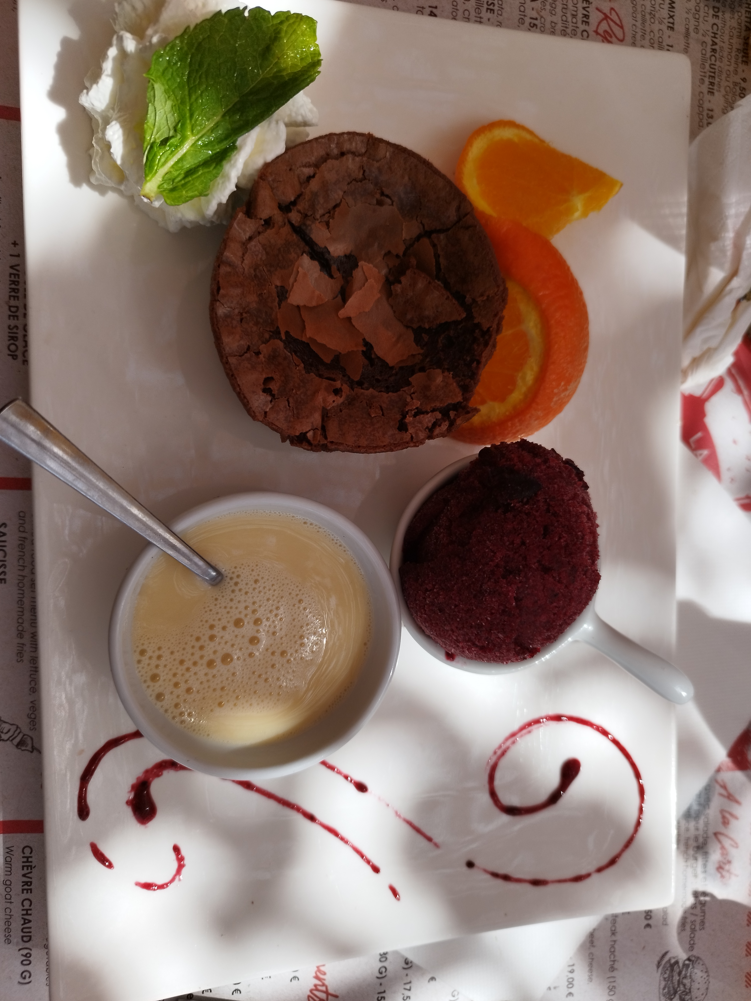 Un accueil agréable un service très convivial et rapide les plats identiques à l'attendu la cuisson du magret impeccable le café gourmand très (trop) généreux... aucune fausse note (sauf un peu les moustiques) je recommande vivement 👍🏻