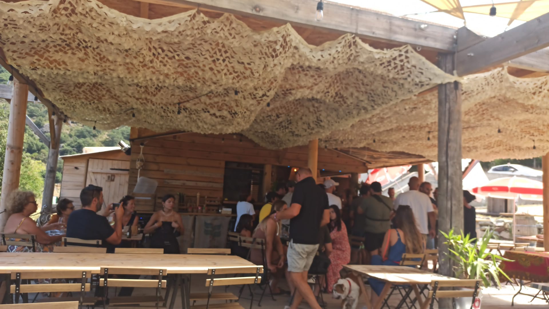 Un bar en bois en pleine nature, un restaurant avec vue montagne et une ambiance très conviviale : terrain de pétanque et chants à la guitare entre copains